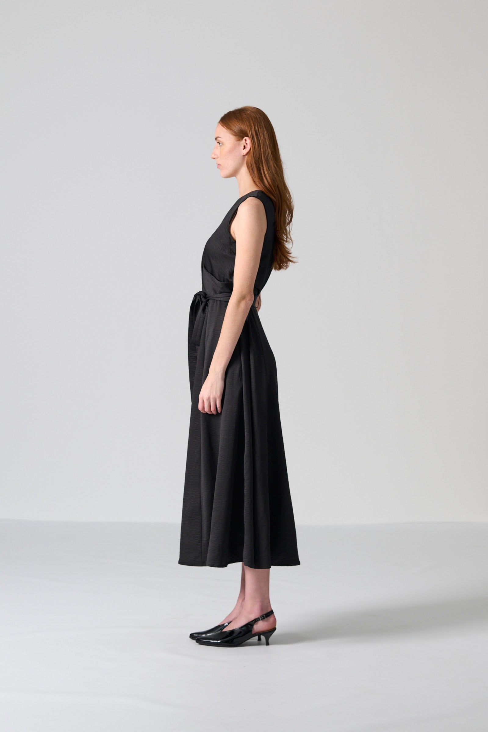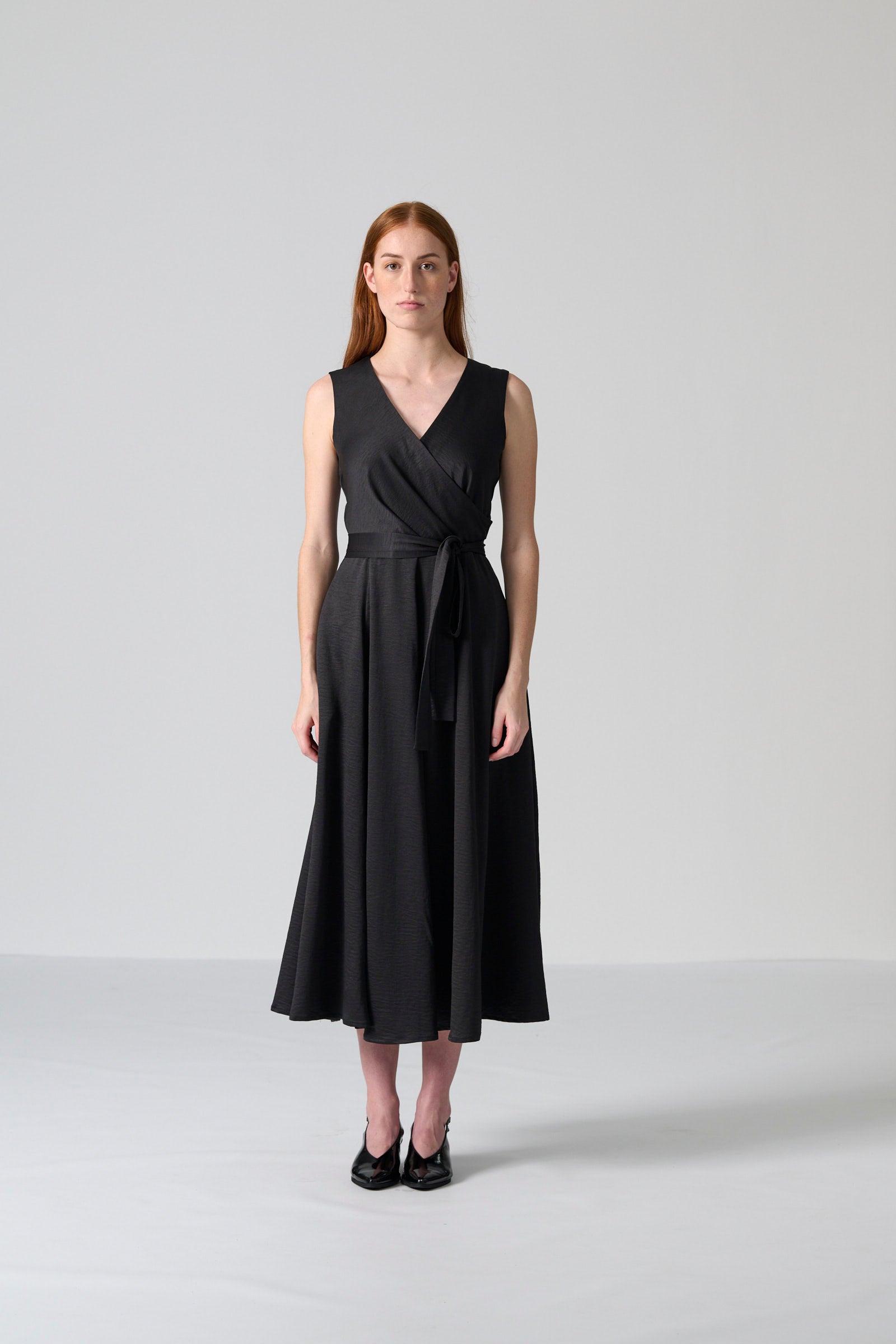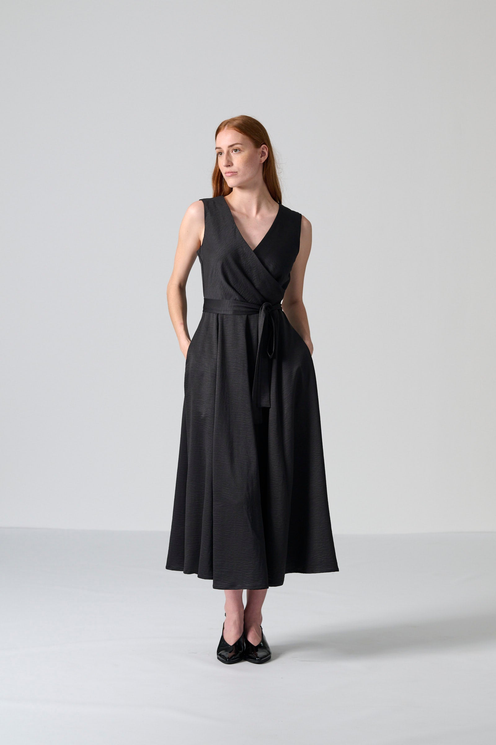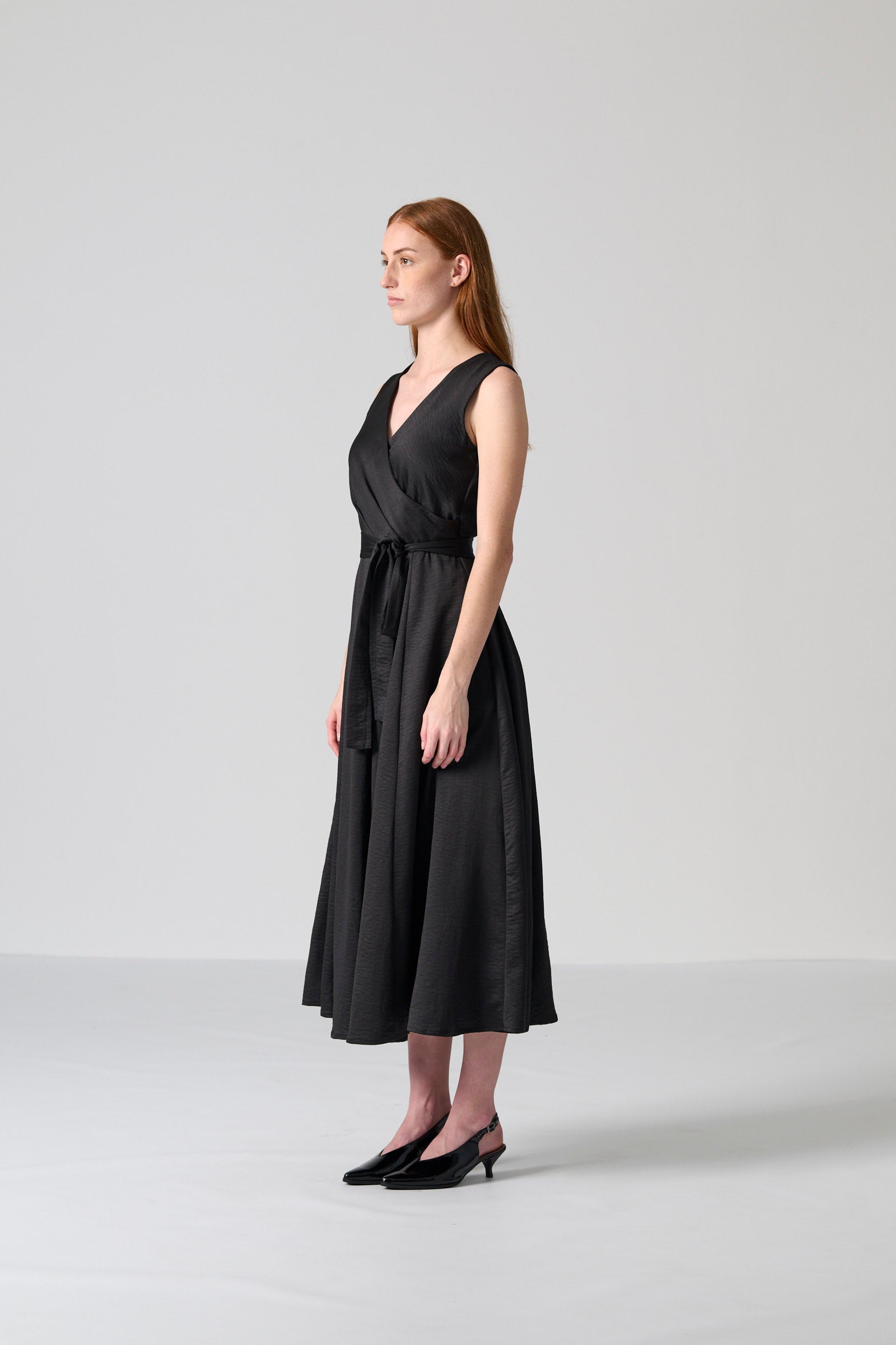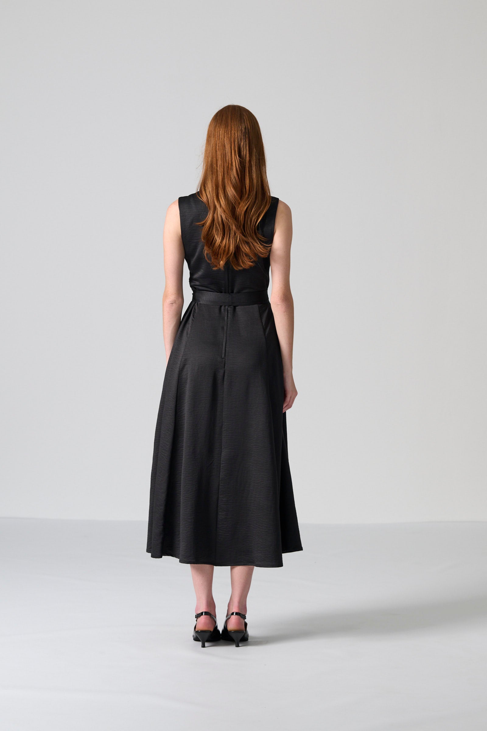 The Donna dress in black satin offers timeless elegance with a refined, feminine silhouette. Made from 100% polyester satin, this mid-length dress features a sleeveless wrap bodice that creates a flattering neckline and a centre-back zip for a smooth, streamlined fit. The full skirt adds graceful movement, while the self-tie belt allows you to shape the waist to your preference.