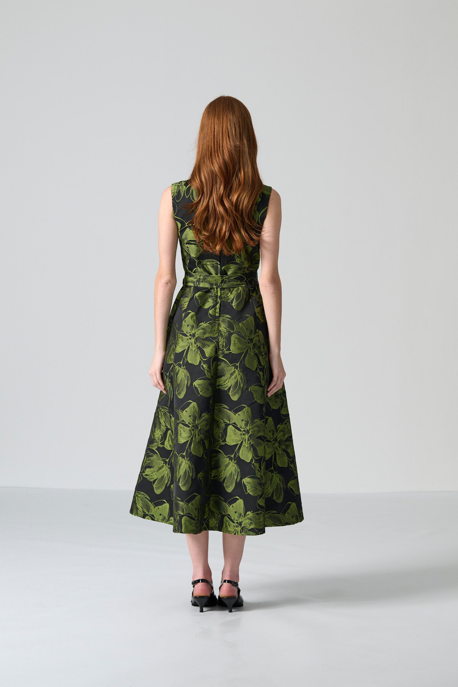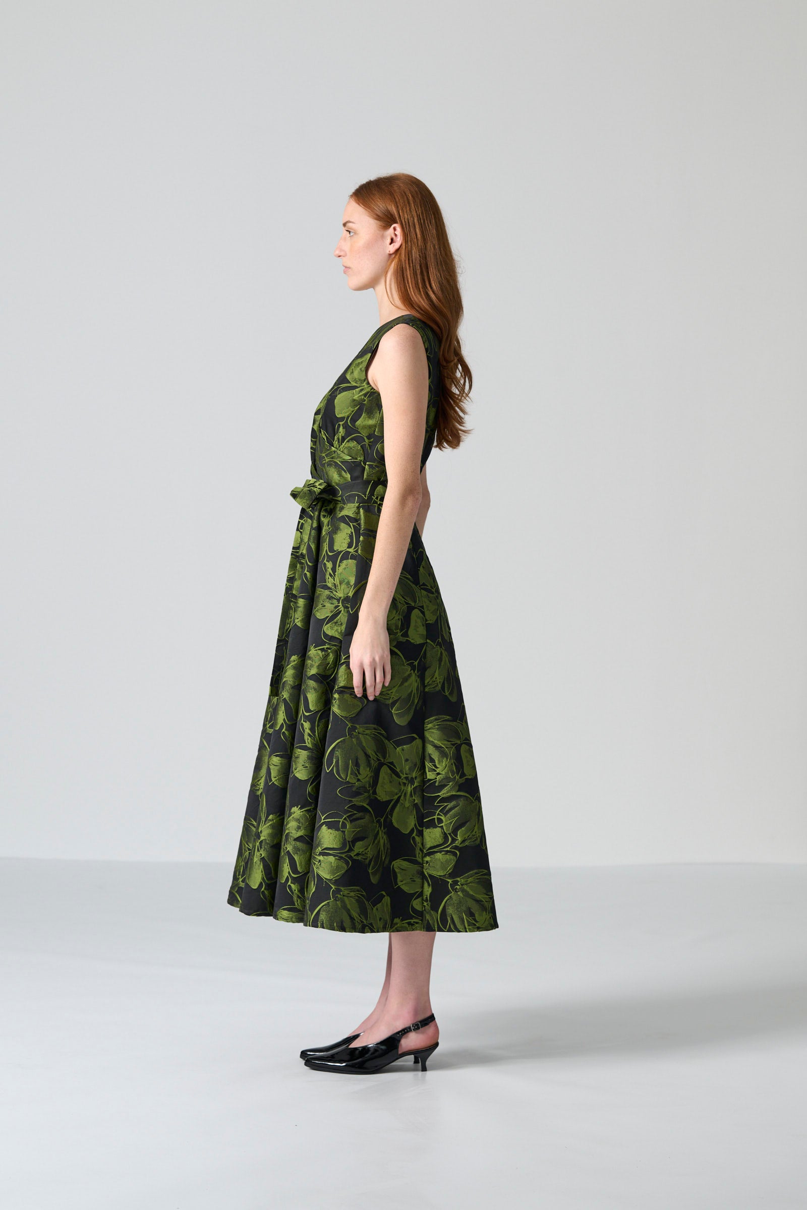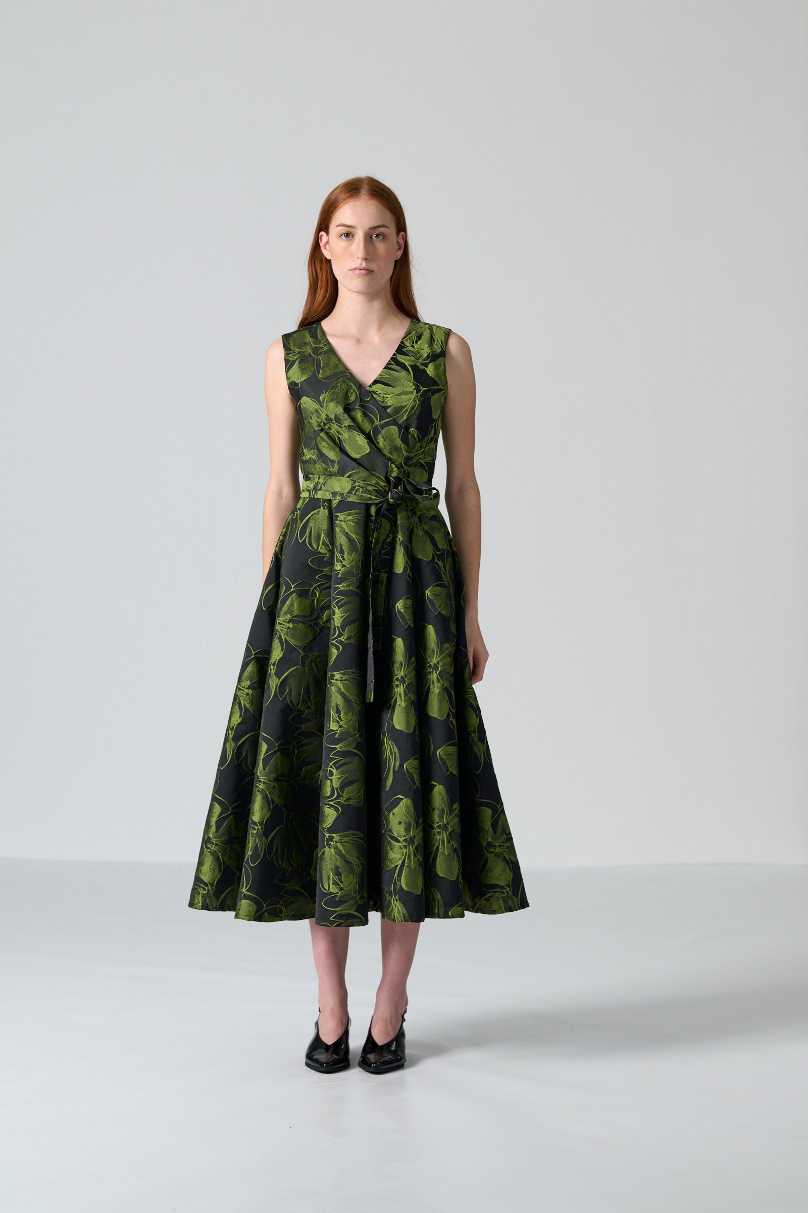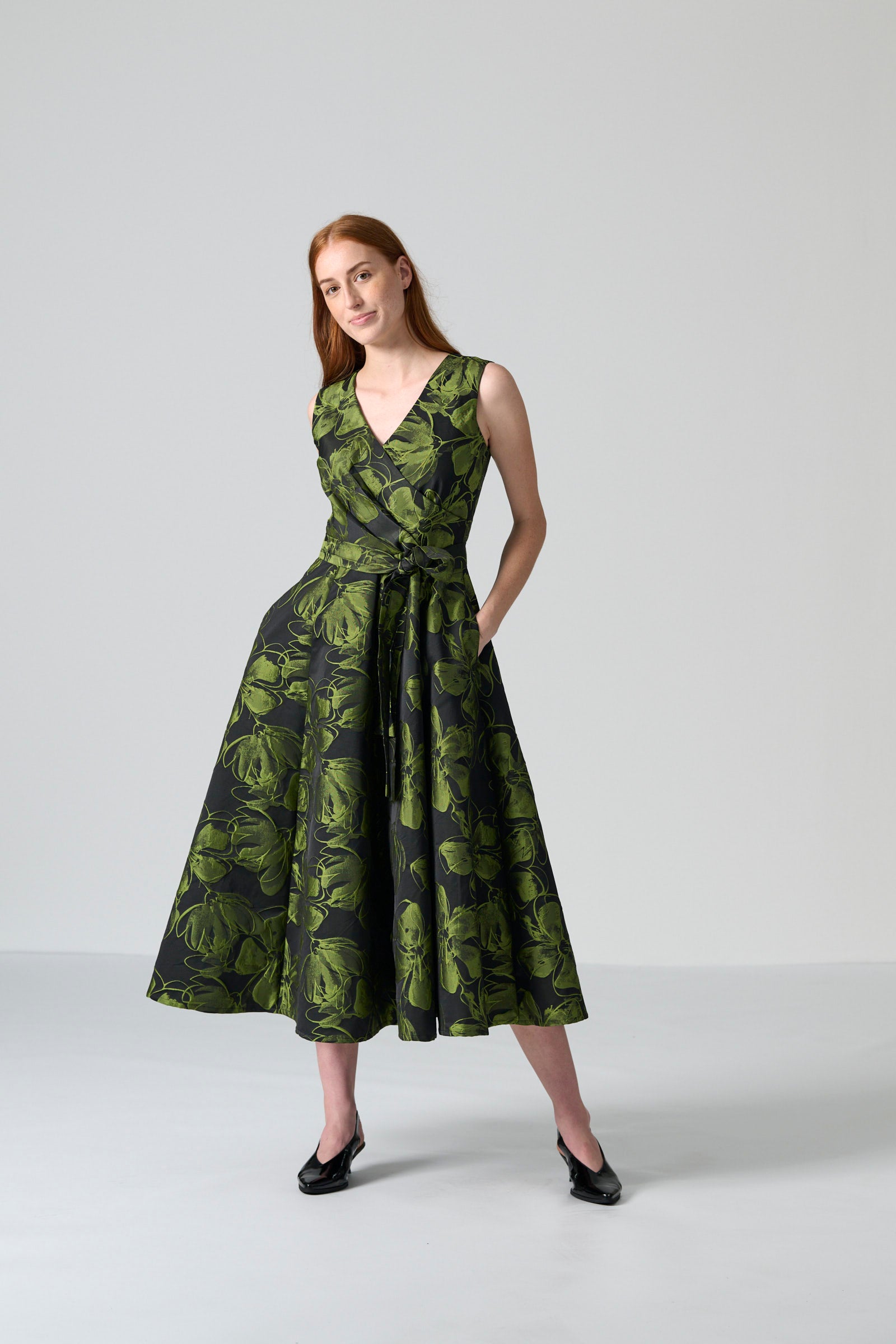 The Donna dress in chartreuse and black floral brocade brings vibrant elegance to any occasion. With its sleeveless V-neck wrap bodice, it flatters the figure while offering effortless sophistication. The tie belt allows for adjustable shaping, and the full mid-length skirt flows gracefully with every step. Side entry pockets add practical functionality, while the centre back zip ensures a smooth, polished finish.