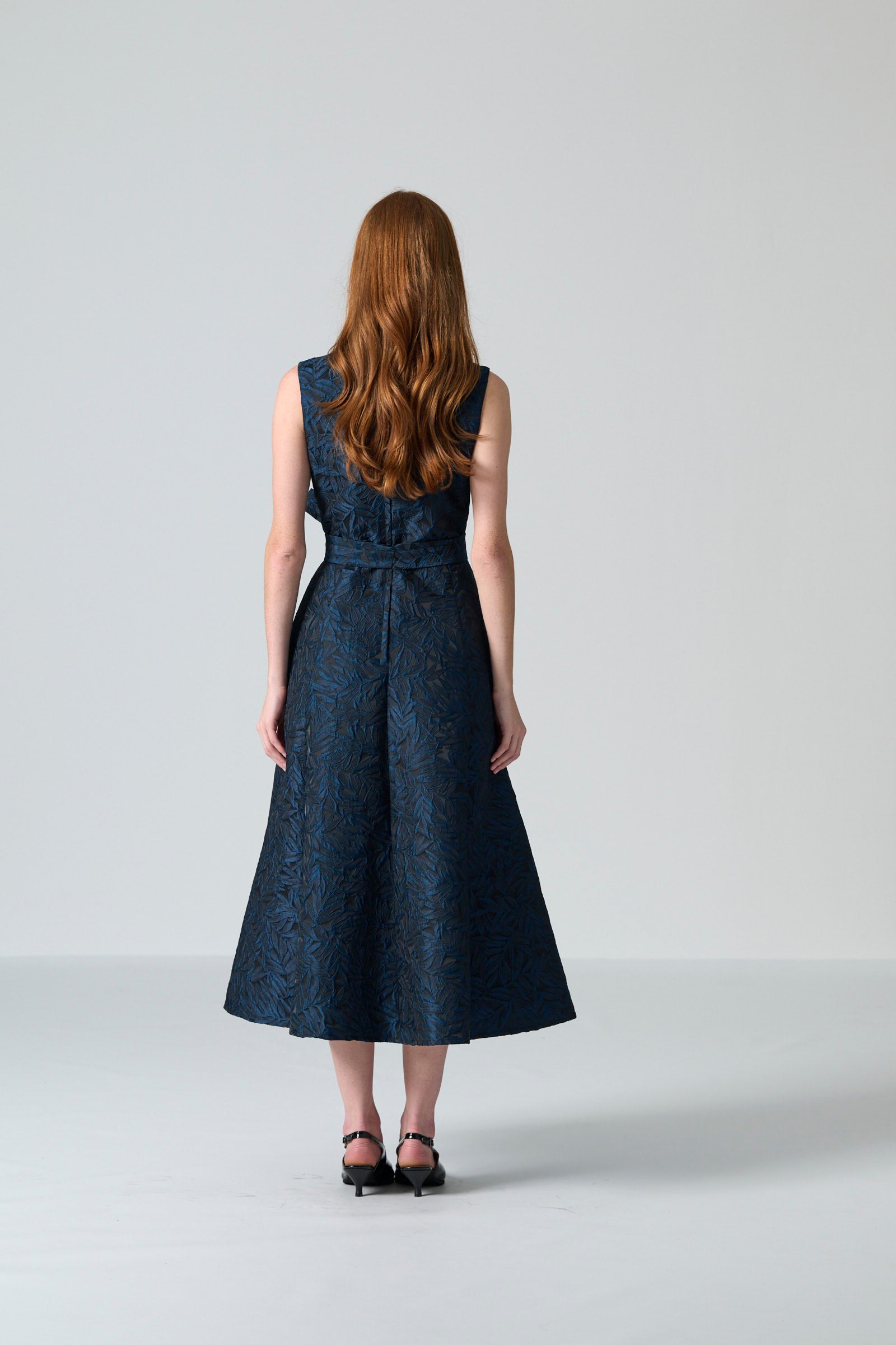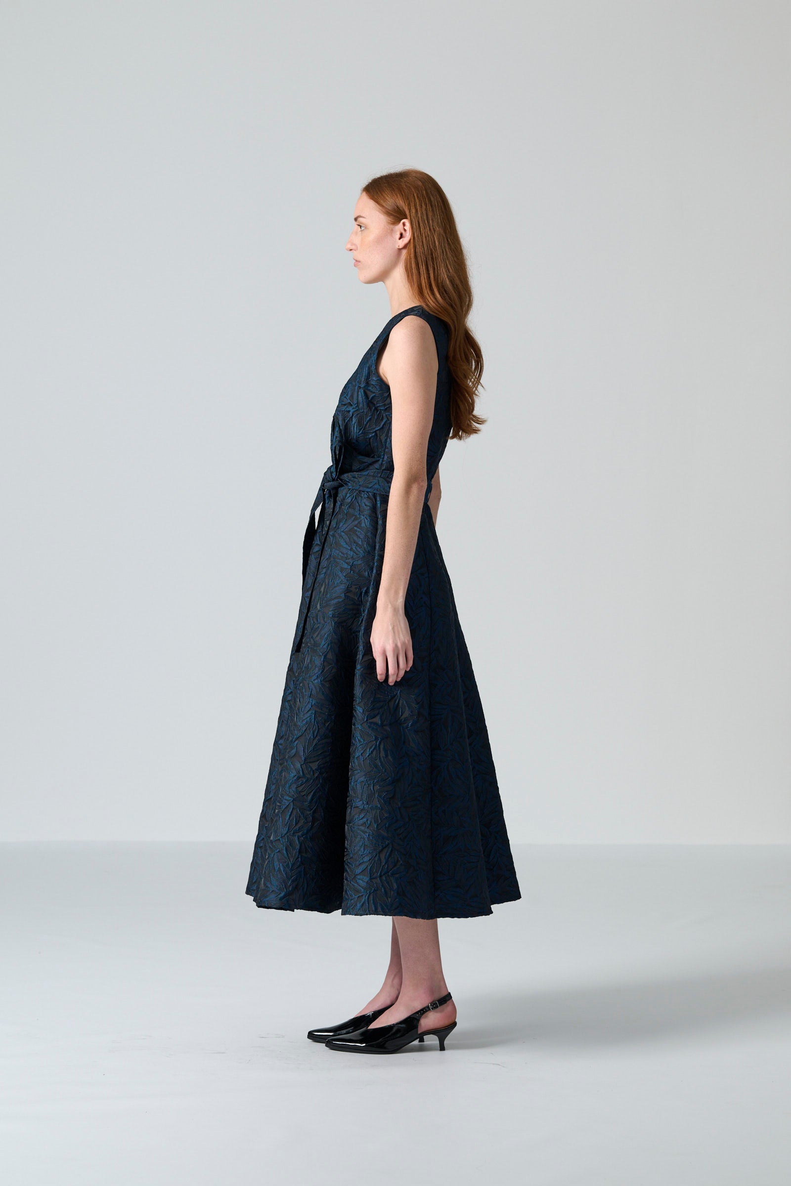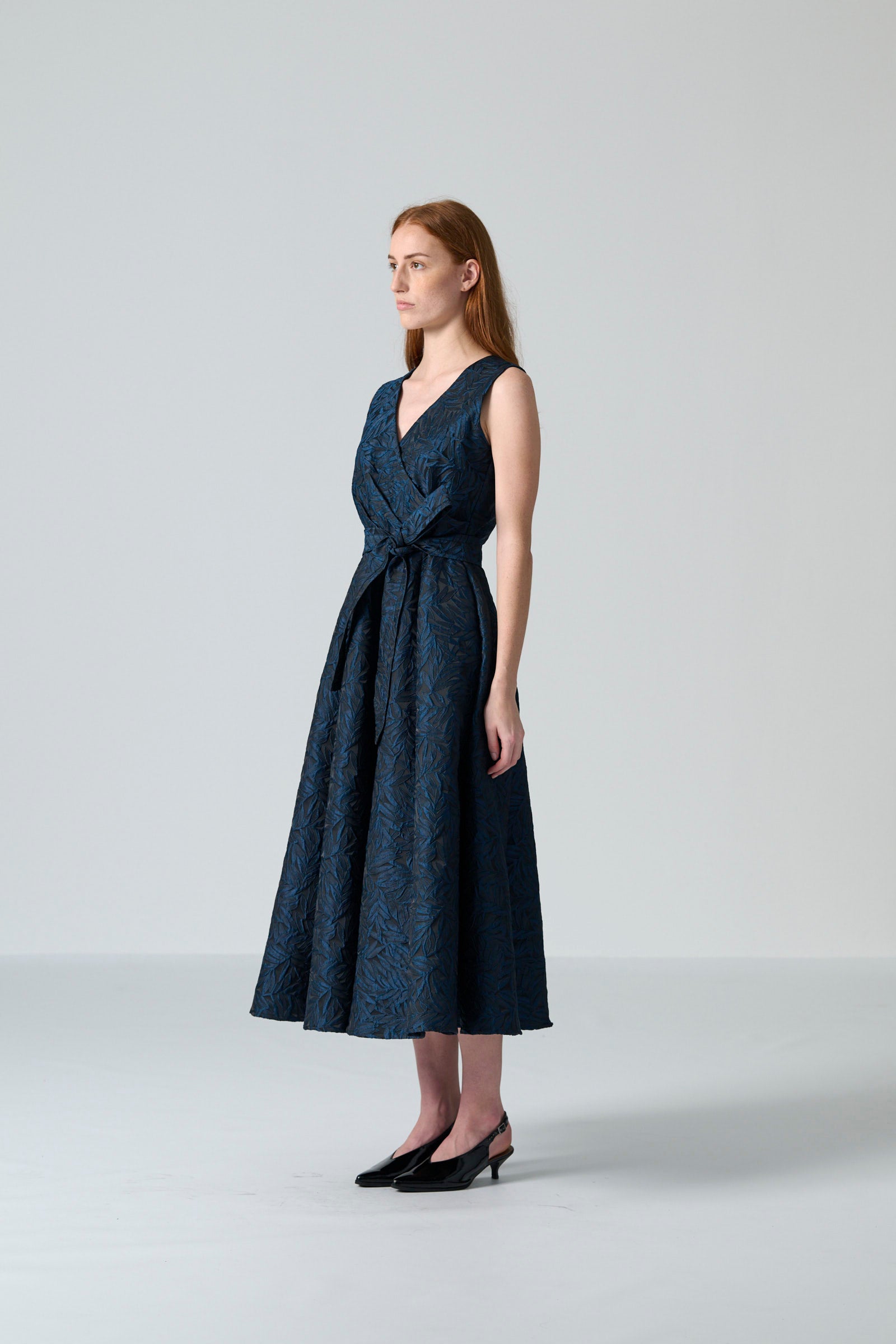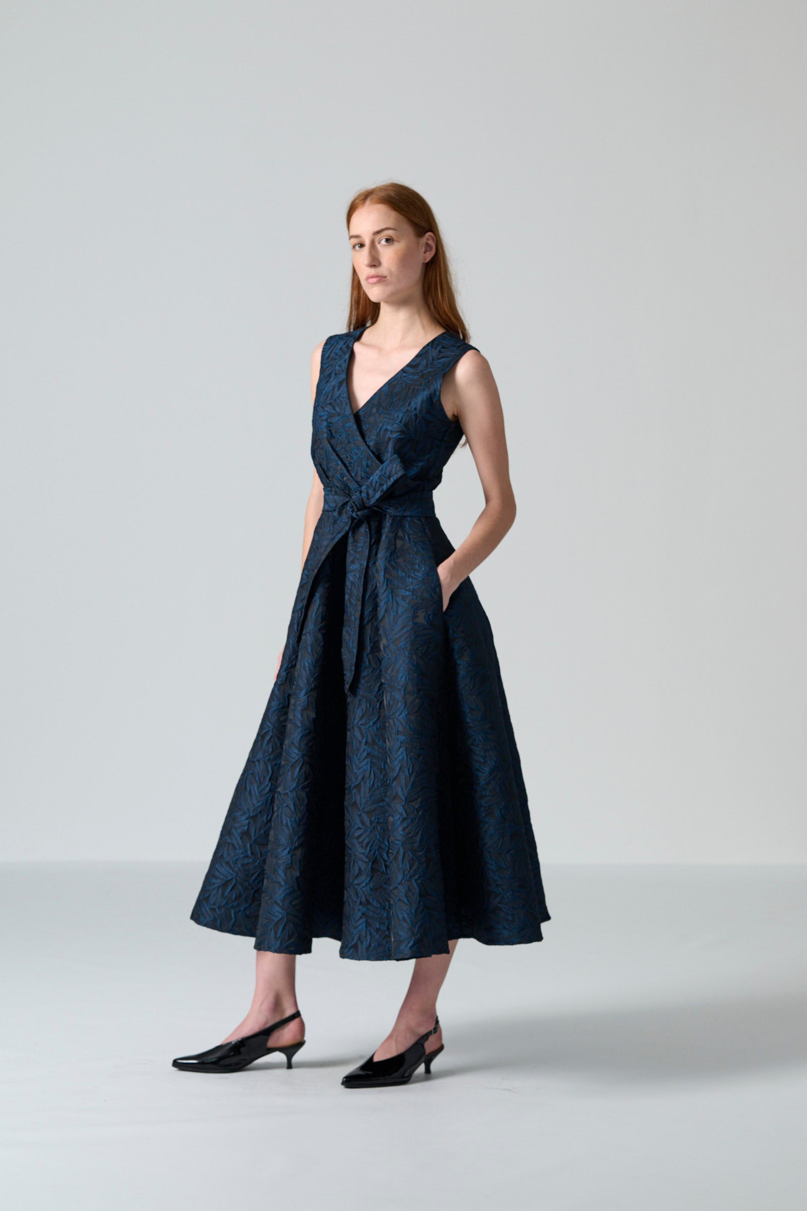 The Donna dress in navy and black leaf brocade offers timeless elegance with a touch of drama. Featuring a sleeveless V-neck wrap bodice, it flatters the figure while maintaining effortless sophistication. The tie belt allows for adjustable shaping, and the full mid-length skirt moves gracefully with every step. Side entry pockets provide practical functionality, and a centre back zip ensures a smooth, clean finish.