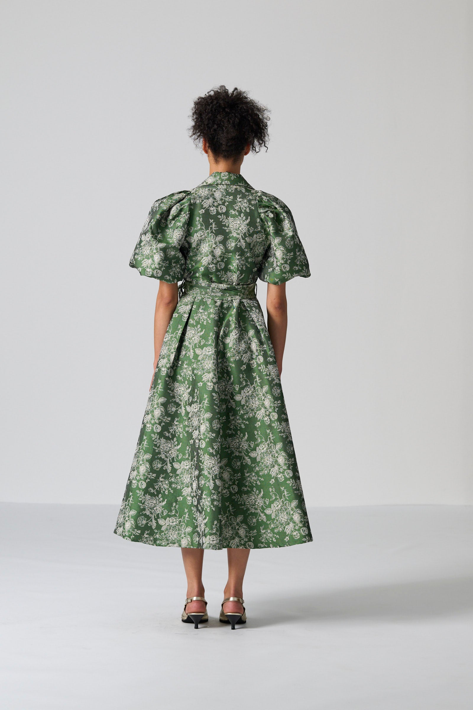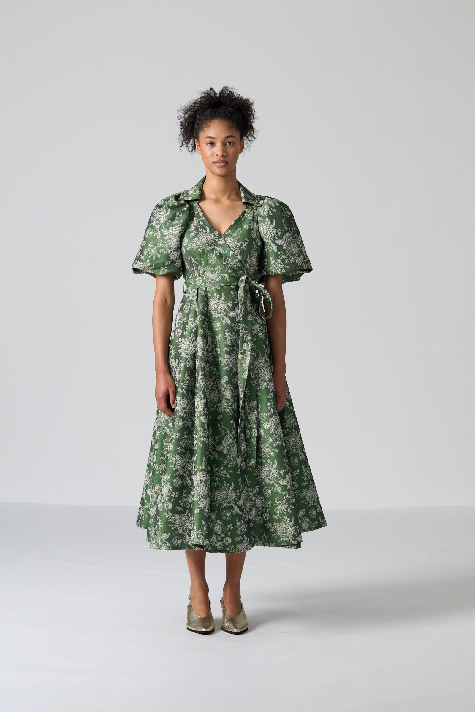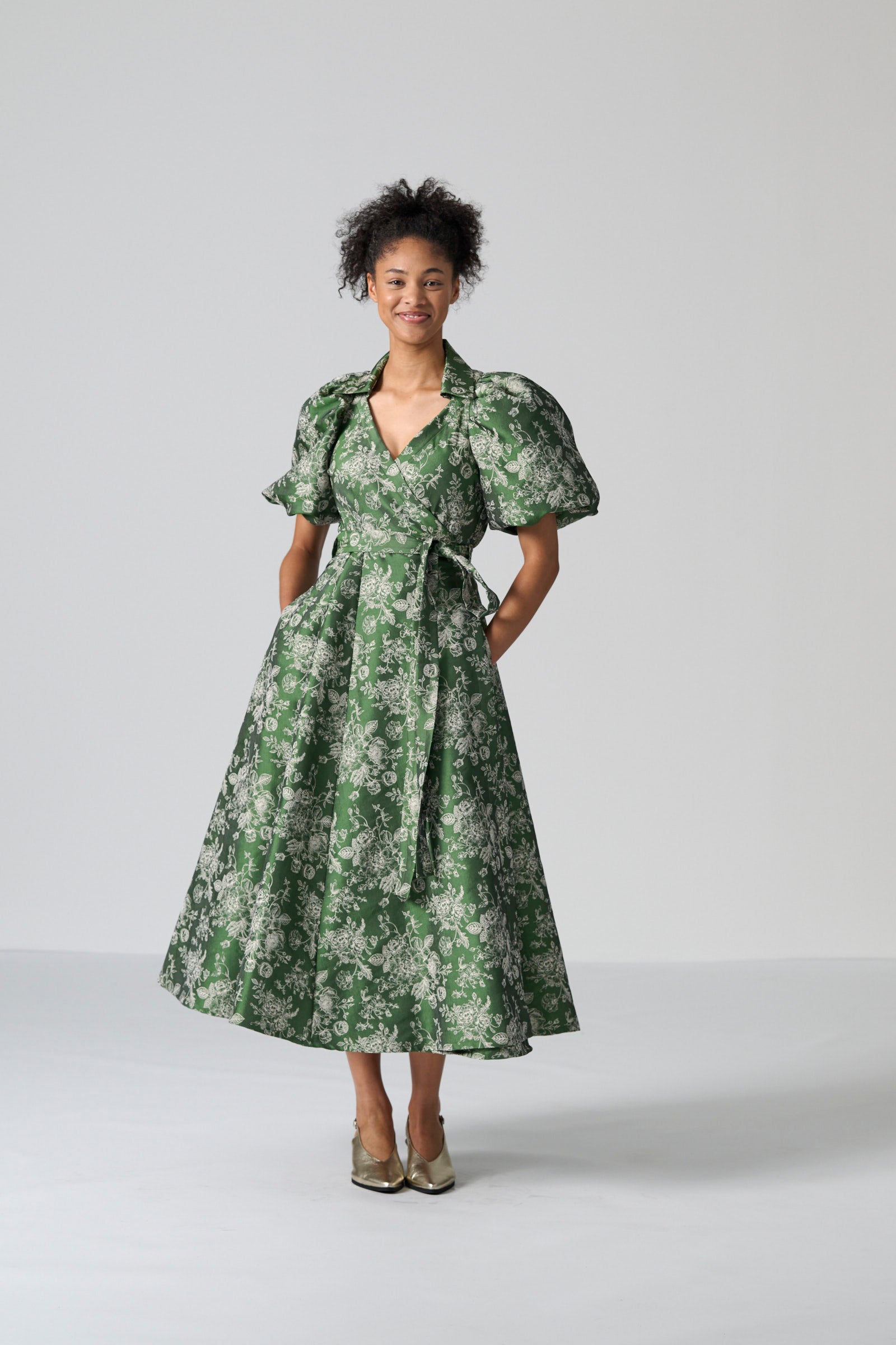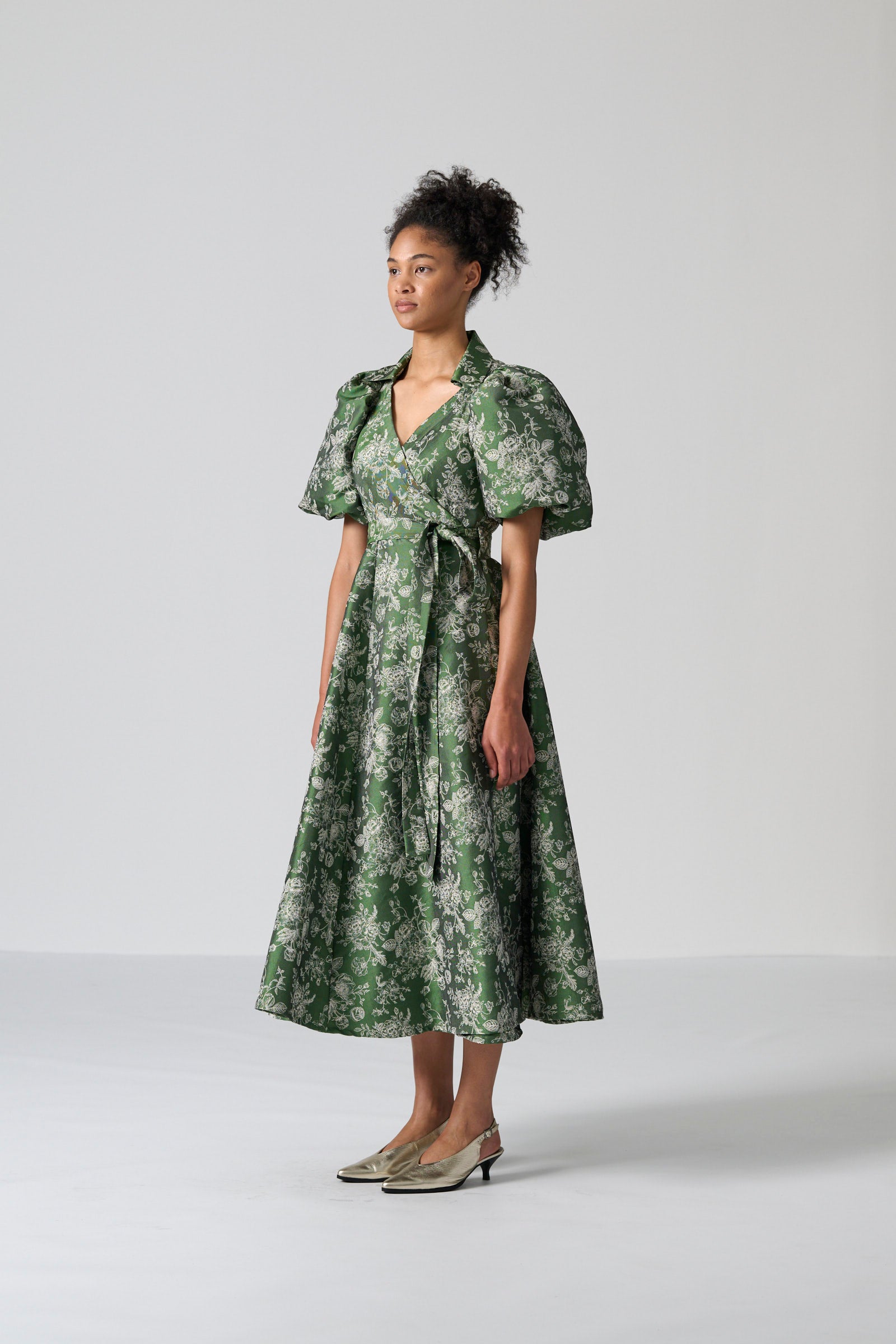 The Essenwood dress in olive and cream brocade blends feminine elegance with a beautifully structured silhouette. Crafted from 100% polyester brocade, this midi-length wrap dress features a refined one-piece collar and voluminous puff sleeves that add soft drama while maintaining a timeless, tailored feel. The pleated skirt creates graceful movement, and the wrap design allows you to shape the waist to your preference.