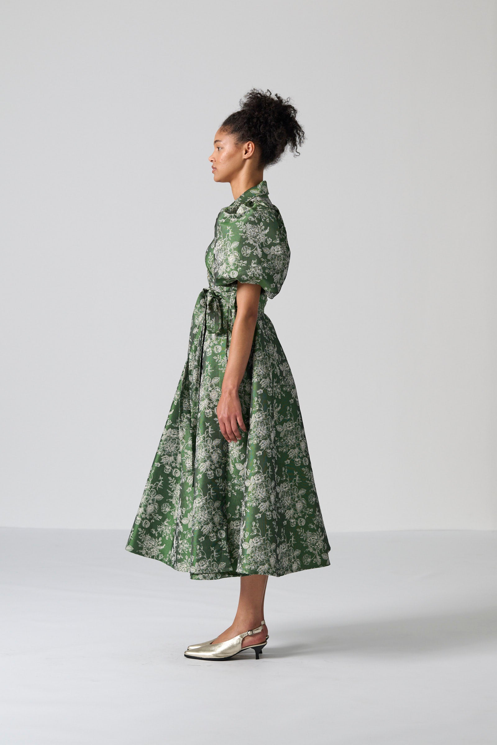Side-entry pockets add everyday practicality, making the Essenwood dress a versatile choice for both daytime occasions and evening events. The olive and cream brocade offers rich texture and subtle sheen, bringing depth and sophistication to this standout piece.