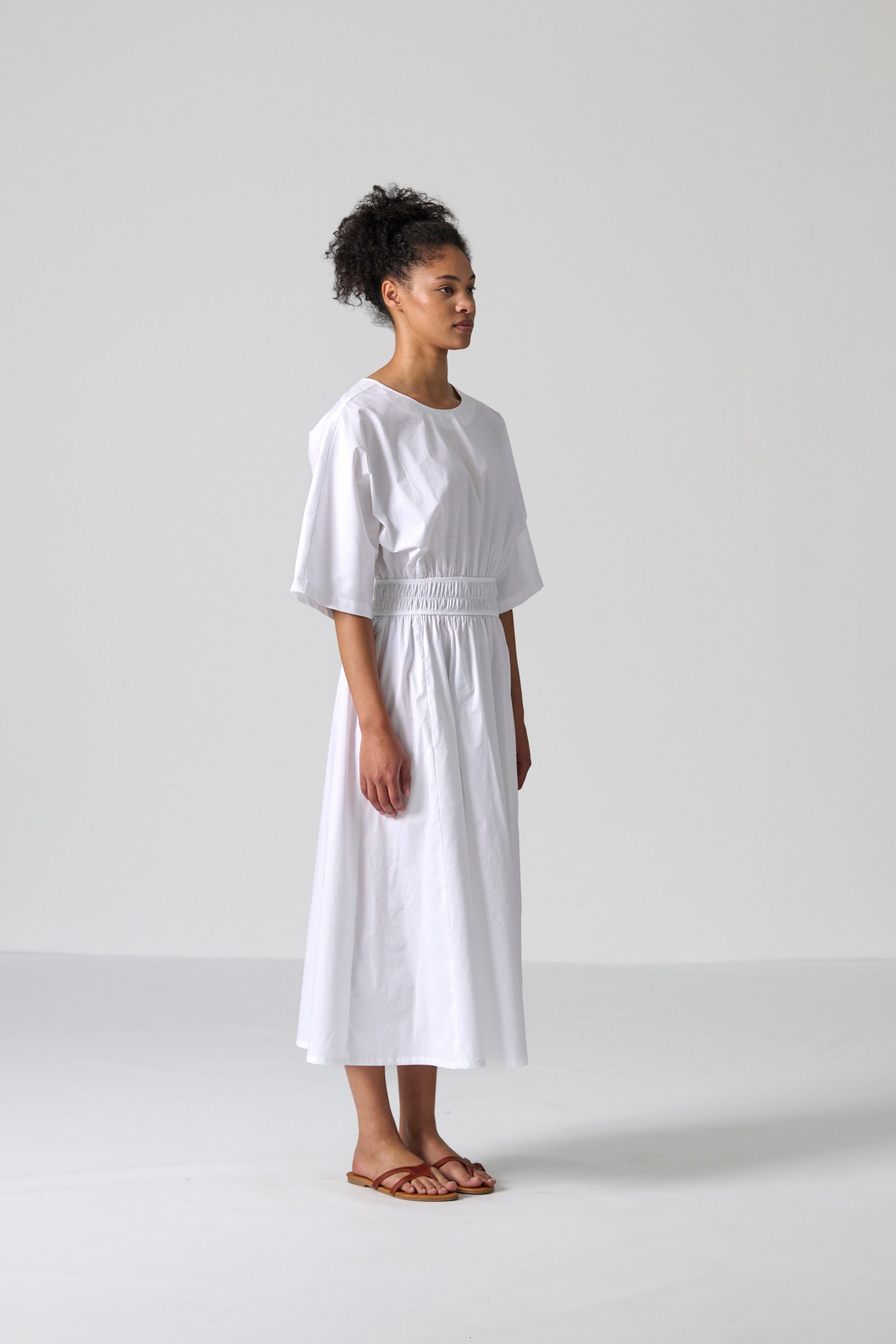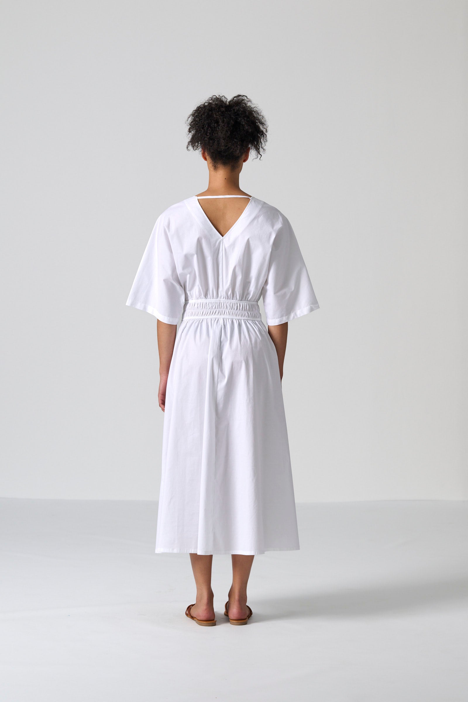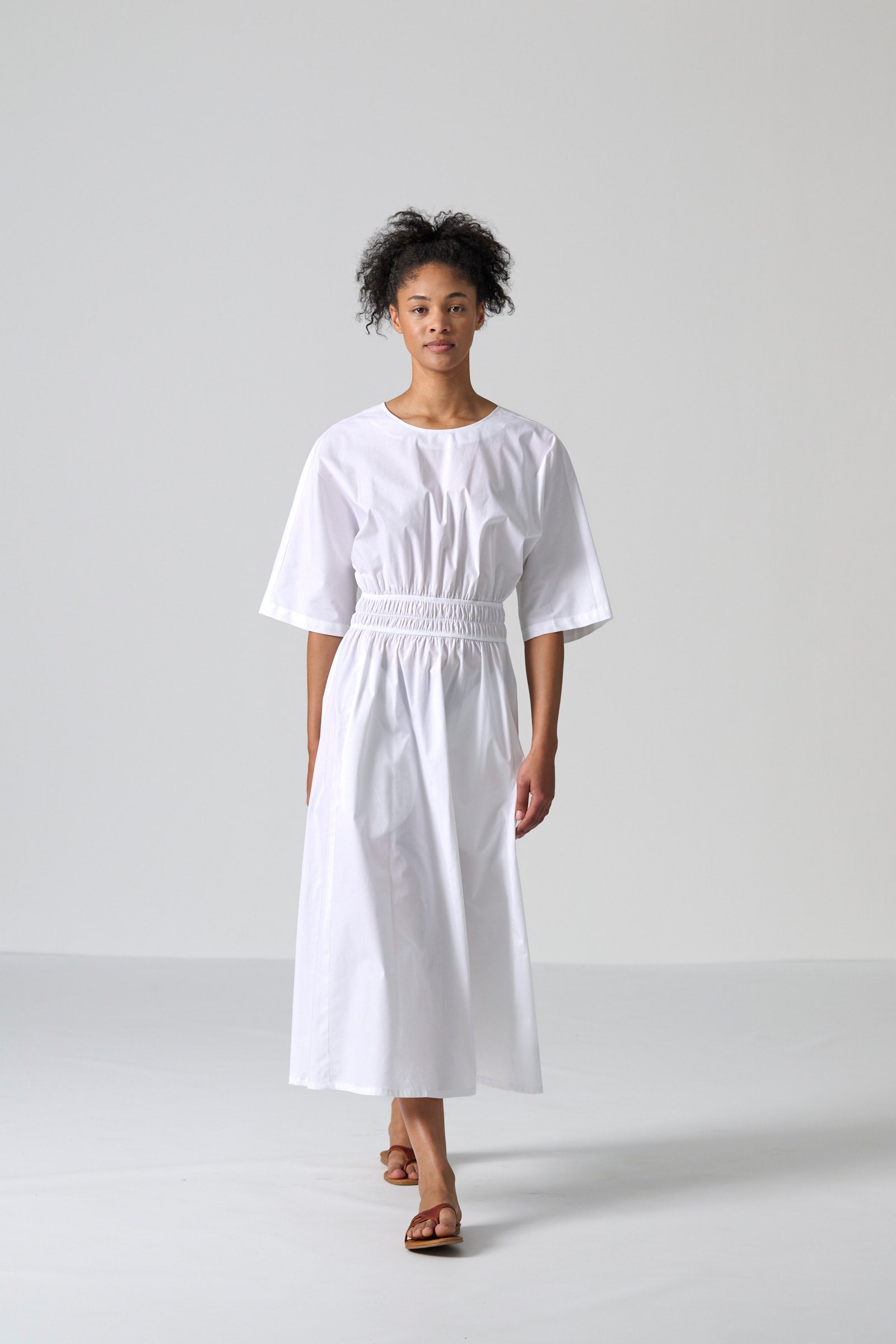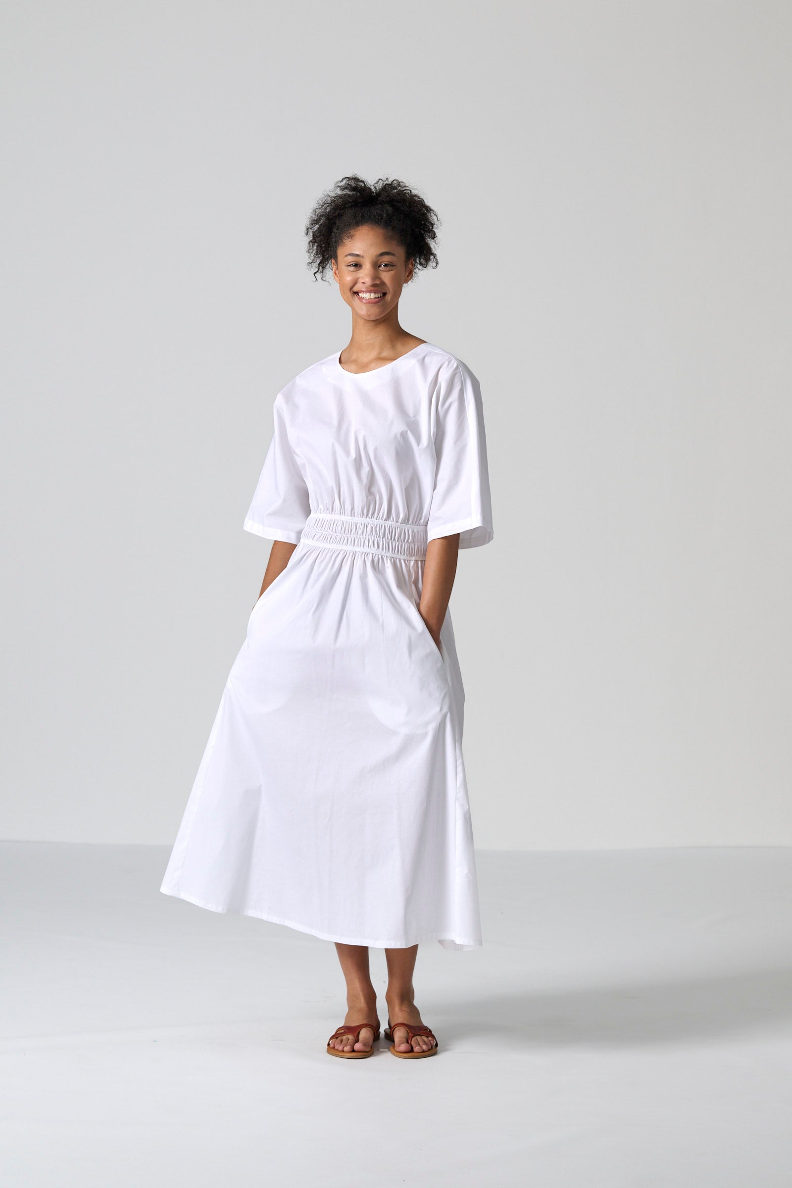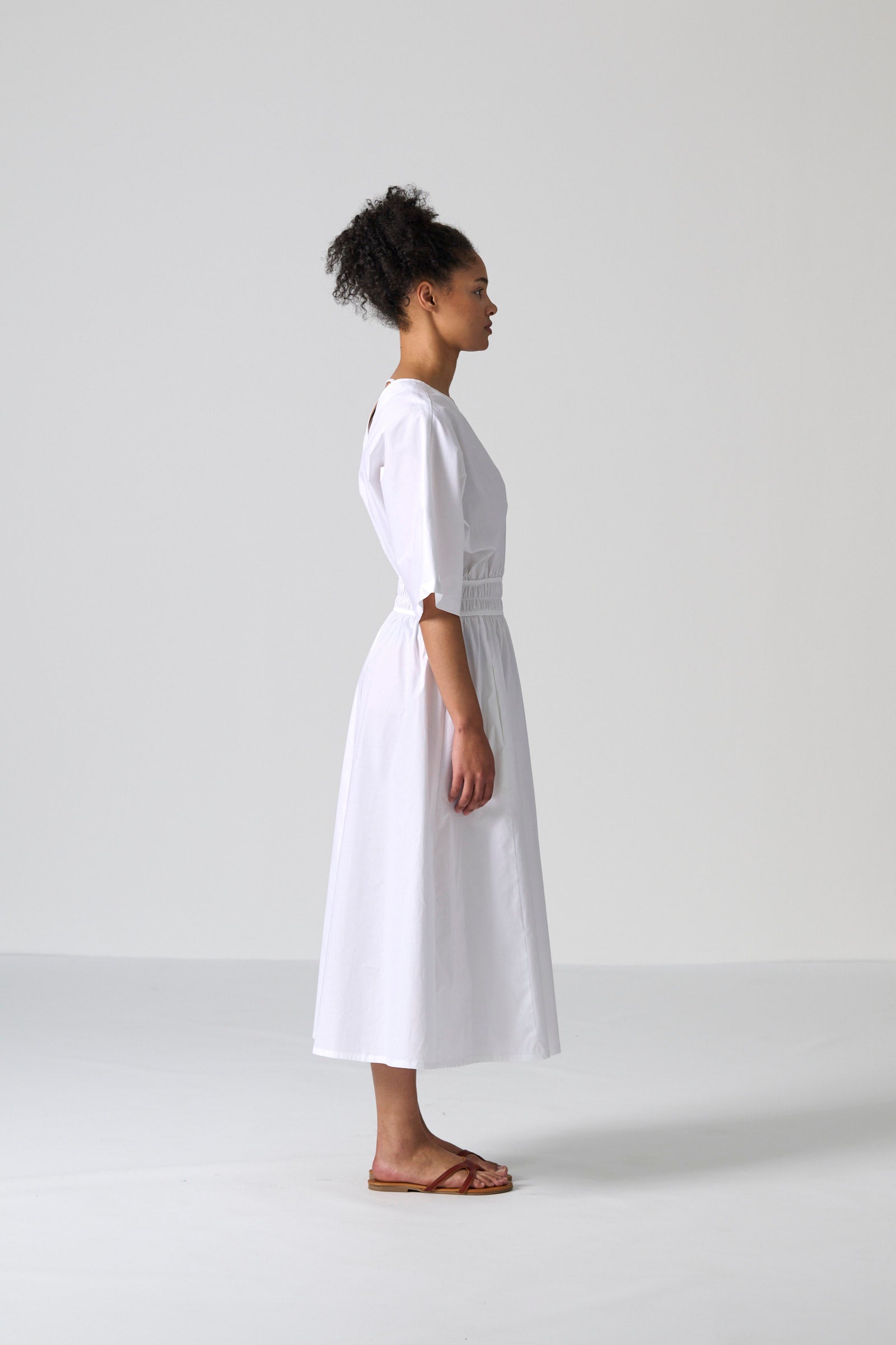 Timeless and refined, the Leena dress in crisp white cotton poplin offers a fresh, modern take on everyday ease. Its round neckline, V back and grown-on sleeves balance simplicity with detail, while the shirred waistline creates a flattering shape. The full skirt and side entry pockets lend practicality and relaxed grace.