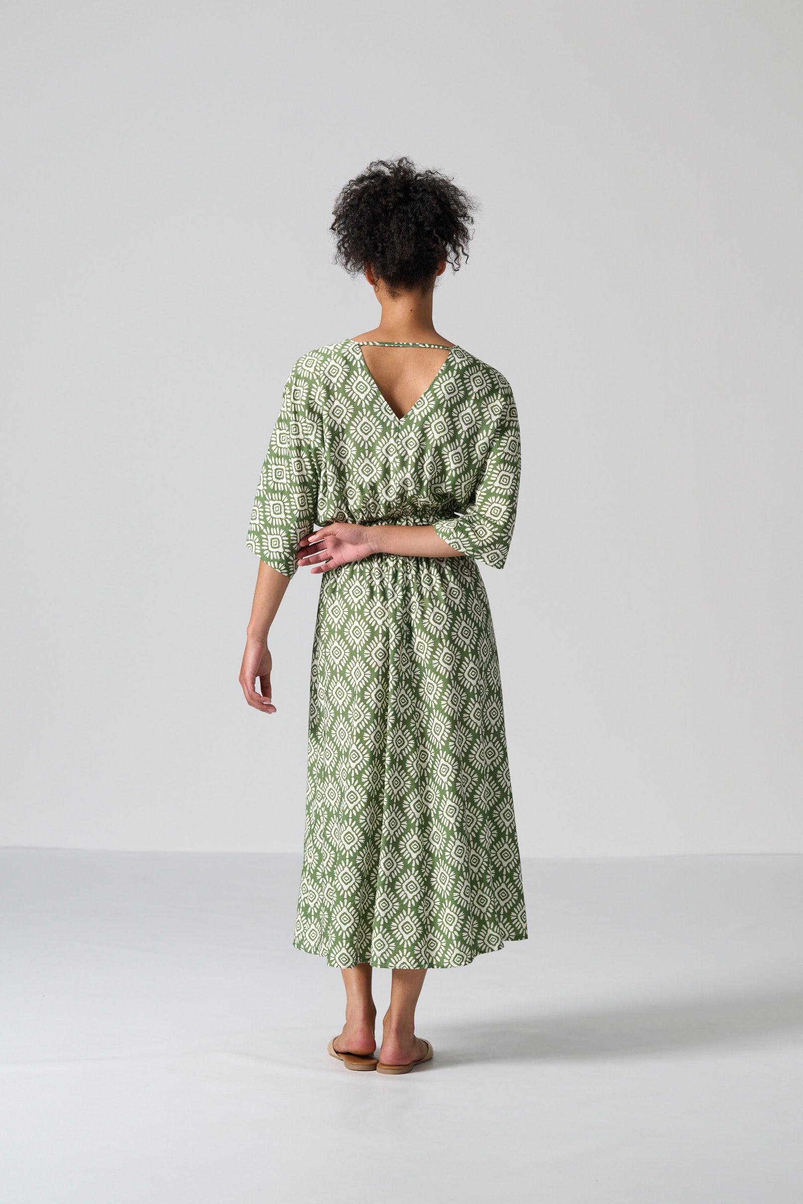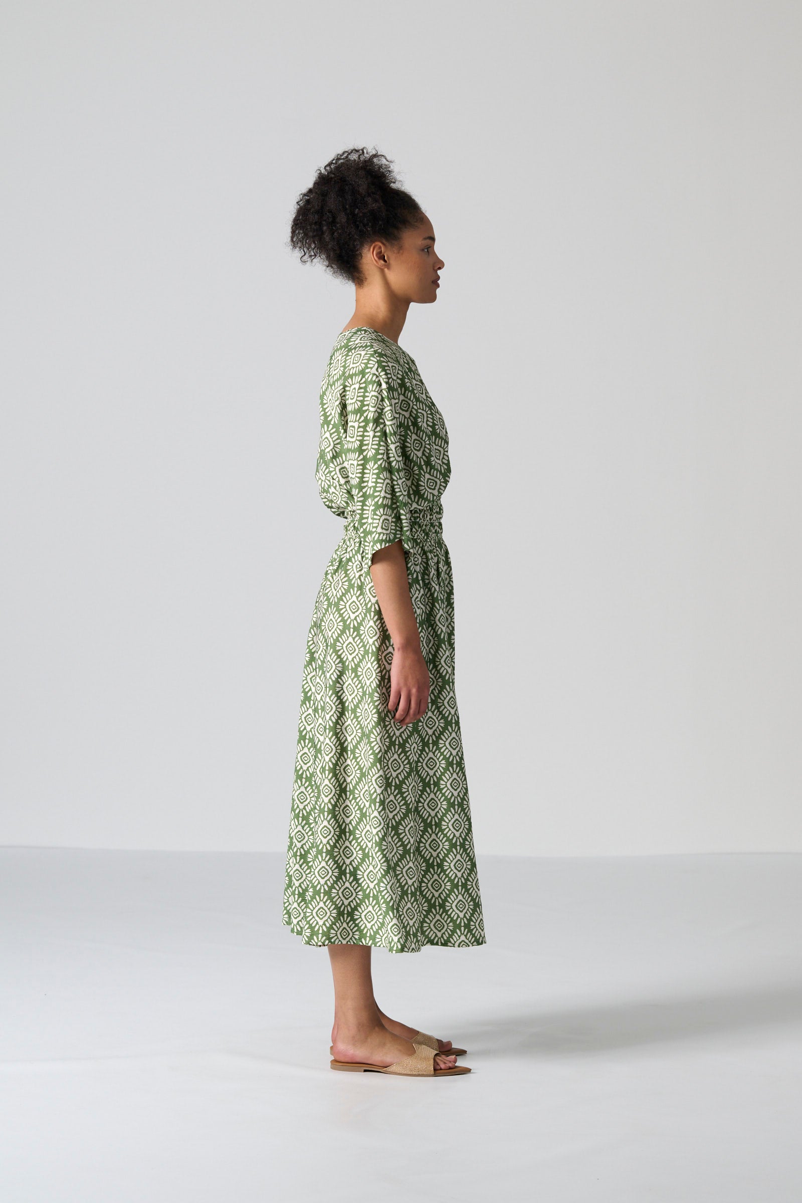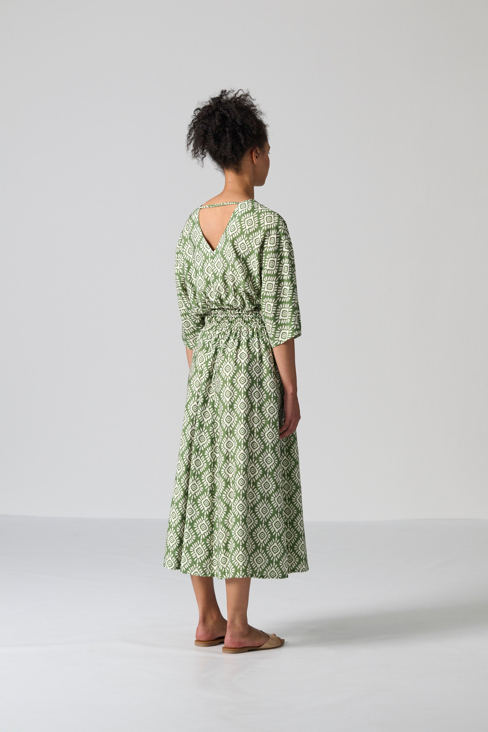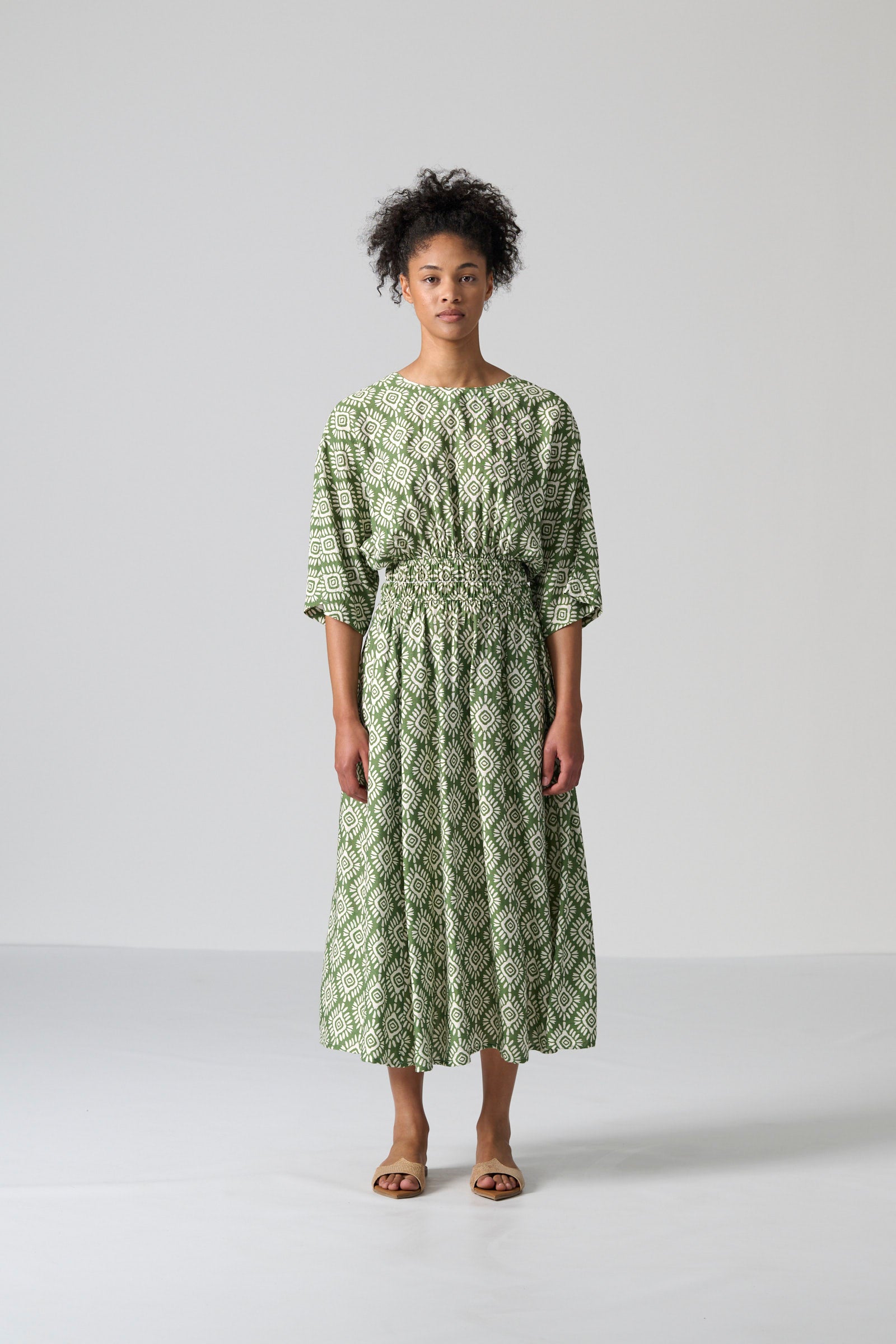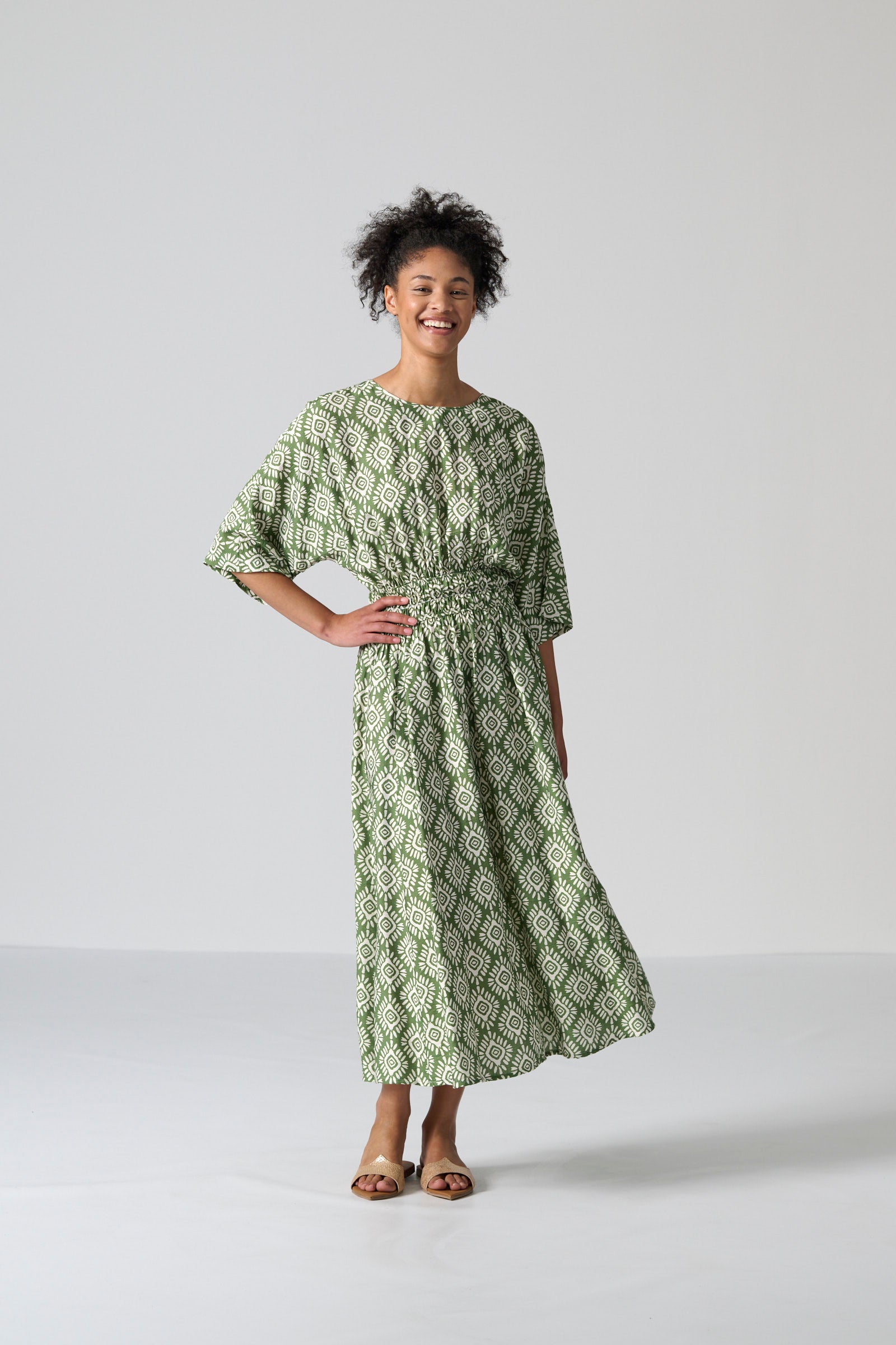 The Leena dress in olive and cream mono print blends ease and elegance in perfect harmony. With its round front neckline, subtle V back and softly draped grown-on sleeves, Leena moves beautifully through the day. The elasticated shirred waist defines the silhouette while maintaining comfort, and the full skirt with side entry pockets adds an effortless, feminine finish.