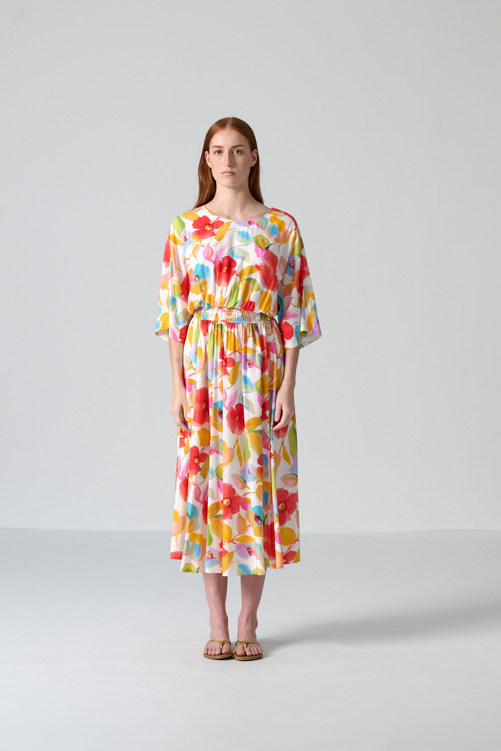Crafted from 100% rayon, the fabric is soft, breathable and fluid, offering beautiful drape and comfort in warmer weather. The multi floral print adds joyful colour and versatility, making Leena a standout piece for any moment.
