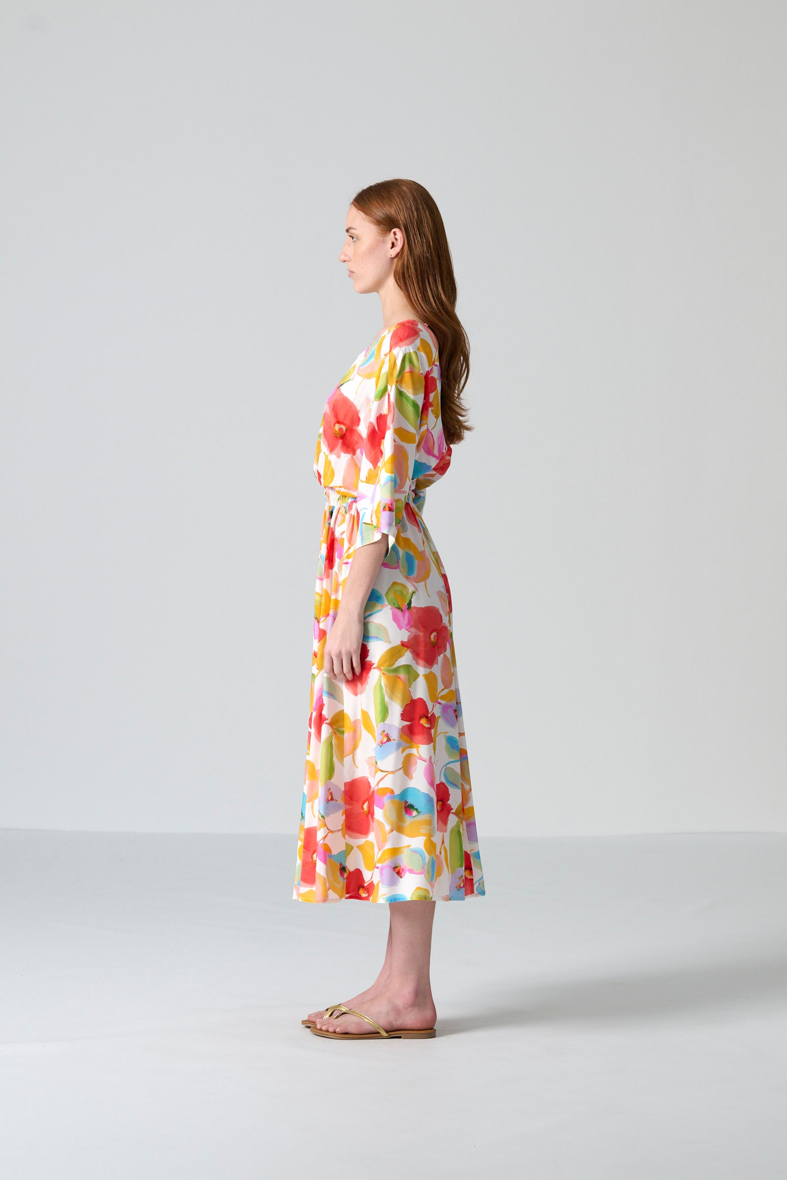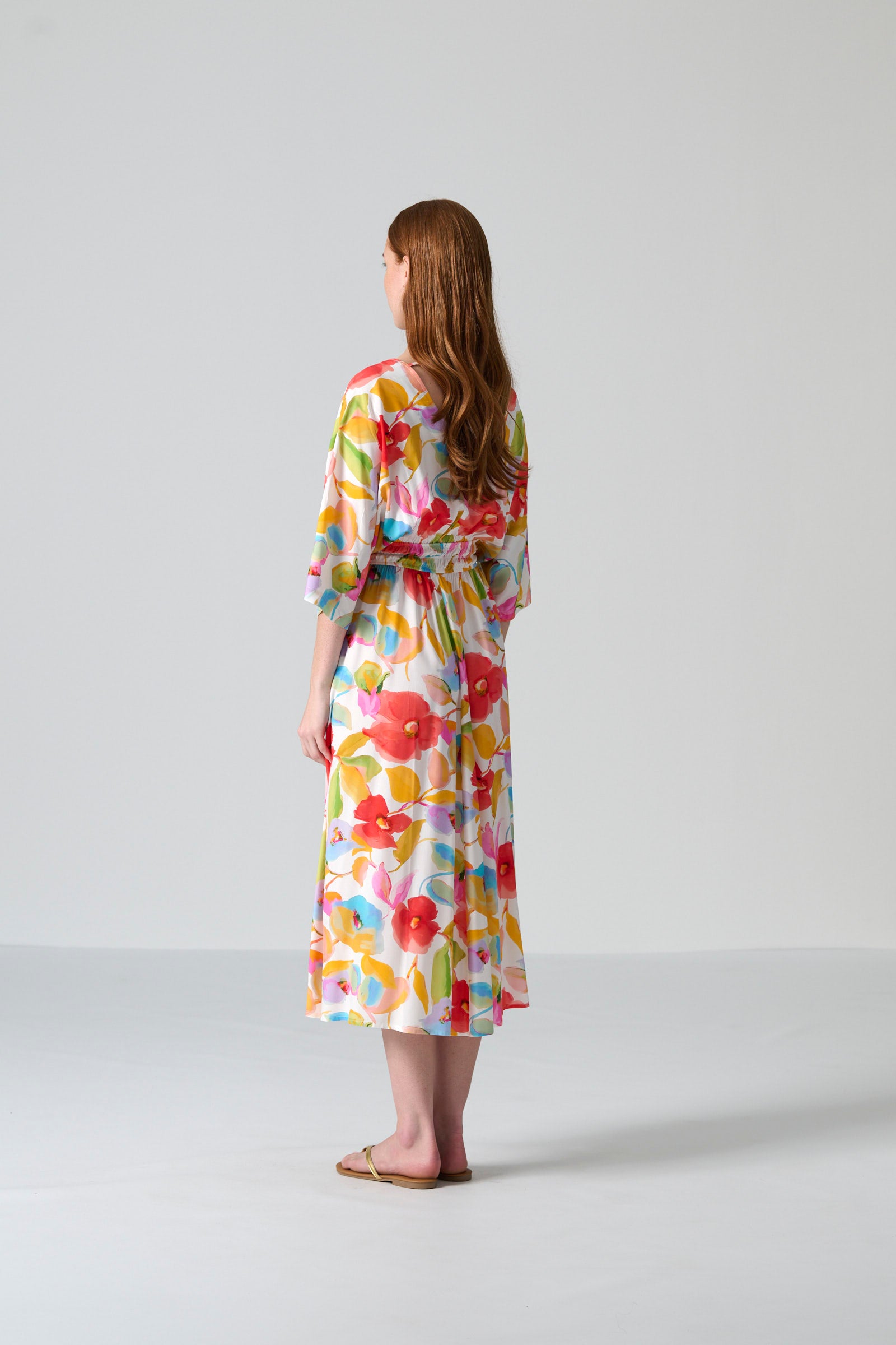 The Leena dress in multi floral print brings a sense of vibrancy and soft romantic energy to everyday dressing. With its round front neckline, subtle V back and gently draped grown-on sleeves, Leena moves with ease and lightness through the day. The elasticated shirred waist defines the silhouette while maintaining comfort, and the full skirt with side entry pockets completes the look with effortless femininity.