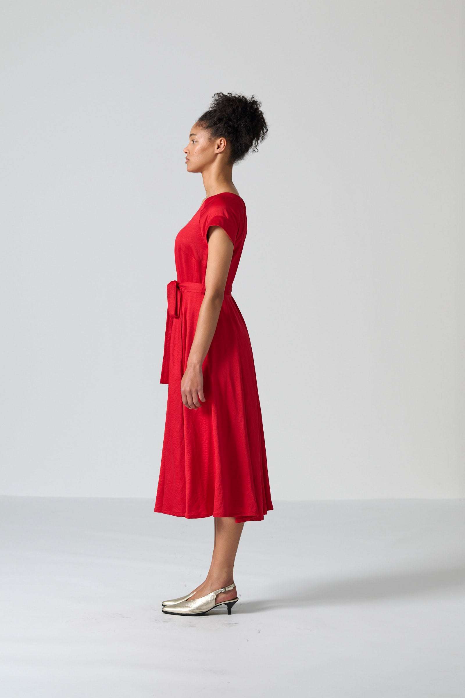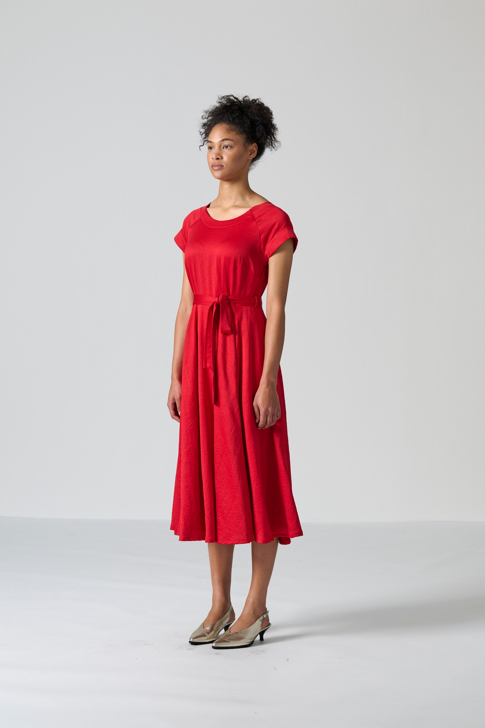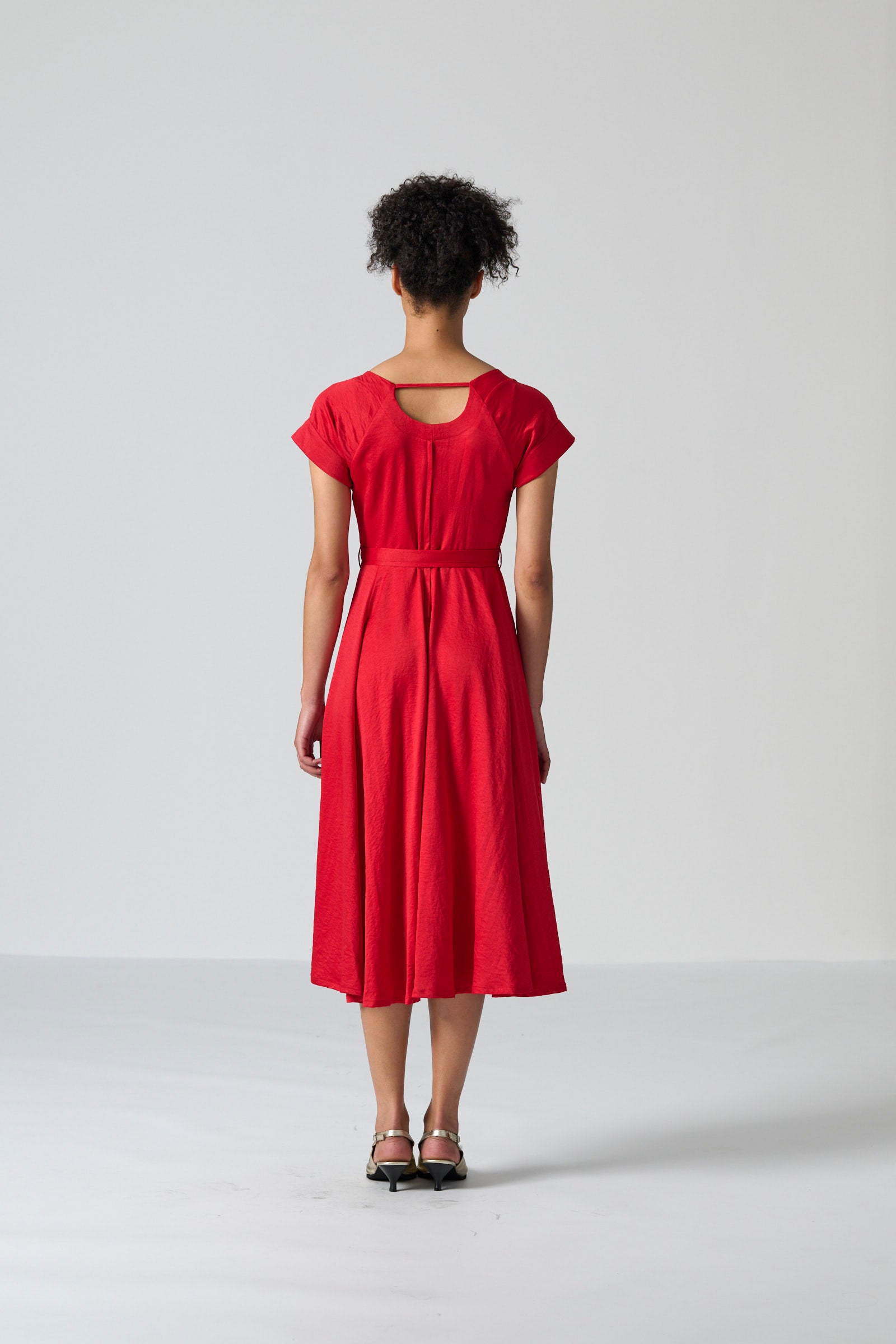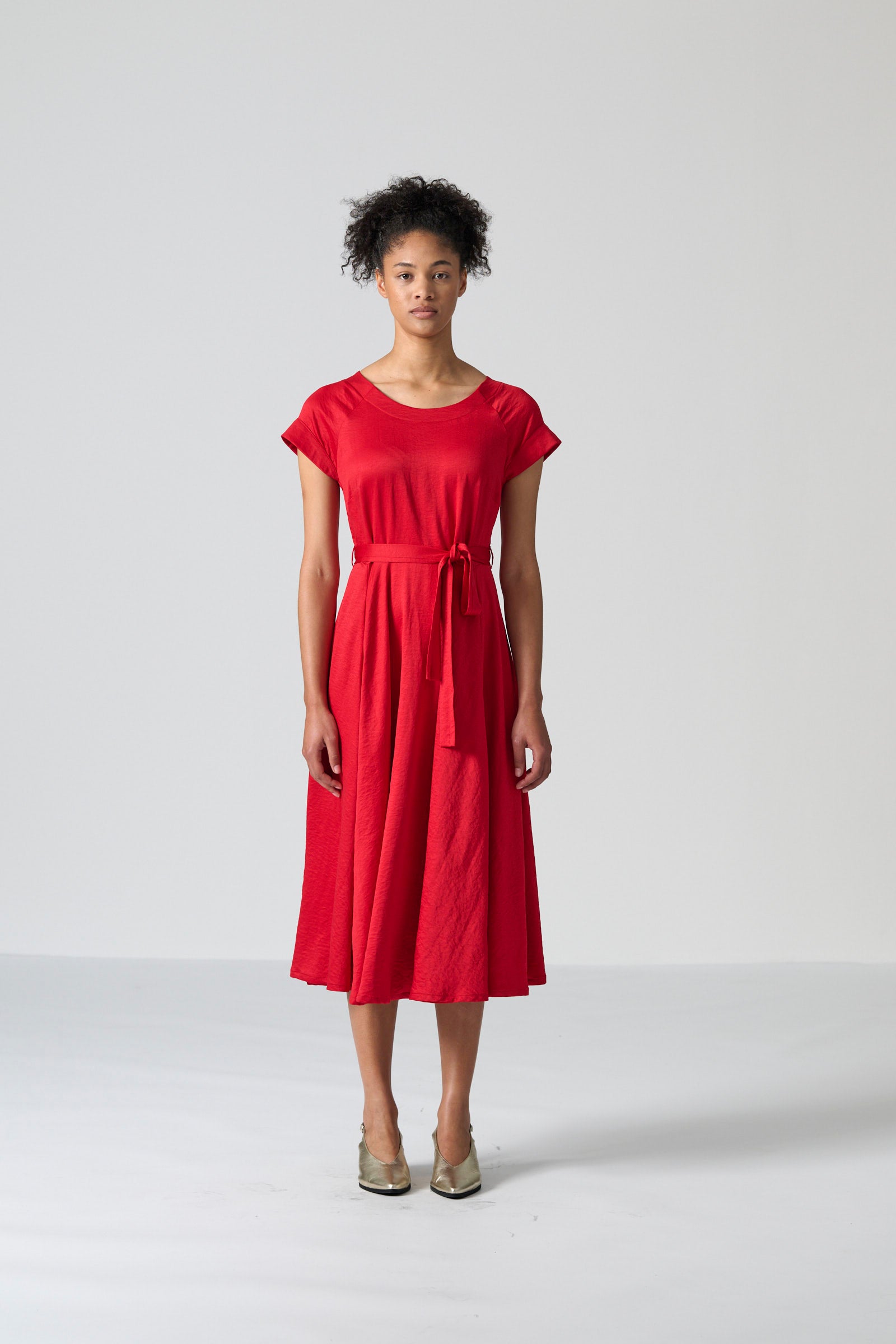 The Lessa dress in red cyber satin brings vibrant elegance and effortless movement to your wardrobe. Featuring a round neckline and short sleeves, it balances simplicity with refined detail. The back bodice adds subtle interest, while the full paneled skirt flows beautifully with every step. Side seam pockets and a tie belt complete the silhouette with practical functionality and adjustable shaping.