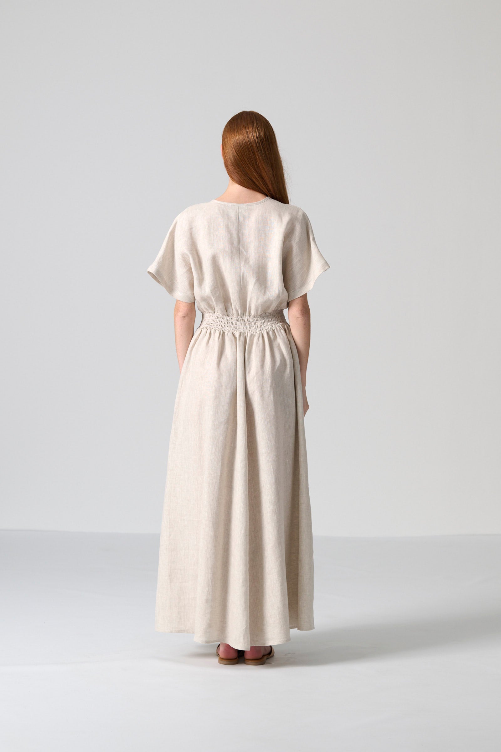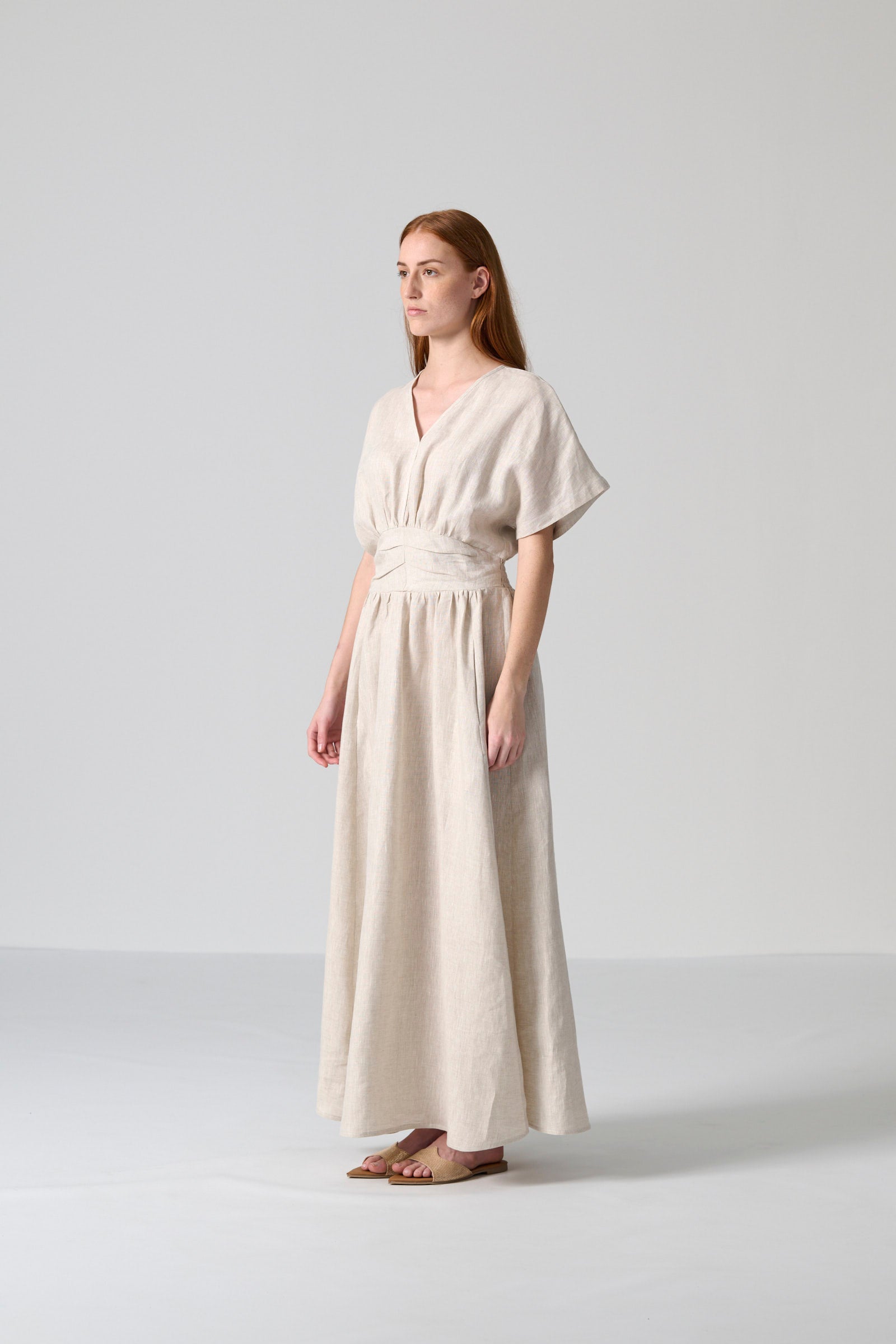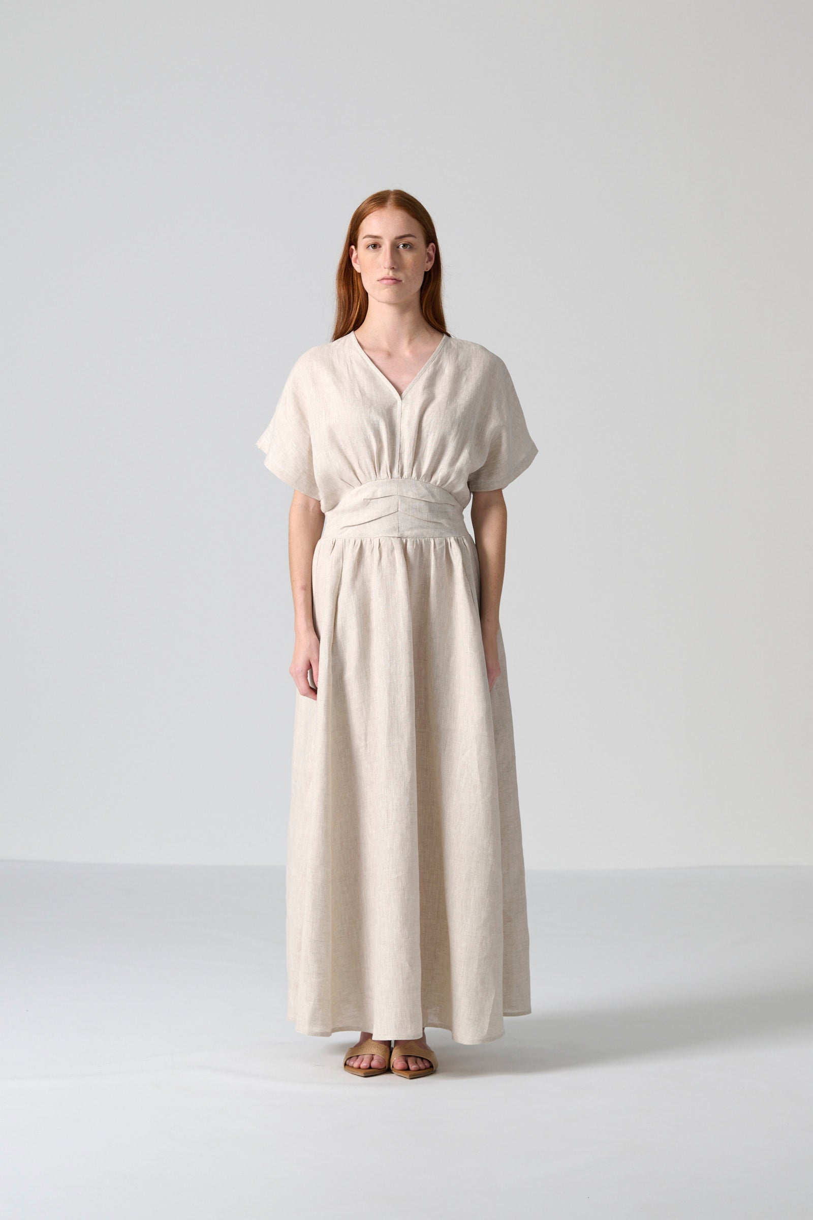 The London dress in natural slub linen brings an effortless blend of ease and refined texture. The V neckline and short sleeves create a clean, relaxed silhouette, while the shaped front waistband with delicate pleat detailing adds subtle structure. A shirred back waist ensures comfortable shaping, and the flowing maxi length skirt with gentle gathers moves with understated elegance. Side entry pockets provide a practical finishing touch.