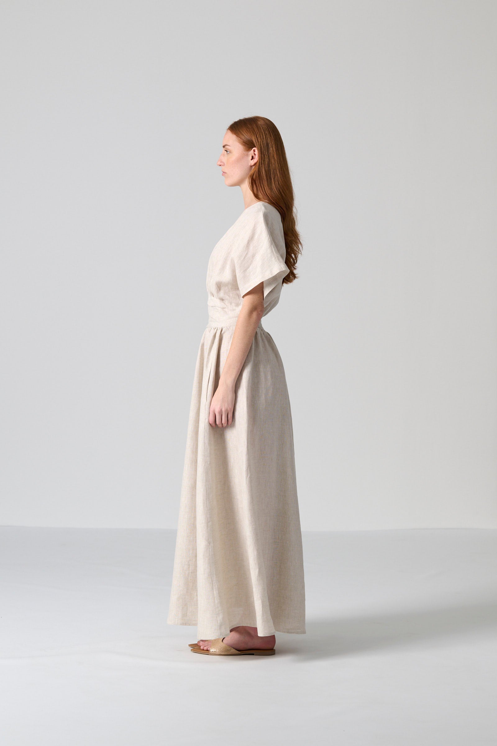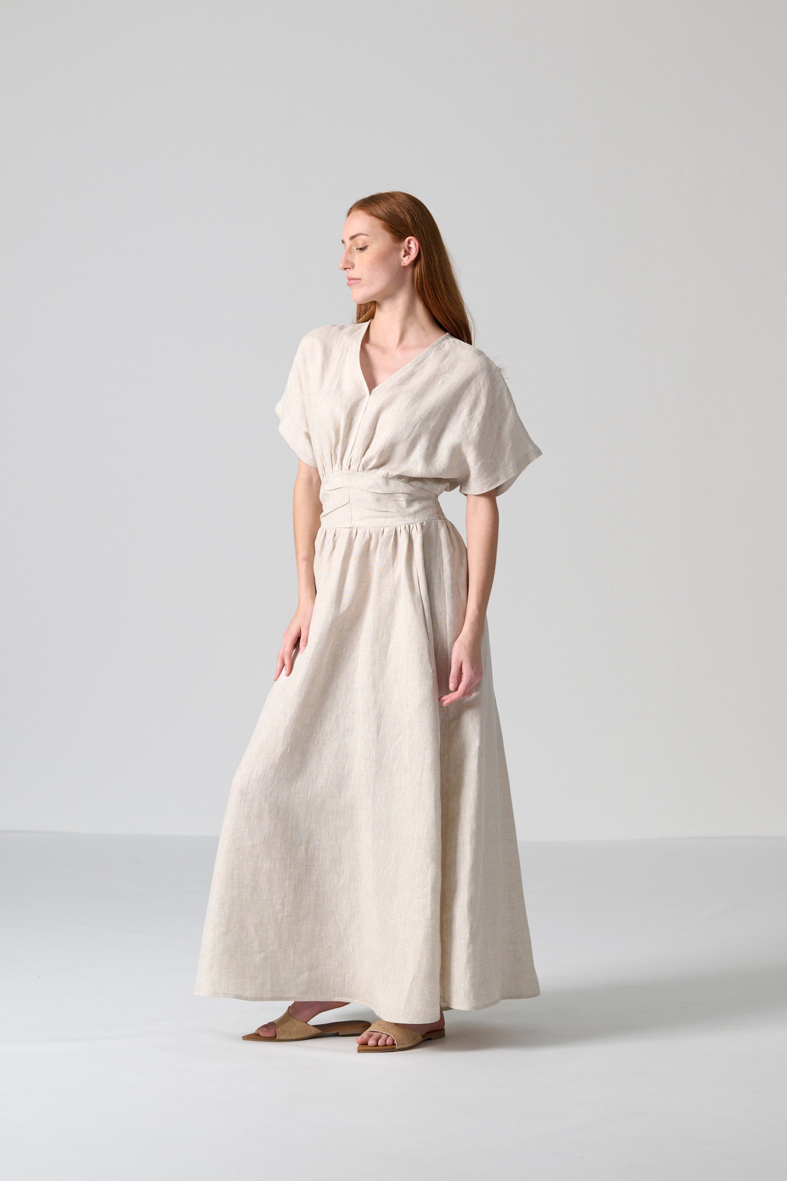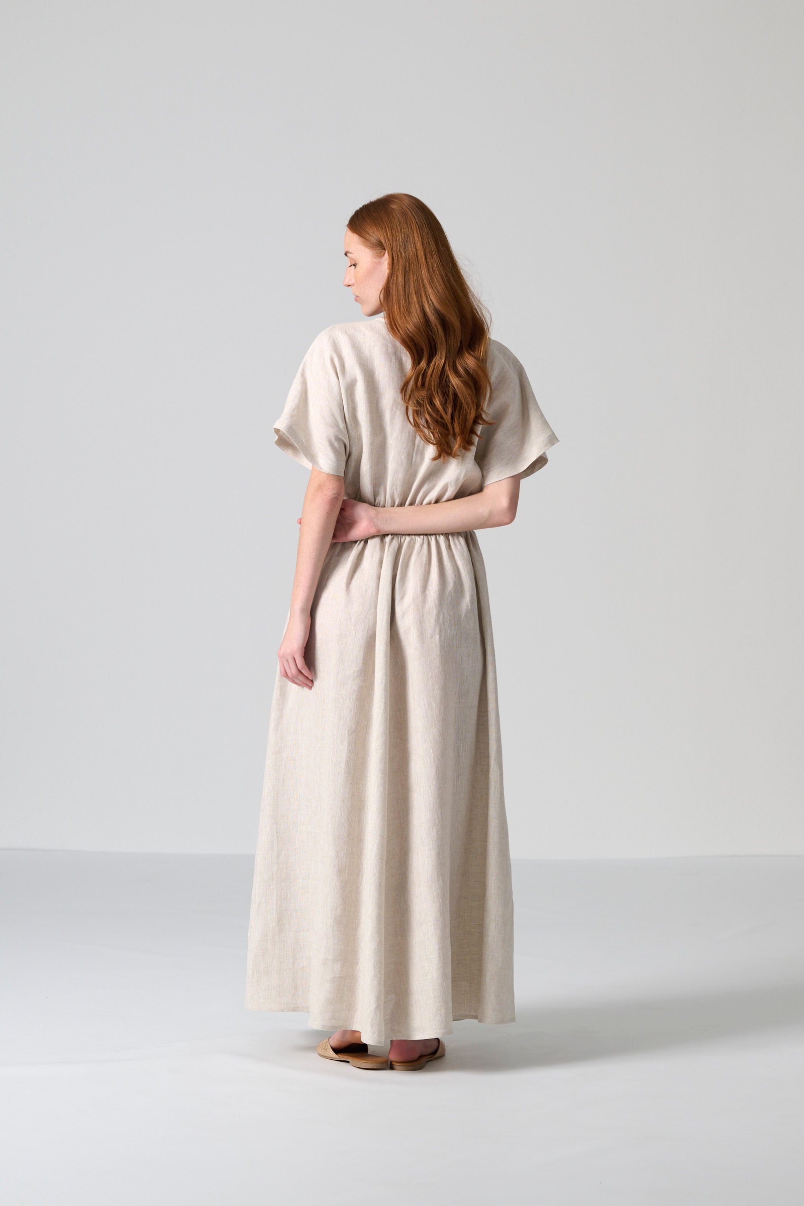 The London dress in natural slub linen brings an effortless blend of ease and refined texture. The V neckline and short sleeves create a clean, relaxed silhouette, while the shaped front waistband with delicate pleat detailing adds subtle structure. A shirred back waist ensures comfortable shaping, and the flowing maxi length skirt with gentle gathers moves with understated elegance. Side entry pockets provide a practical finishing touch.