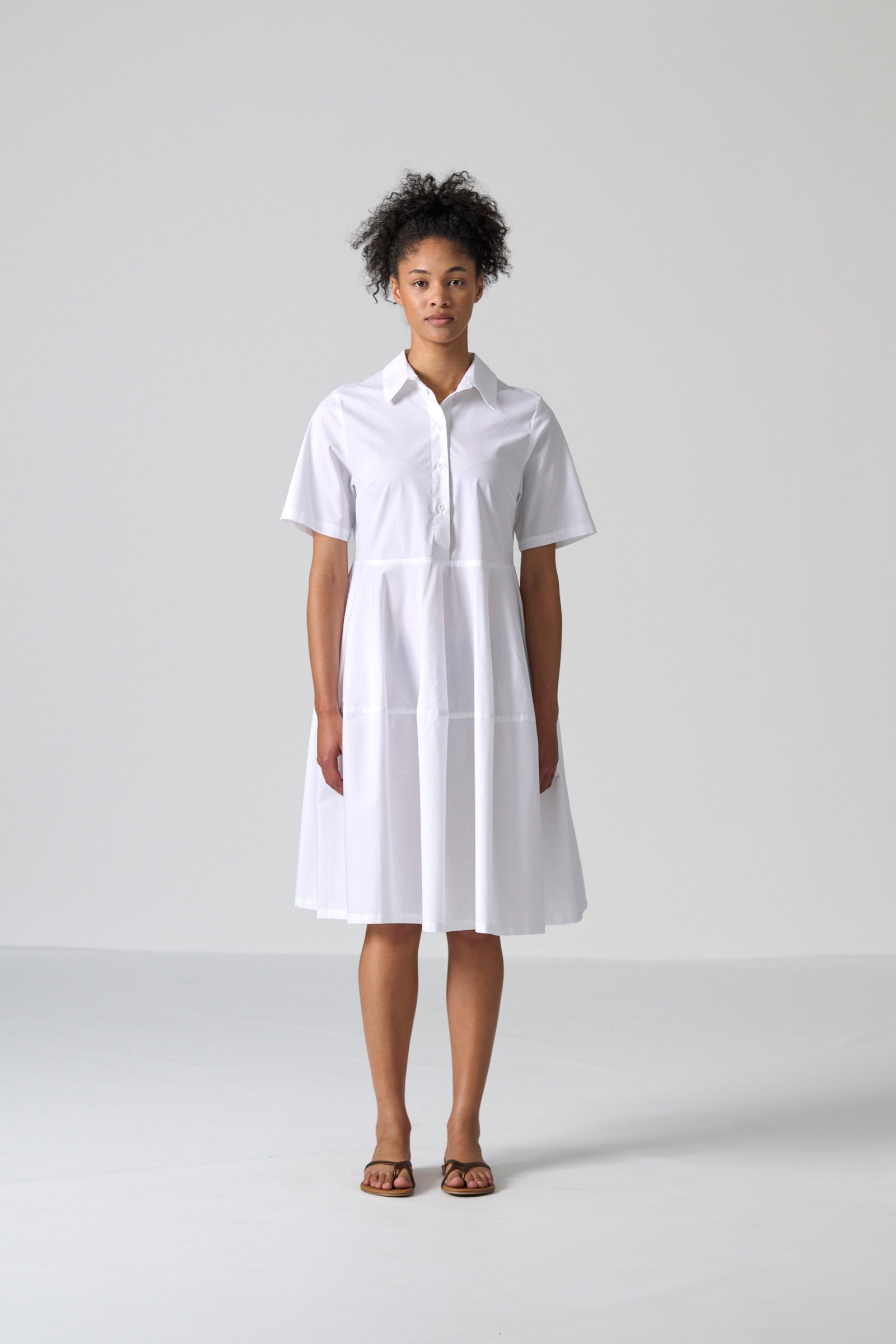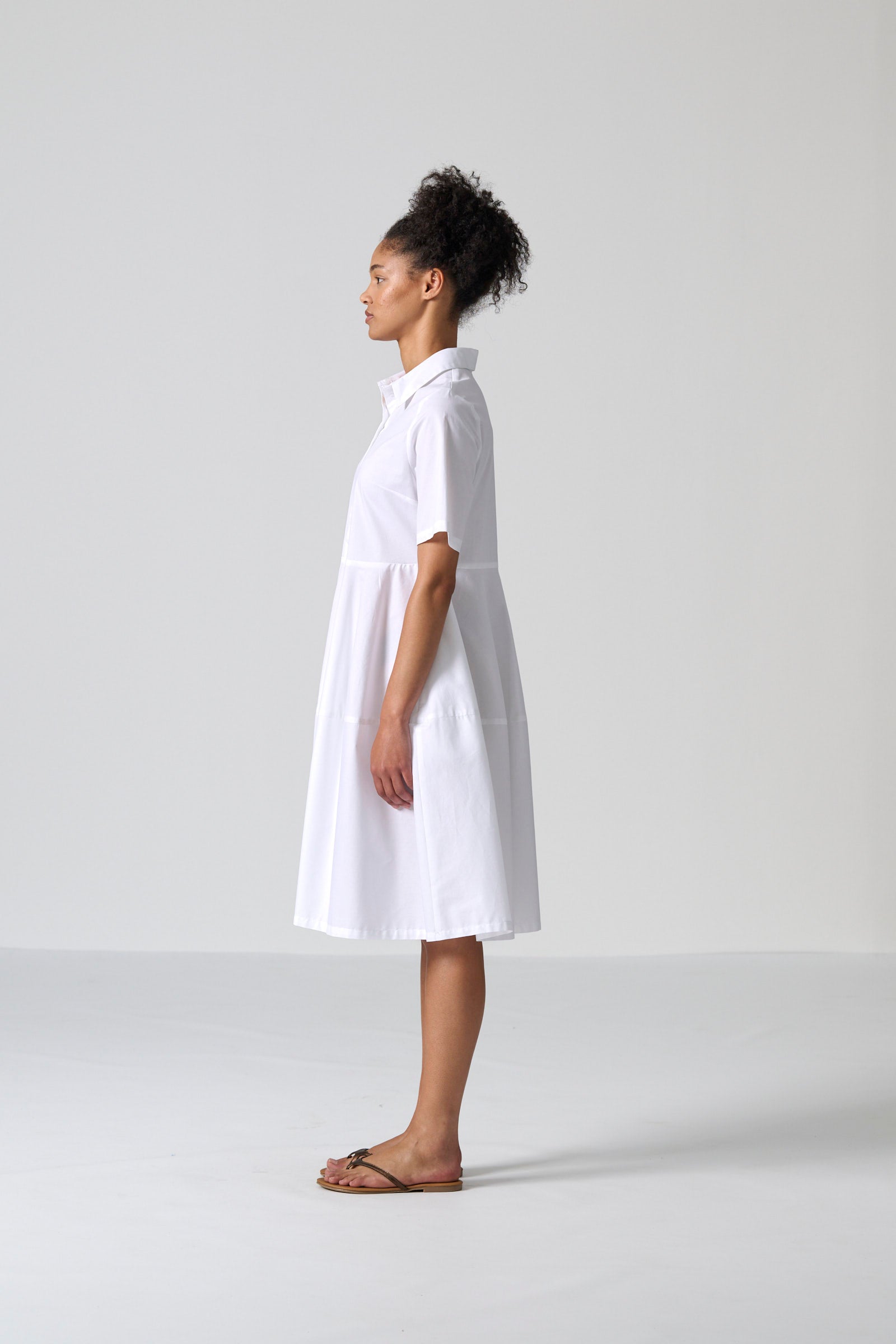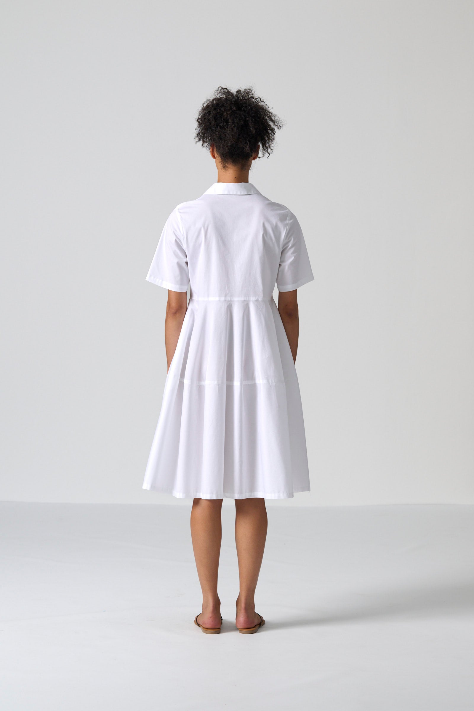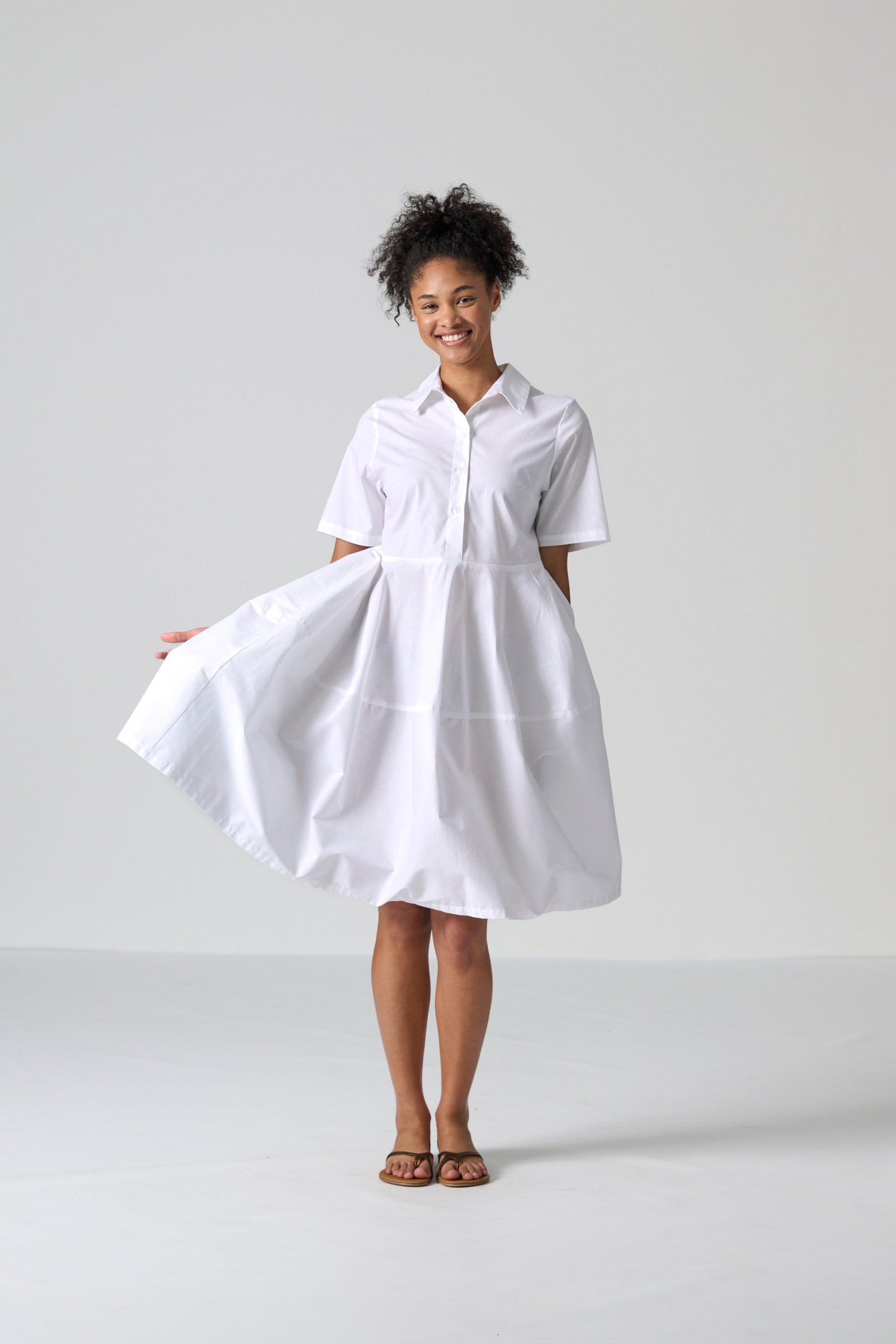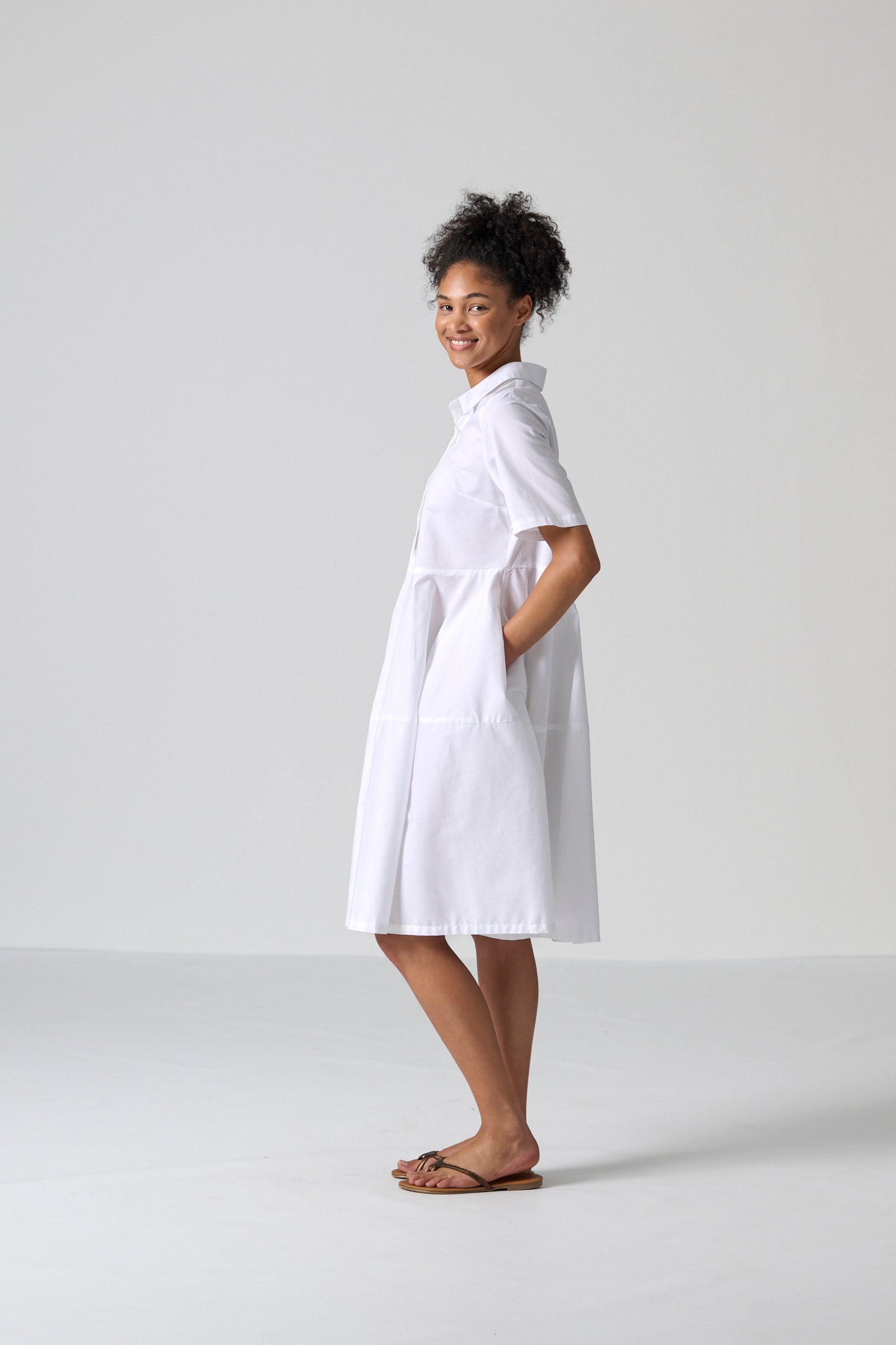 The Rosslyn dress in white cotton poplin offers a fresh, timeless take on everyday dressing. Its clean A-line silhouette creates an effortlessly flattering shape, while the collar and button front placket bring a classic shirt dress refinement. Short boxy sleeves add a contemporary edge, and side entry pockets introduce easy practicality for daily wear.