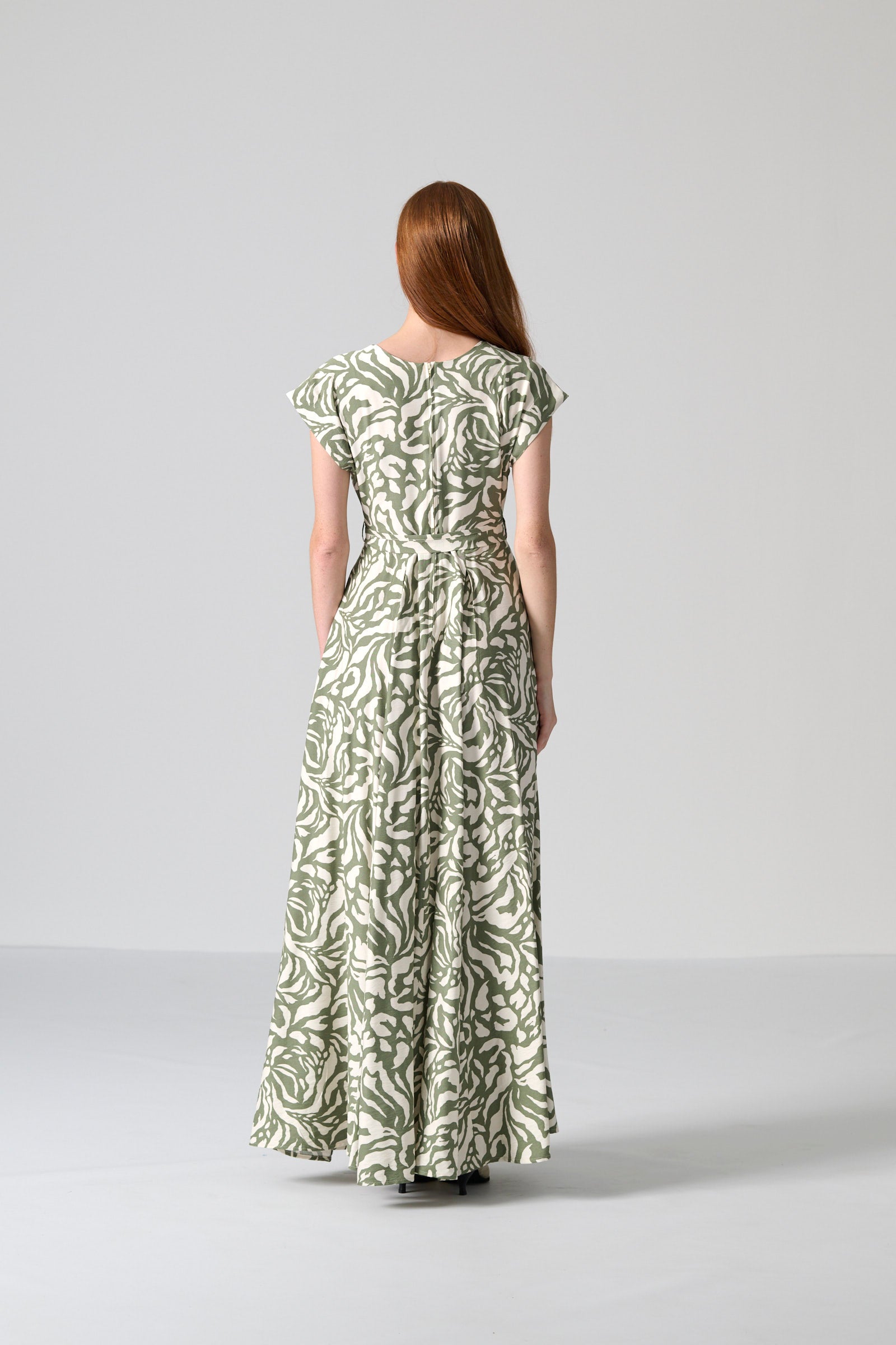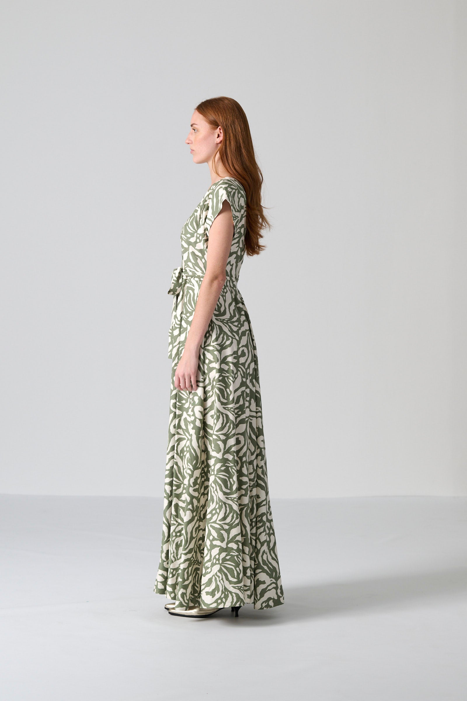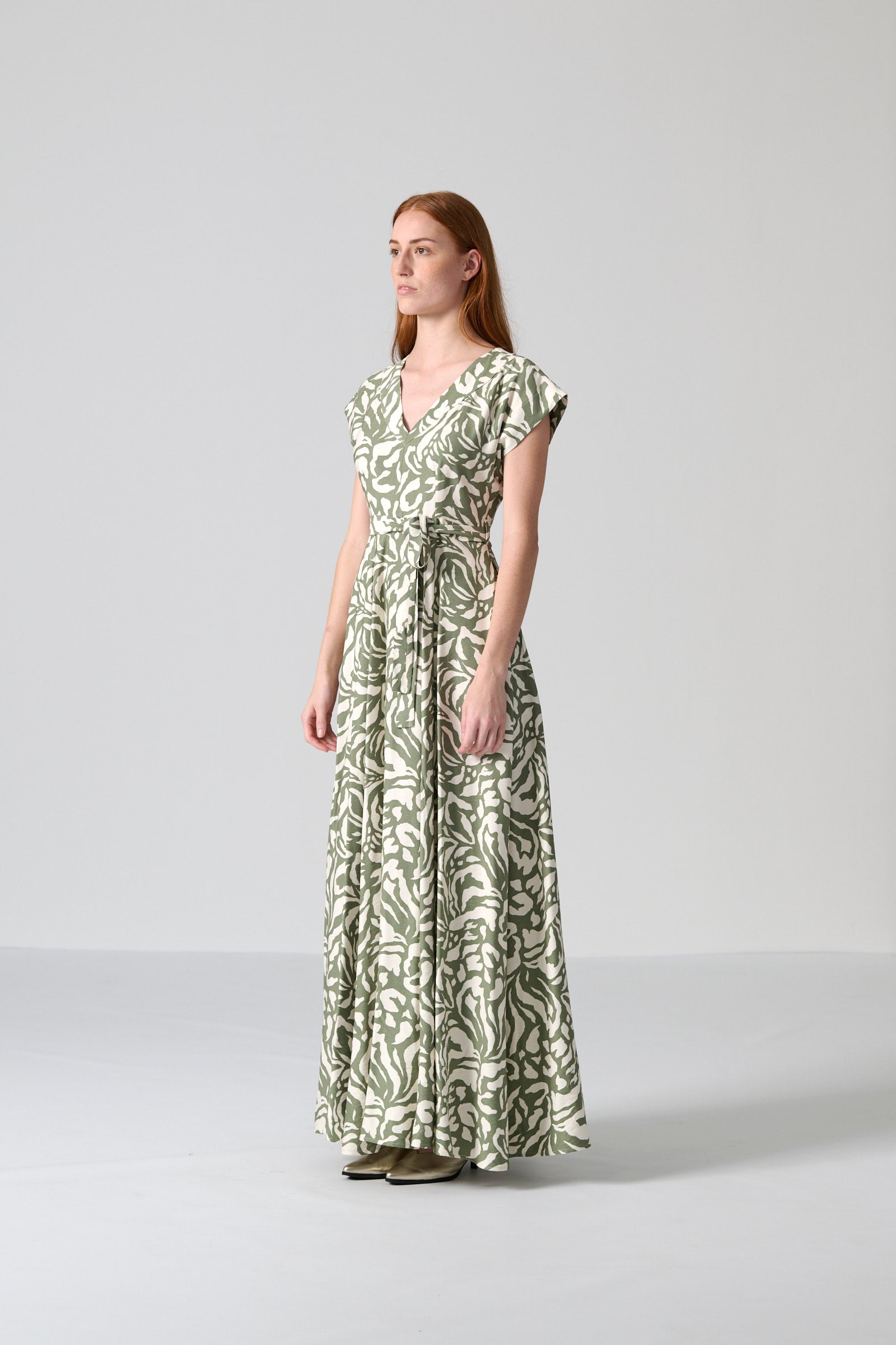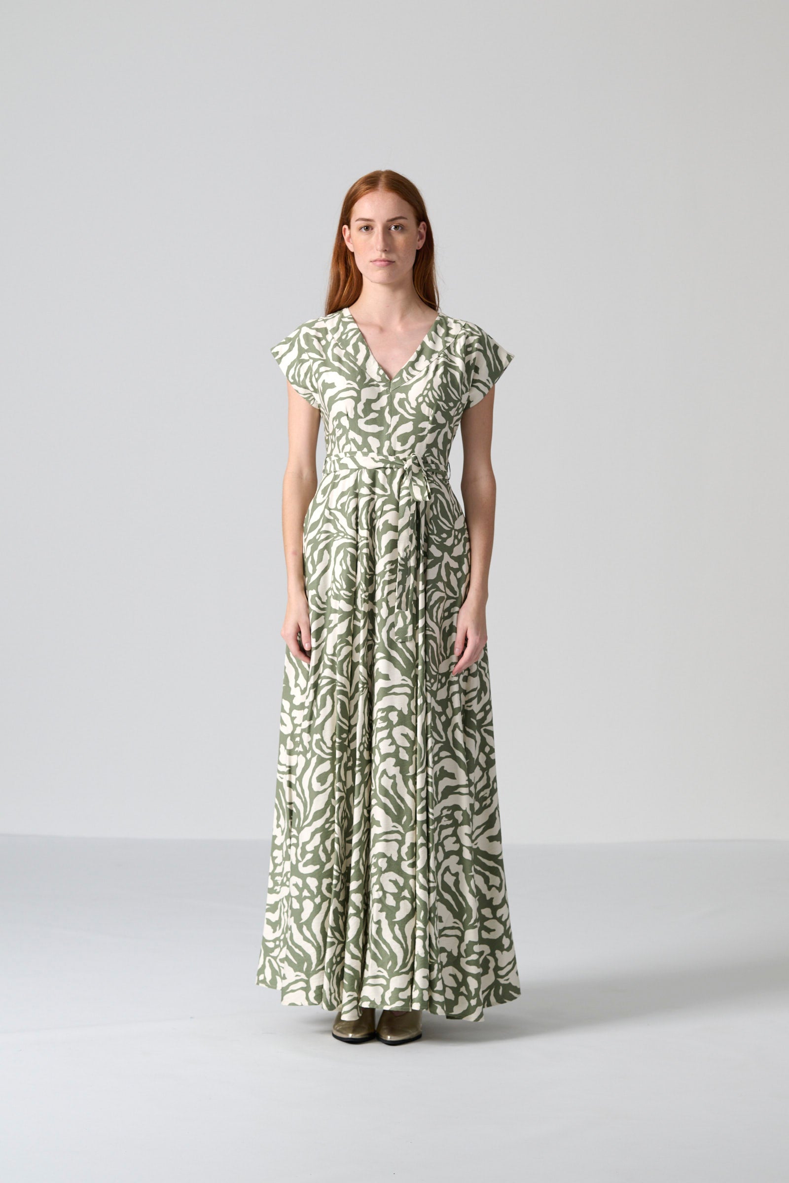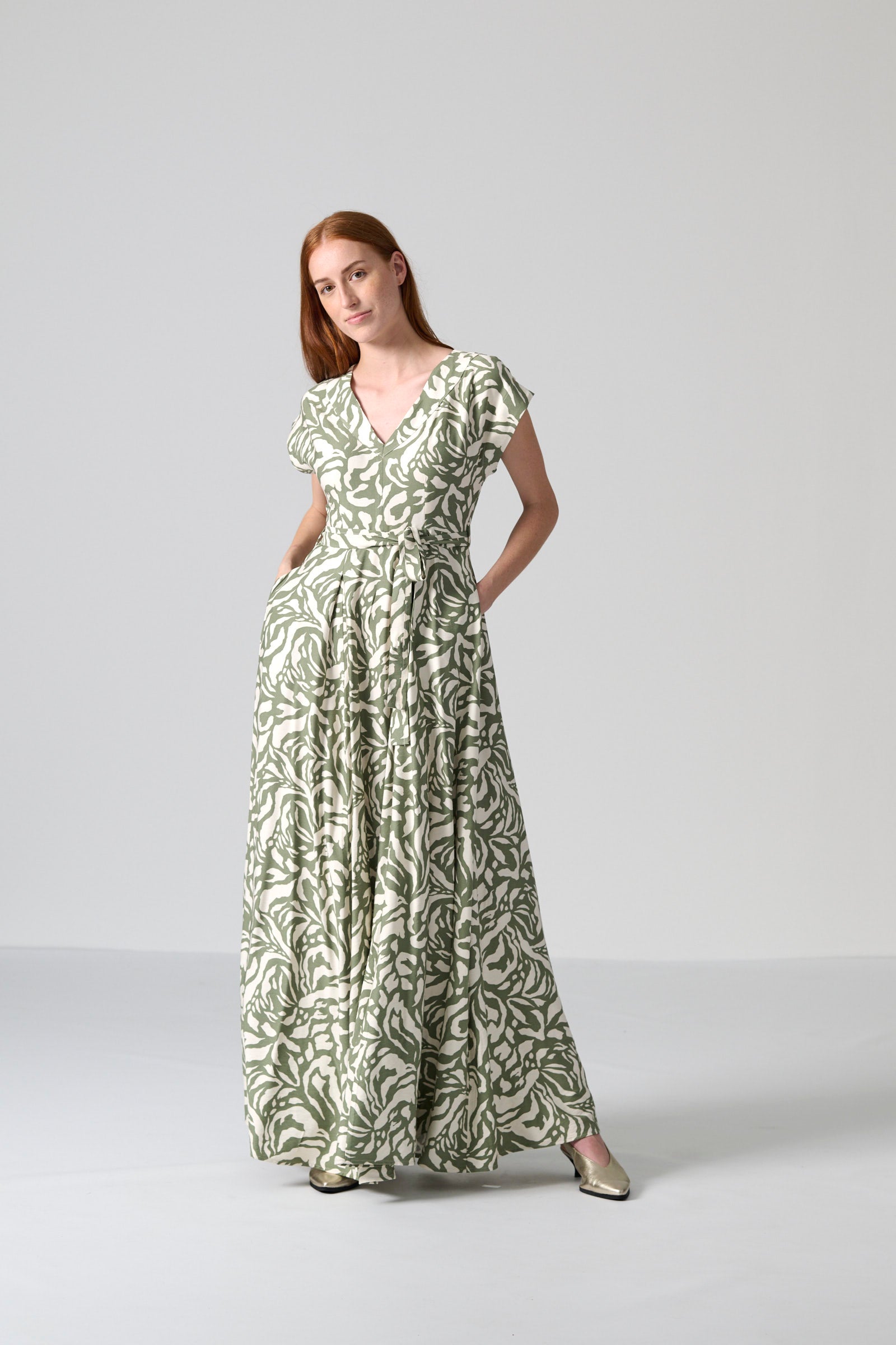 The Thabitha dress in olive and cream mono print brings effortless sophistication and graceful movement to your wardrobe. Featuring a V neckline and flowing maxi length, it flatters the silhouette while offering timeless elegance. The all-in-one sleeves add soft structure, while the self-tie belt allows for adjustable shaping. Side inseam pockets and a centre back zip entry complete the design with practical functionality.