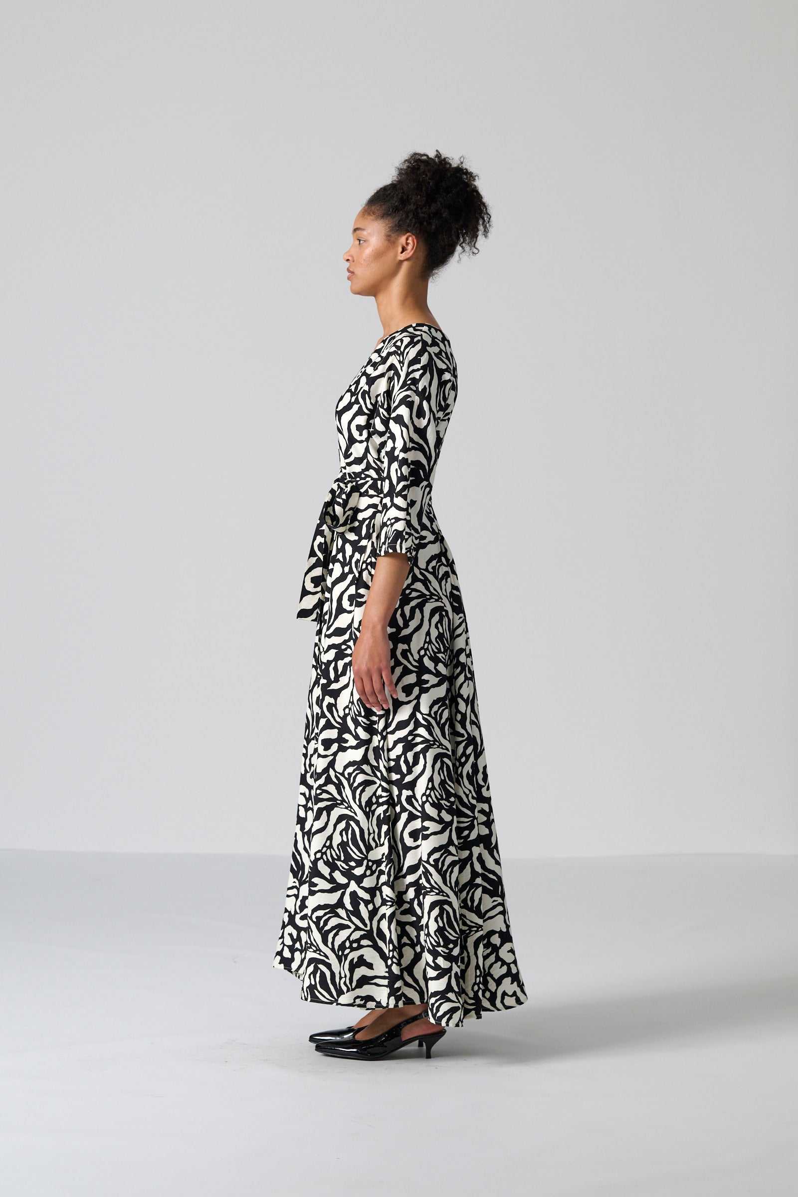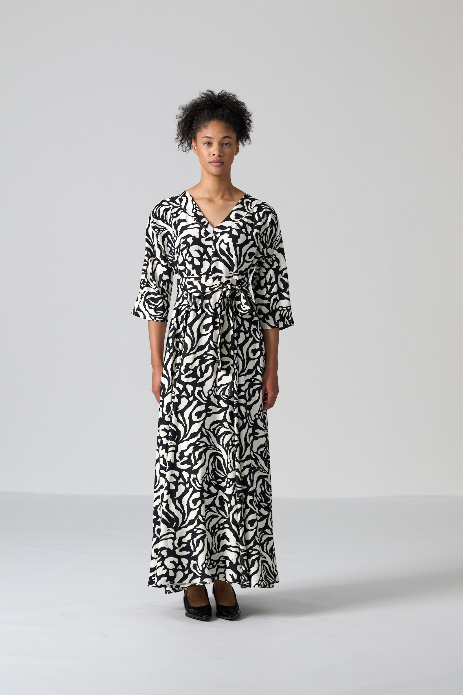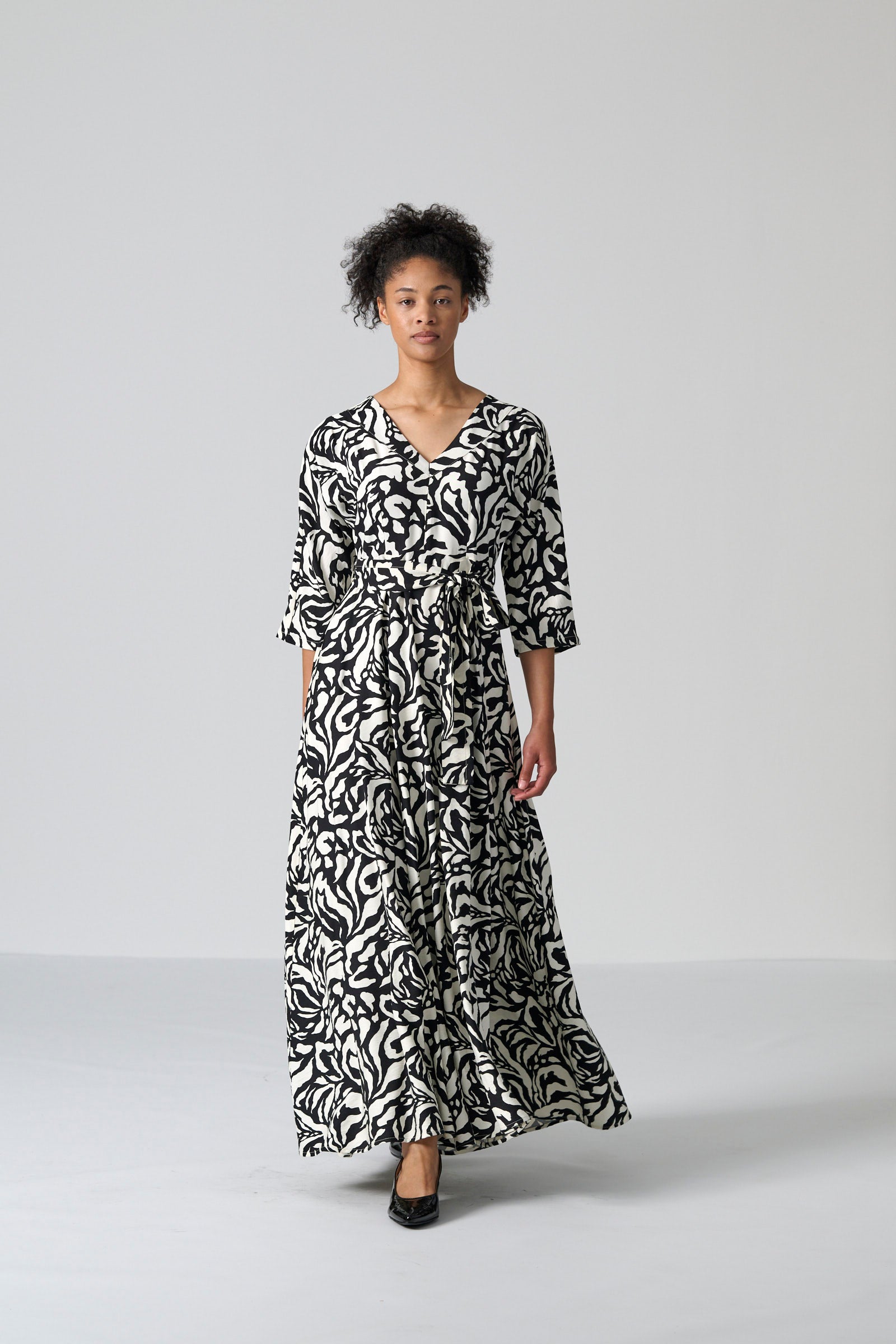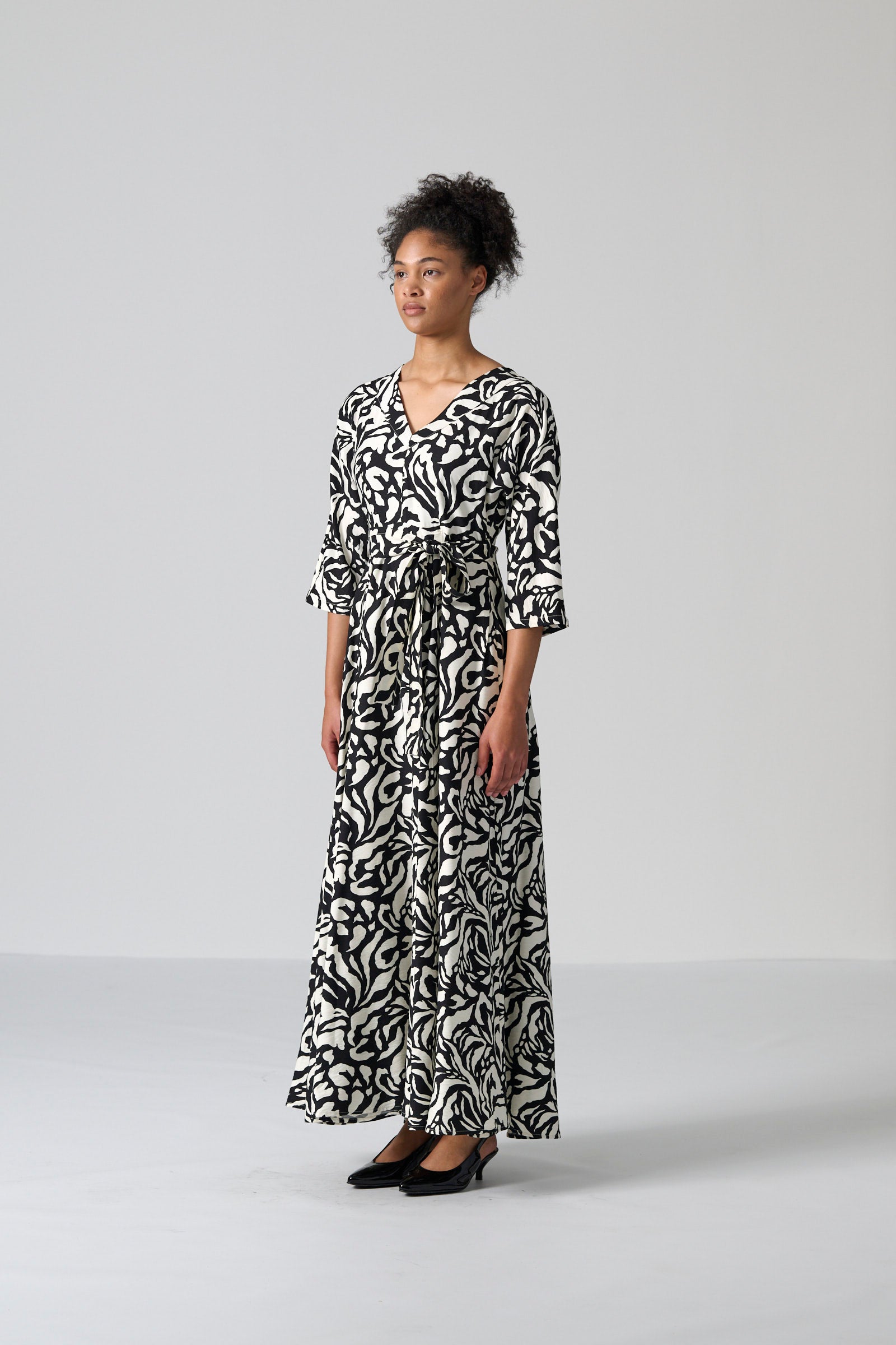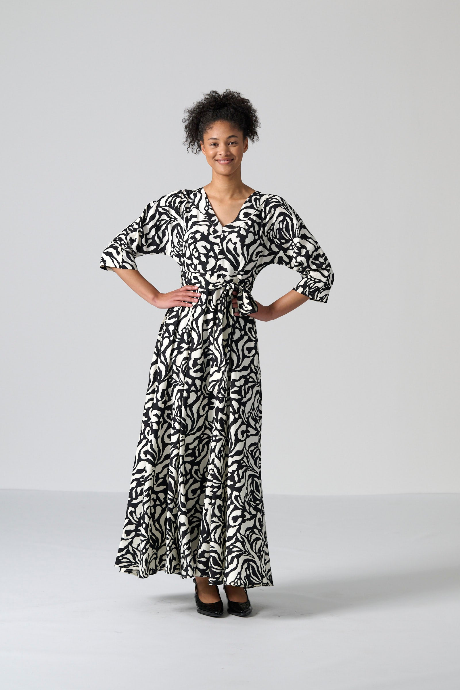 The Tugela dress in black and cream mono print offers a sophisticated and timeless silhouette. With its V neckline, flowing maxi length and softly draped all in one three quarter sleeves, Tugela moves with effortless elegance. The self tie belt allows you to define the waist, while the full skirt adds fluidity and grace. Inseam pockets and a centre back zip entry complete the look with practical ease.