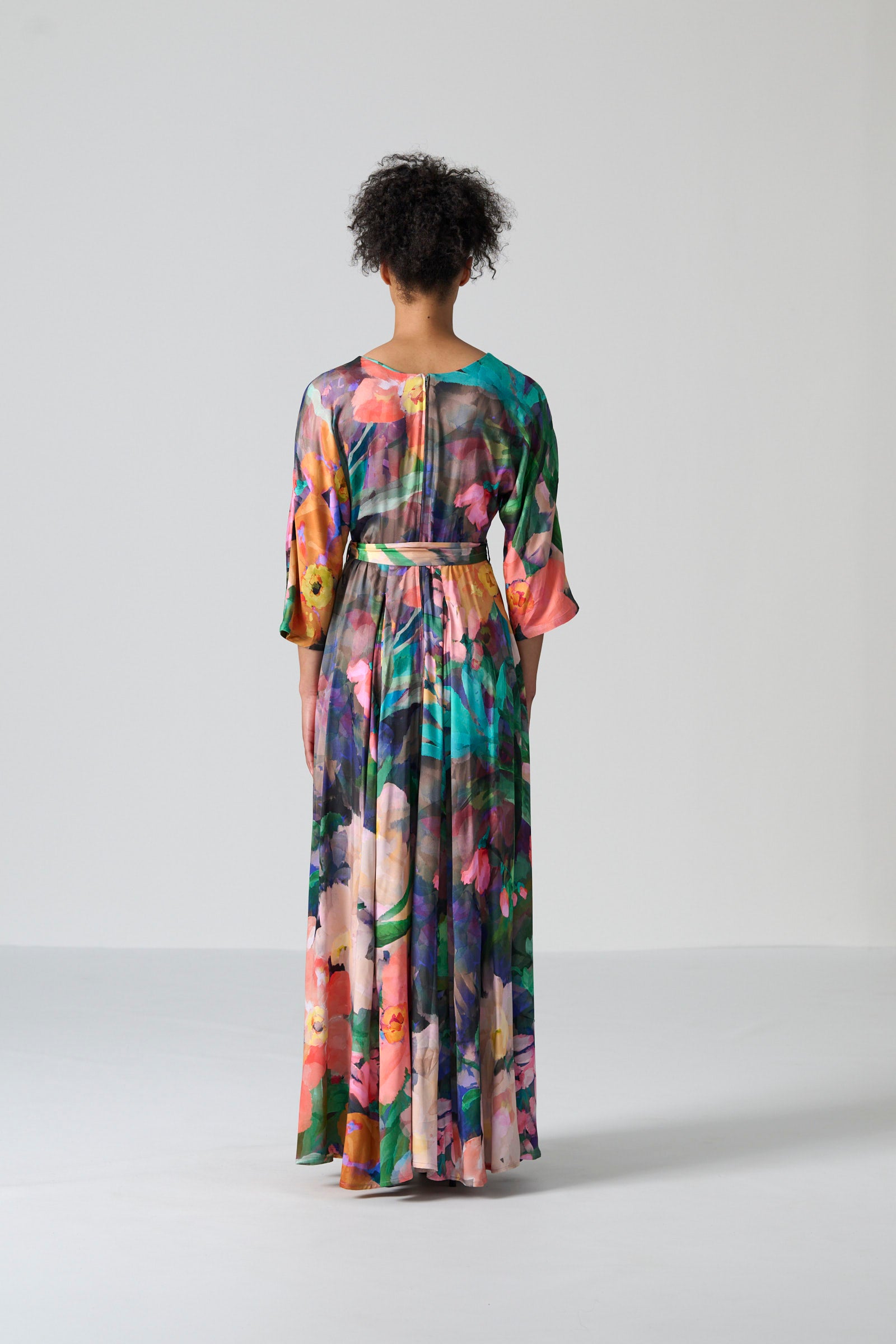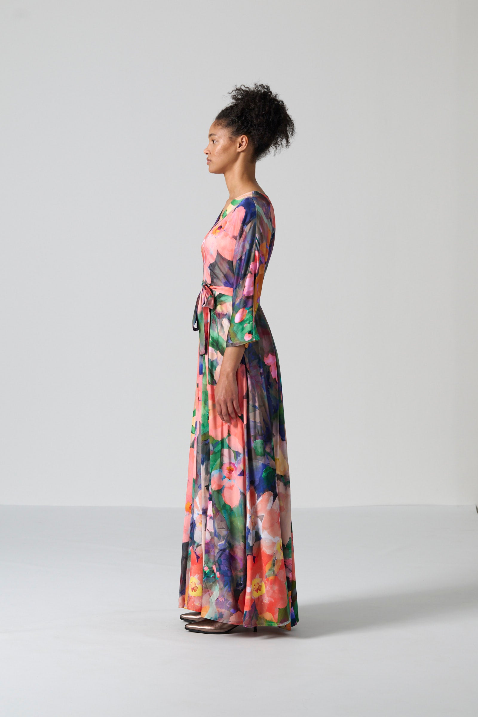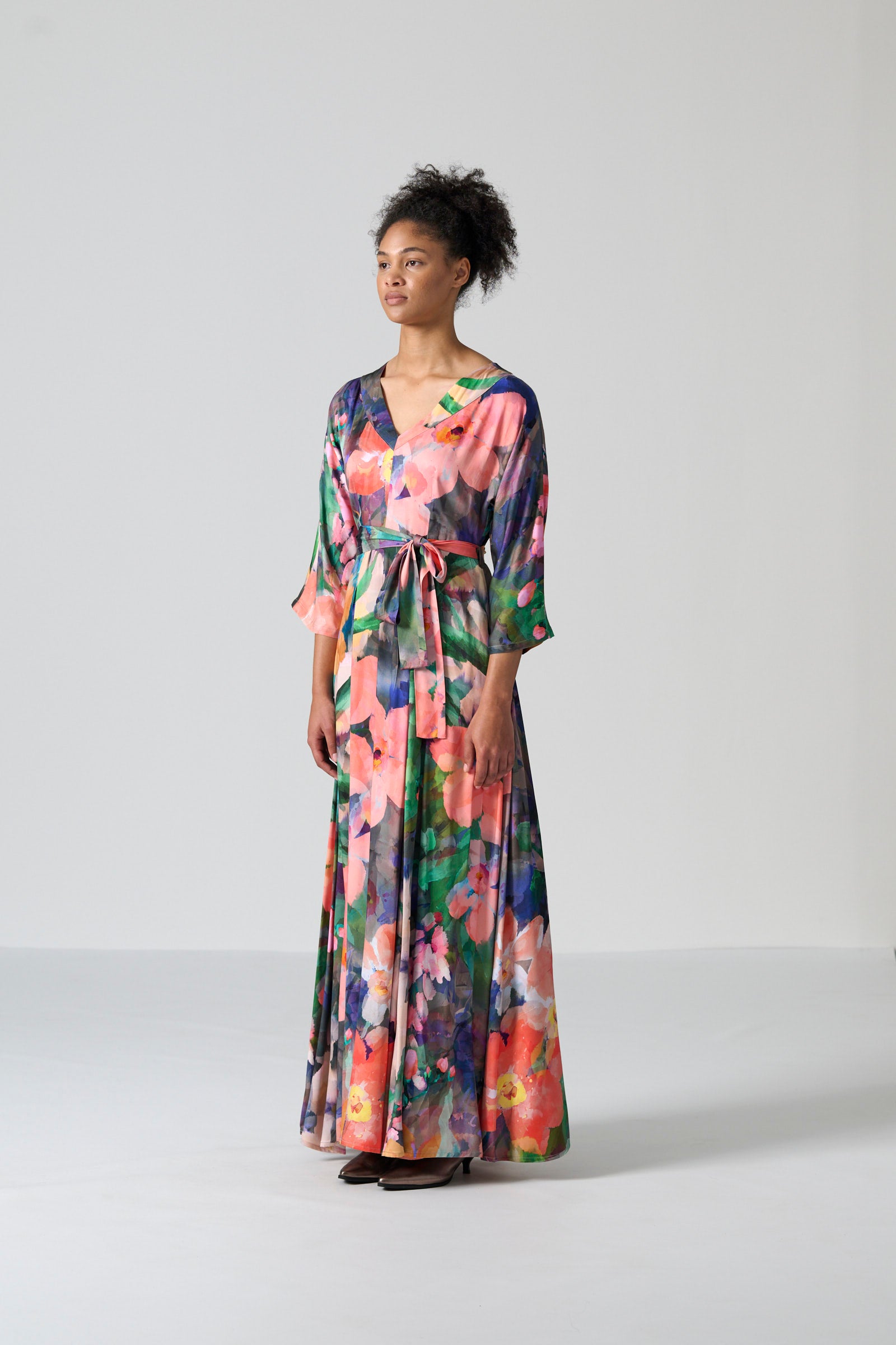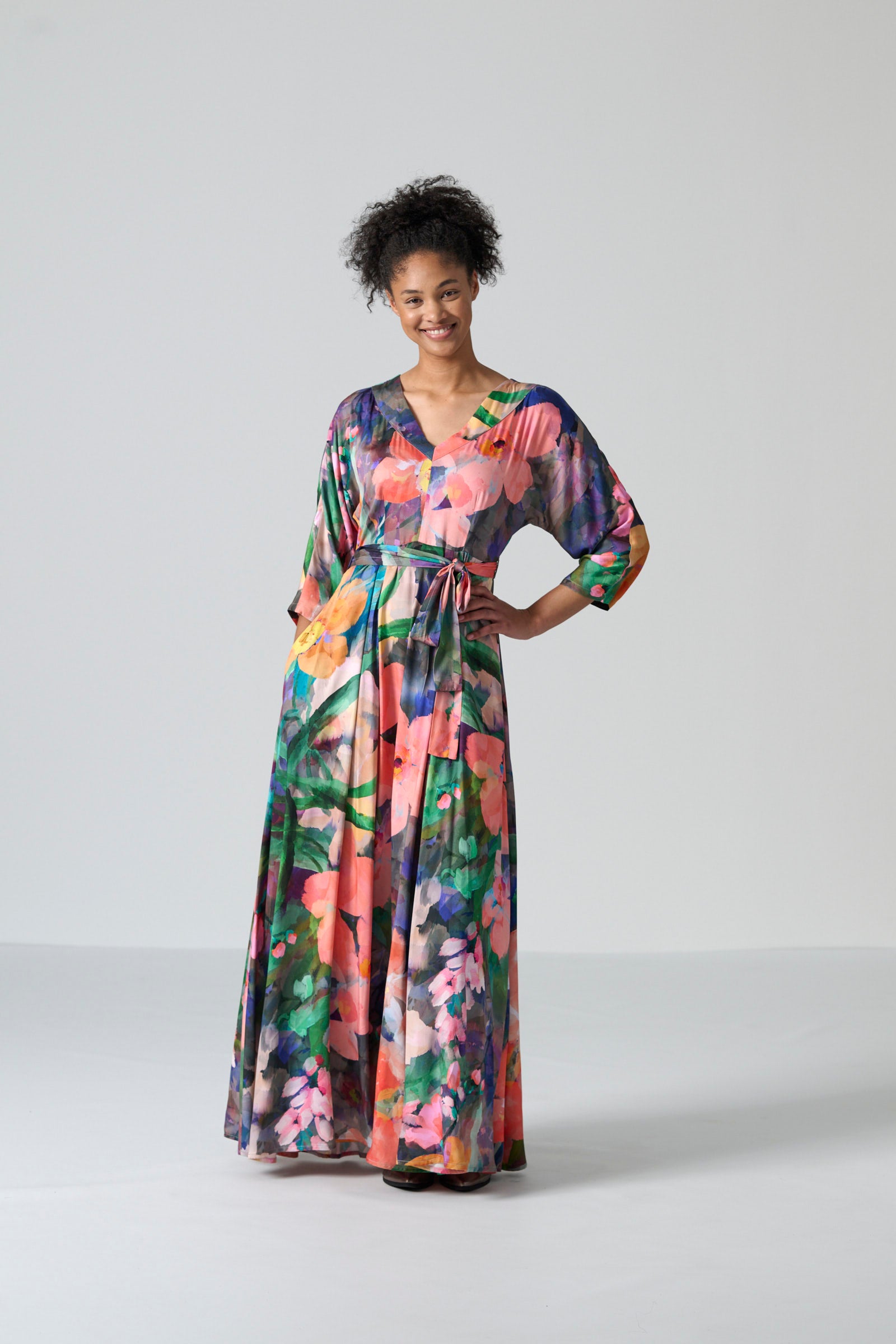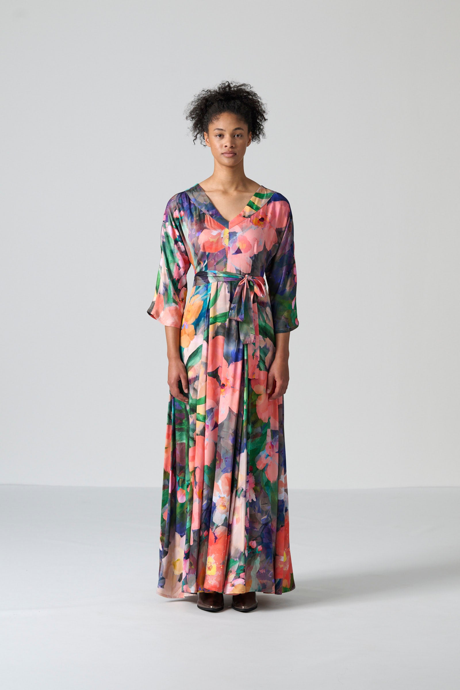 The Tugela dress in pink and blue multi floral brings vibrant movement and a sense of easy romance to warm weather dressing. With its V neckline, flowing maxi length and softly draped all in one three quarter sleeves, Tugela offers effortless grace in every step. The self tie belt allows for adjustable shaping, while the full skirt creates fluid, feminine motion. Inseam pockets and a centre back zip provide practicality without interrupting the clean silhouette.