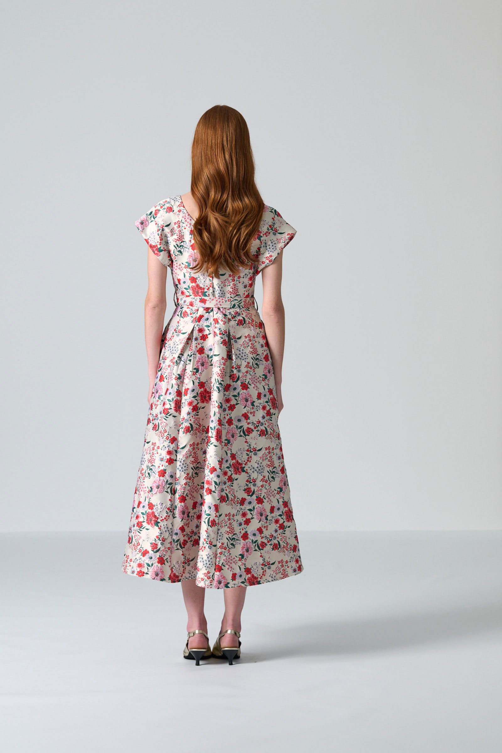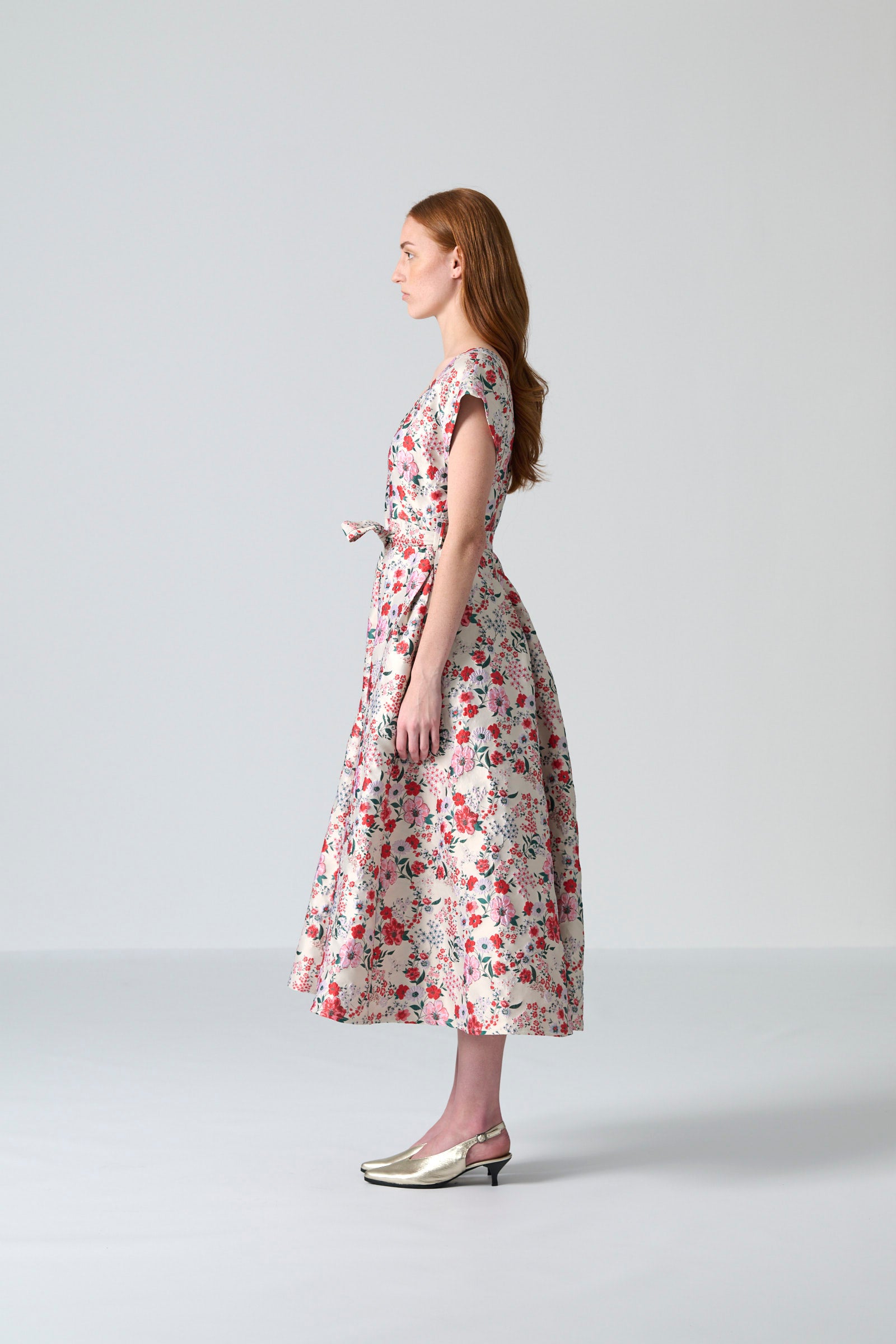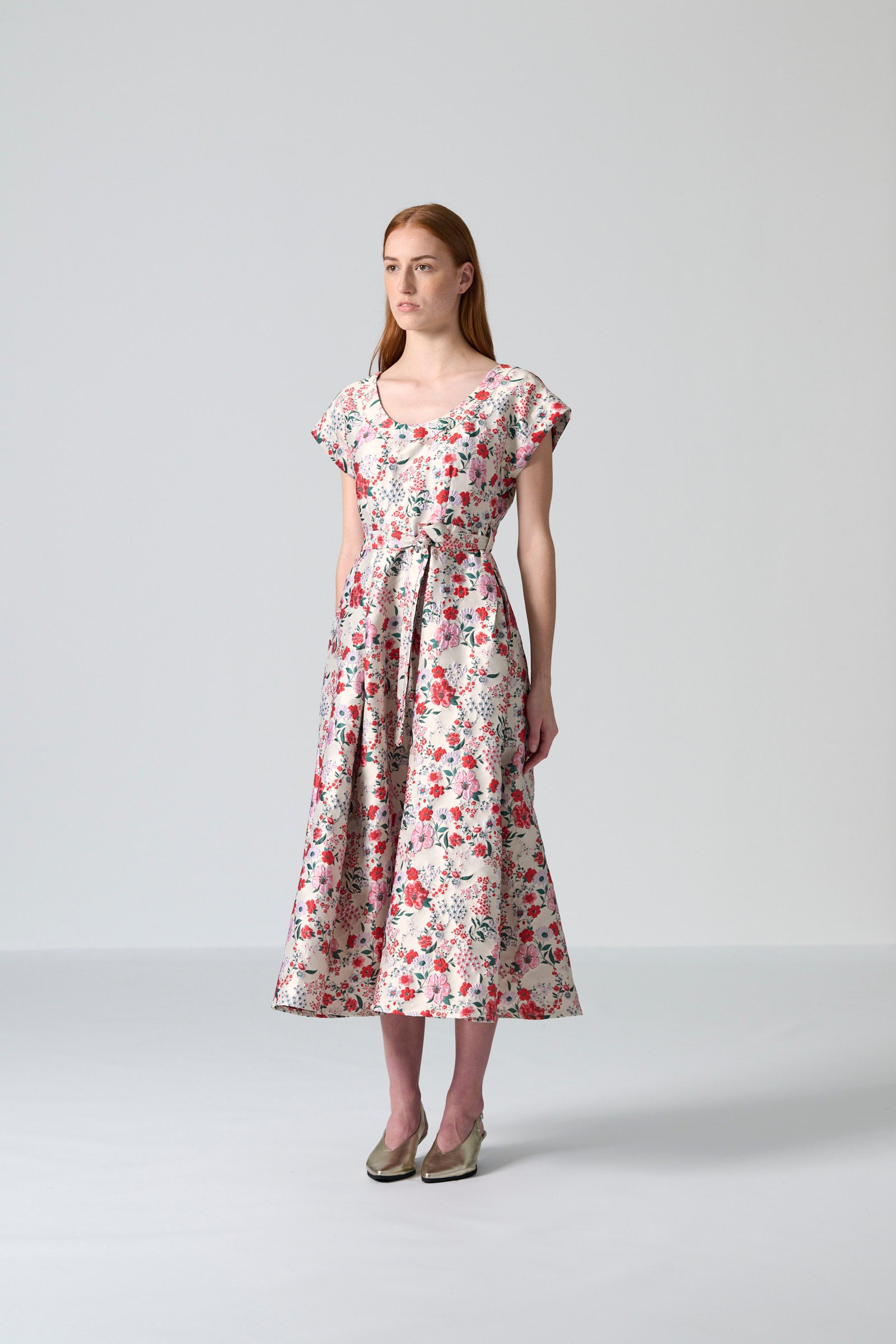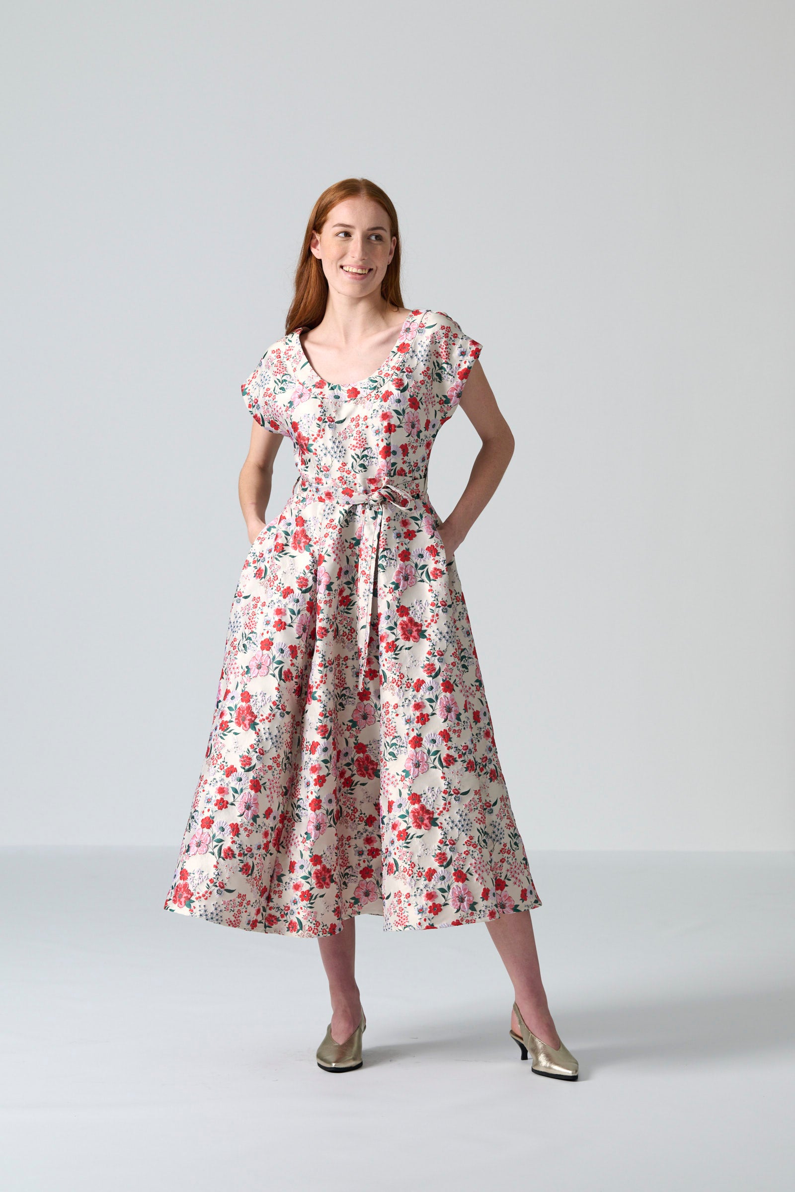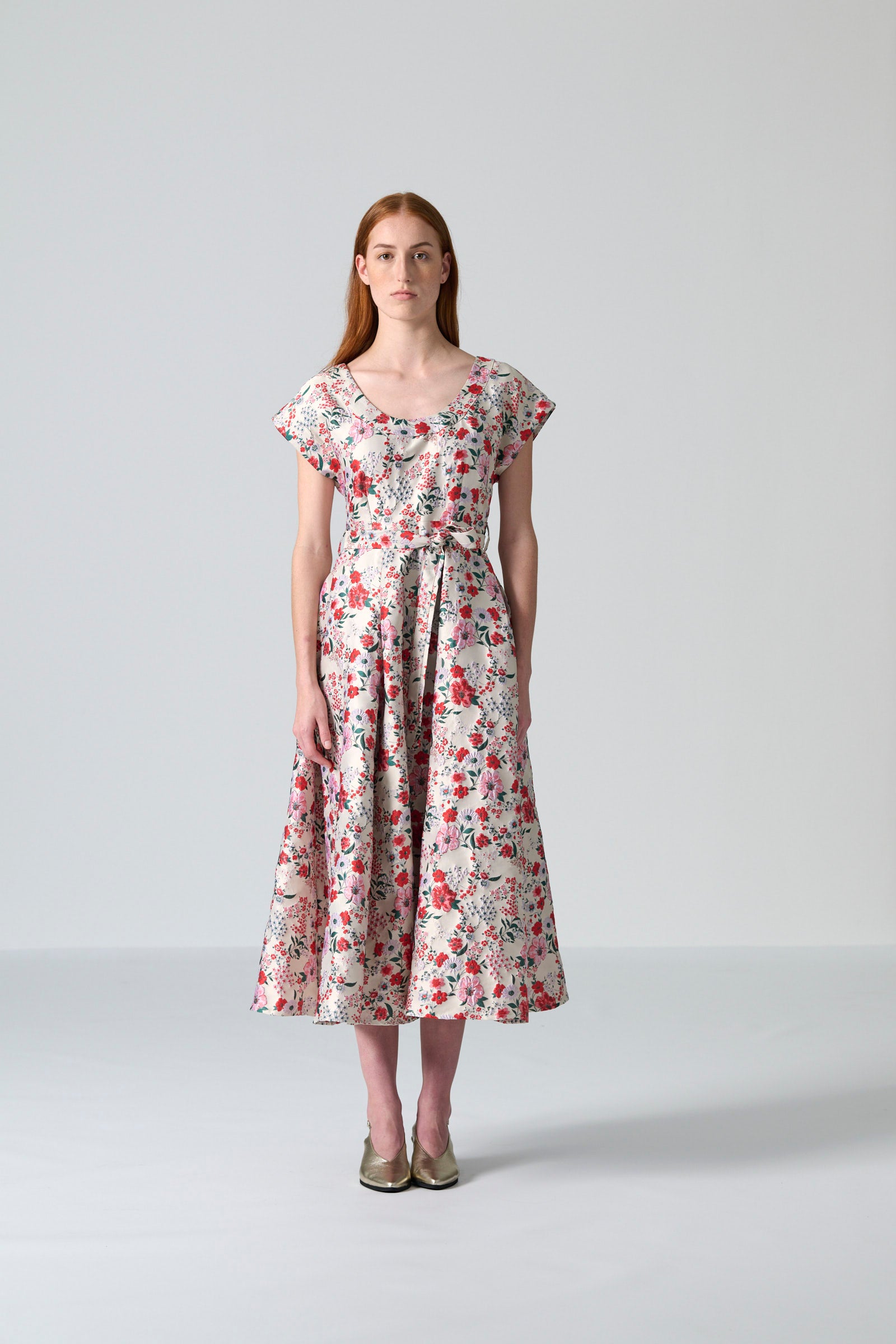The Zenzi dress in red and cream floral brocade offers timeless charm with a beautifully structured silhouette. Crafted from 100% polyester brocade, this midi-length dress features grown-on sleeves and a clean round neckline for an effortlessly refined look. Pleat detailing on both the front and back skirt adds gentle volume and movement, while the self-tie belt allows you to define the waist to your preference.