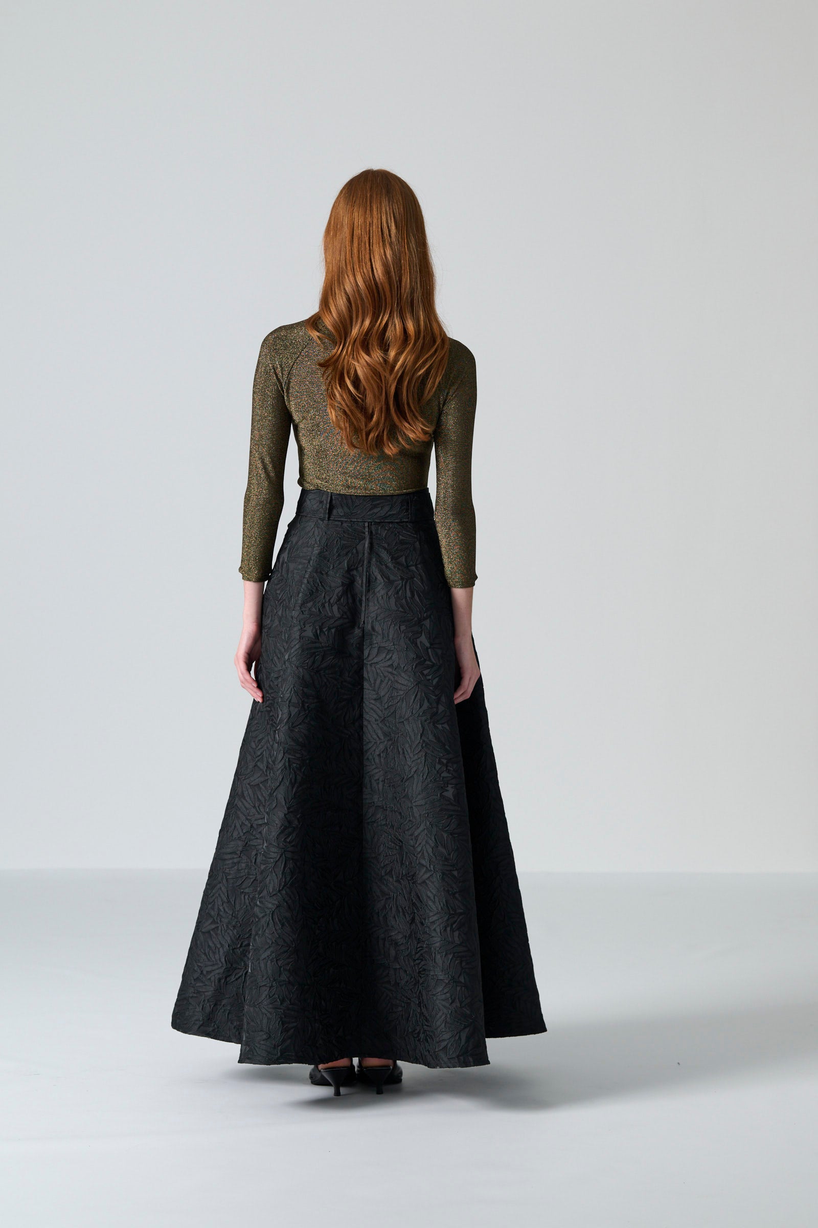 The black and gold lurex knit is soft, stretchy and comfortable, made from a blend of 70% nylon, 24% lurex and 6% spandex. It moves with you while maintaining its shape, making it a versatile piece for layering or wearing on its own.