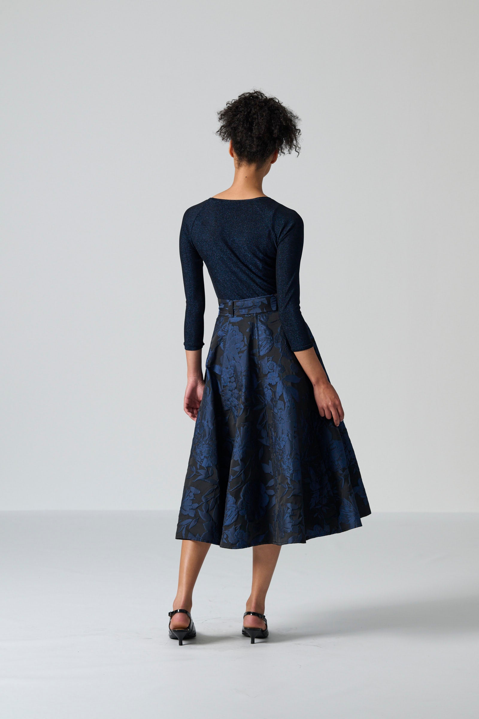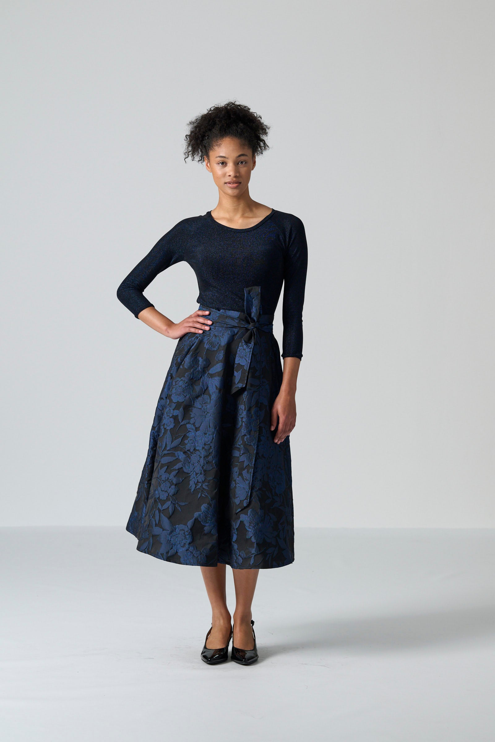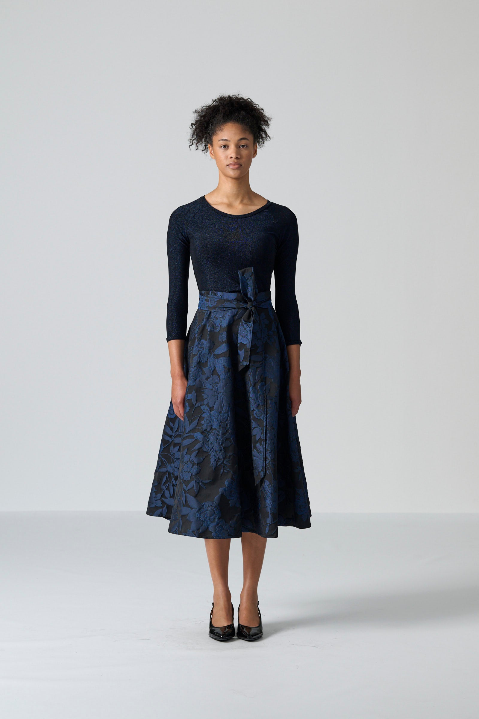 The Sparkle top offers a refined touch of shimmer for everyday wear. With its classic round neckline, fitted silhouette and three quarter sleeves, it balances comfort with a sleek, polished shape. The subtle navy lurex woven through the black knit adds a sophisticated glow, creating a look that transitions effortlessly from daytime styling to evening occasions.