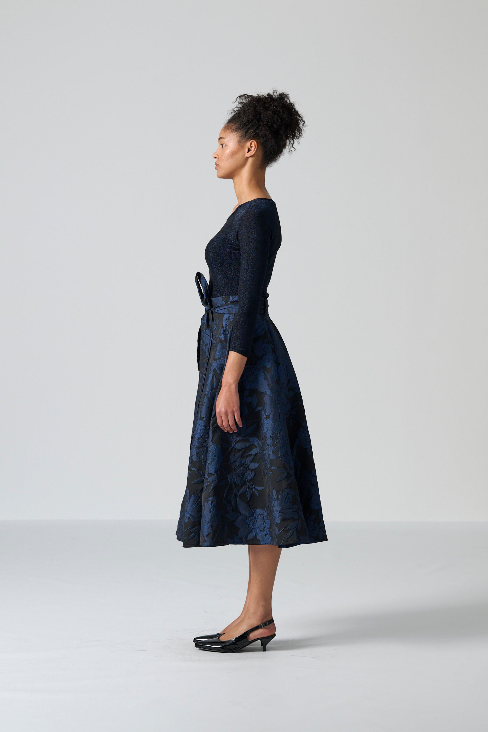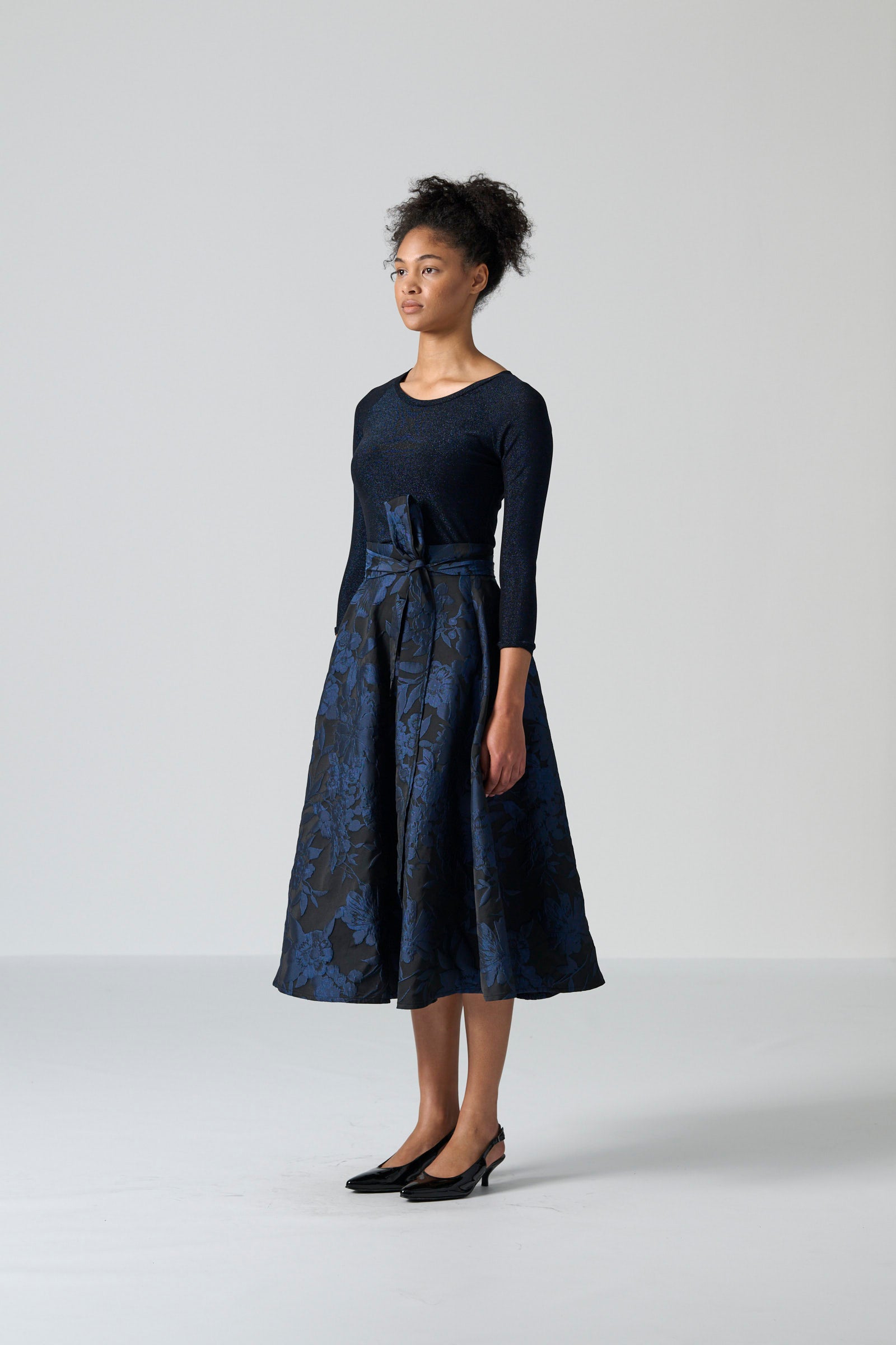 The black and navy lurex knit is soft, stretchy and comfortable, crafted from a blend of 70% nylon, 24% lurex and 6% spandex. It provides gentle structure while allowing ease of movement, making it a versatile staple in any wardrobe.