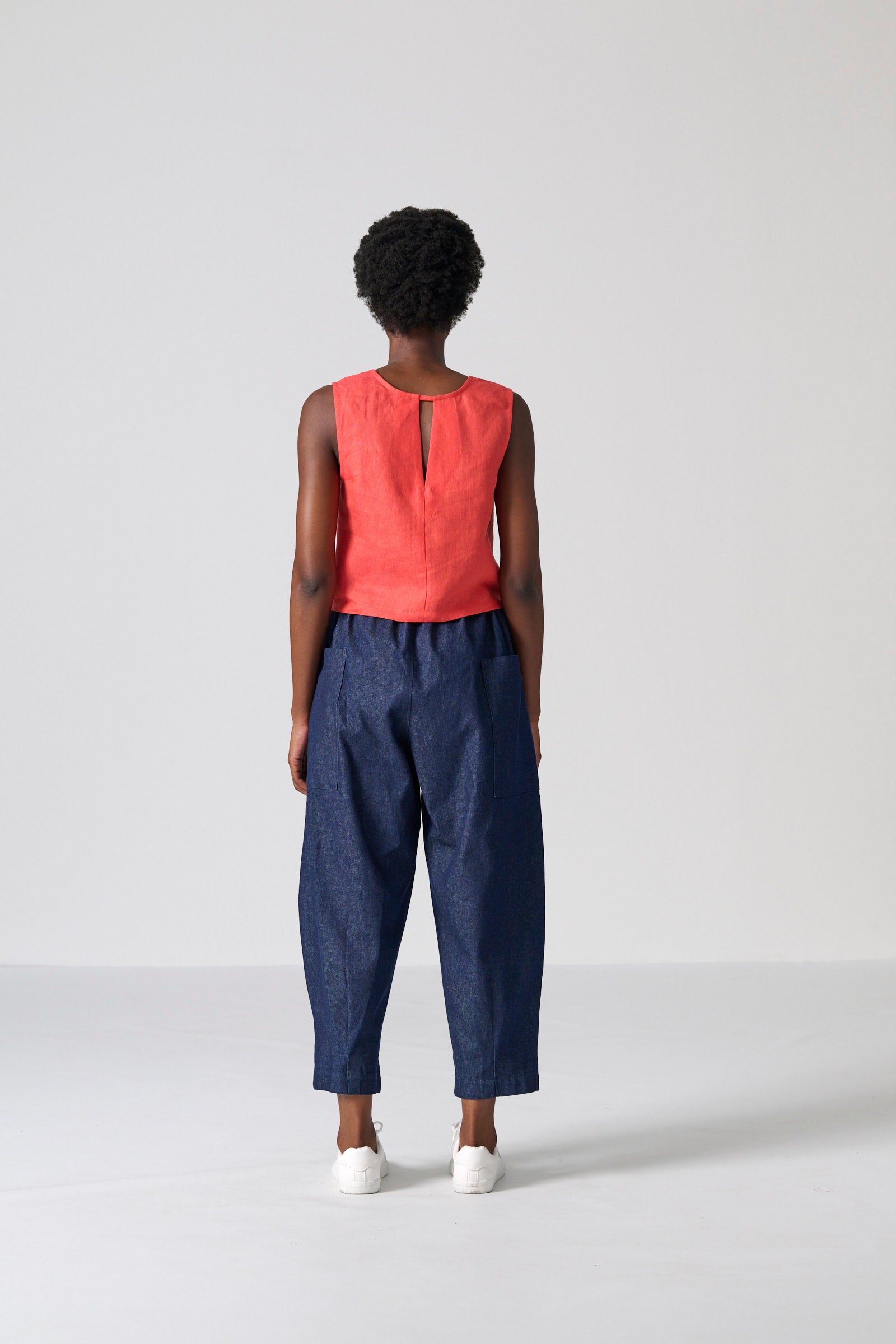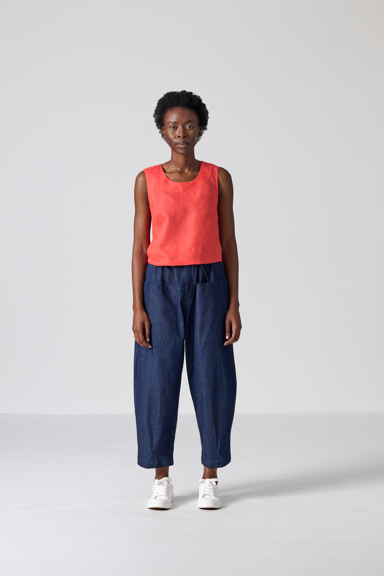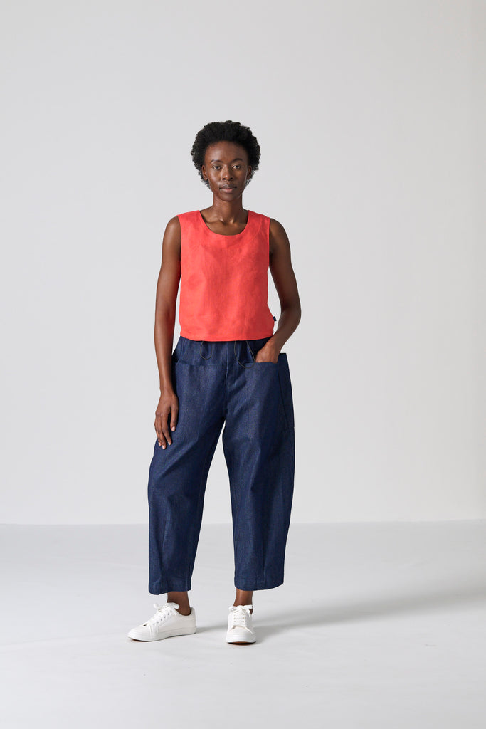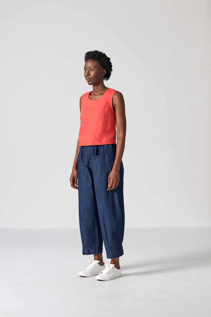 The Cross Top is designed for effortless versatility, offering a clean, modern silhouette in a breathable orange chambray slub-weave linen. Cut in a sleeveless, boxy shape, it features a round neckline and a neat finish just below the waist, striking the perfect balance between structured and relaxed for easy, everyday styling.