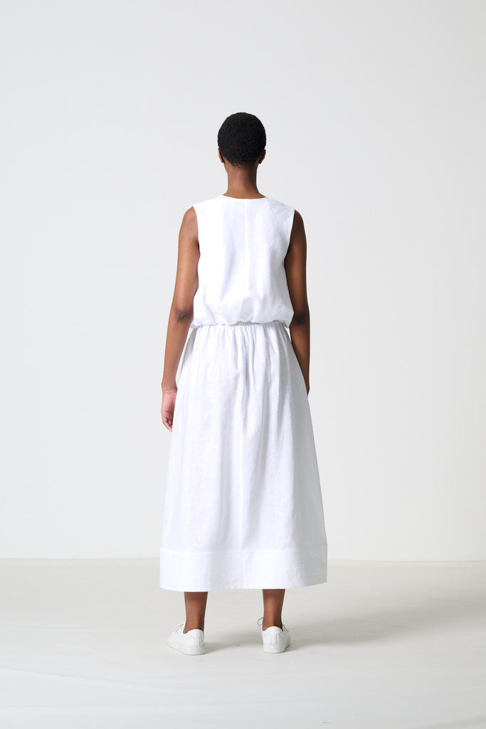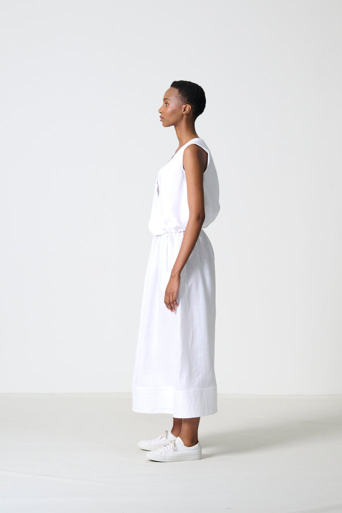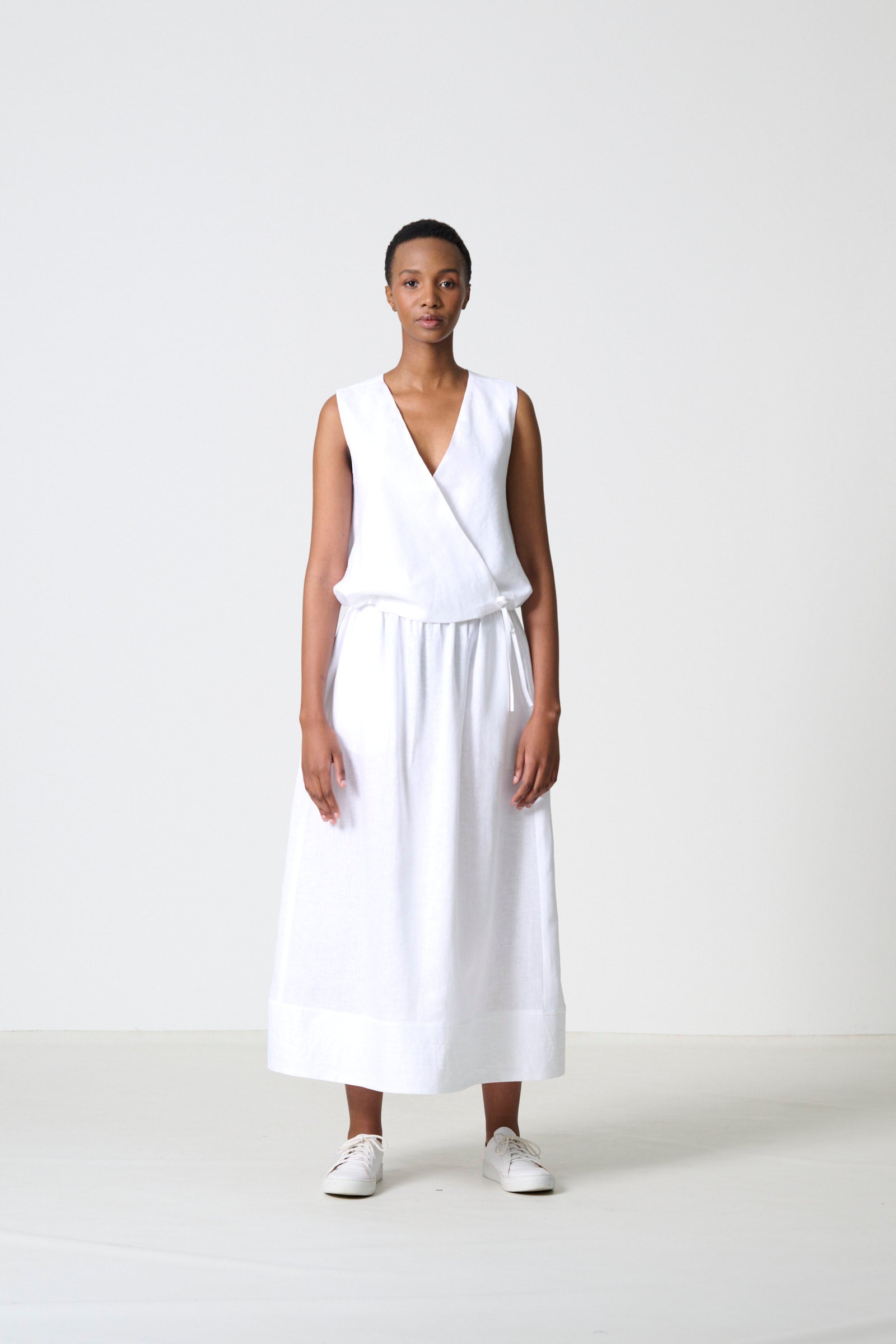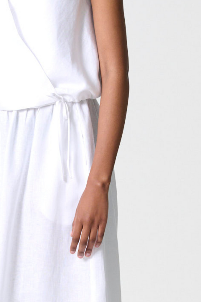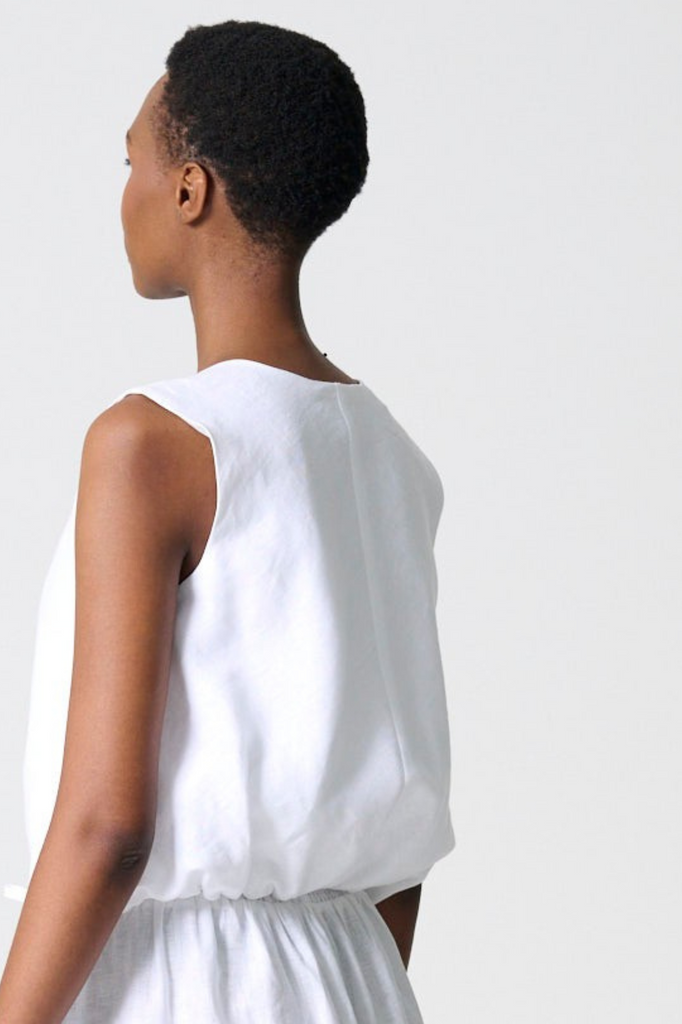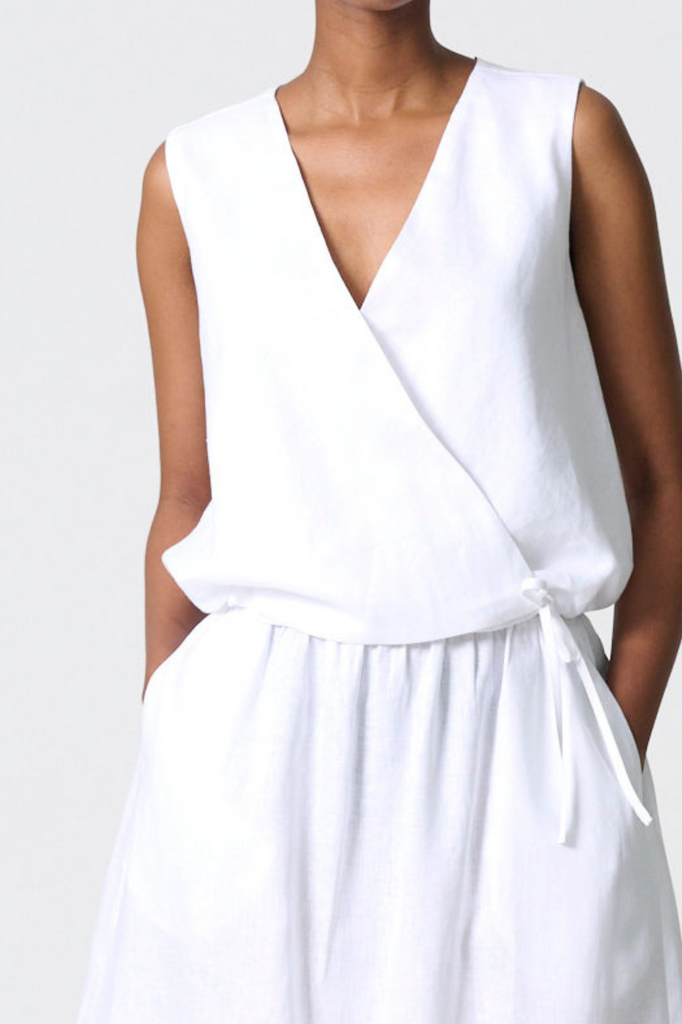 The Whisper is a garment key for your wardrobe; this sleeveless wrap top is designed to flatter with its feminine lines and ease of movement. Crafted from white slub weave 100% linen, it features a narrow elasticated back and side tie detail for a refined yet effortless fit.