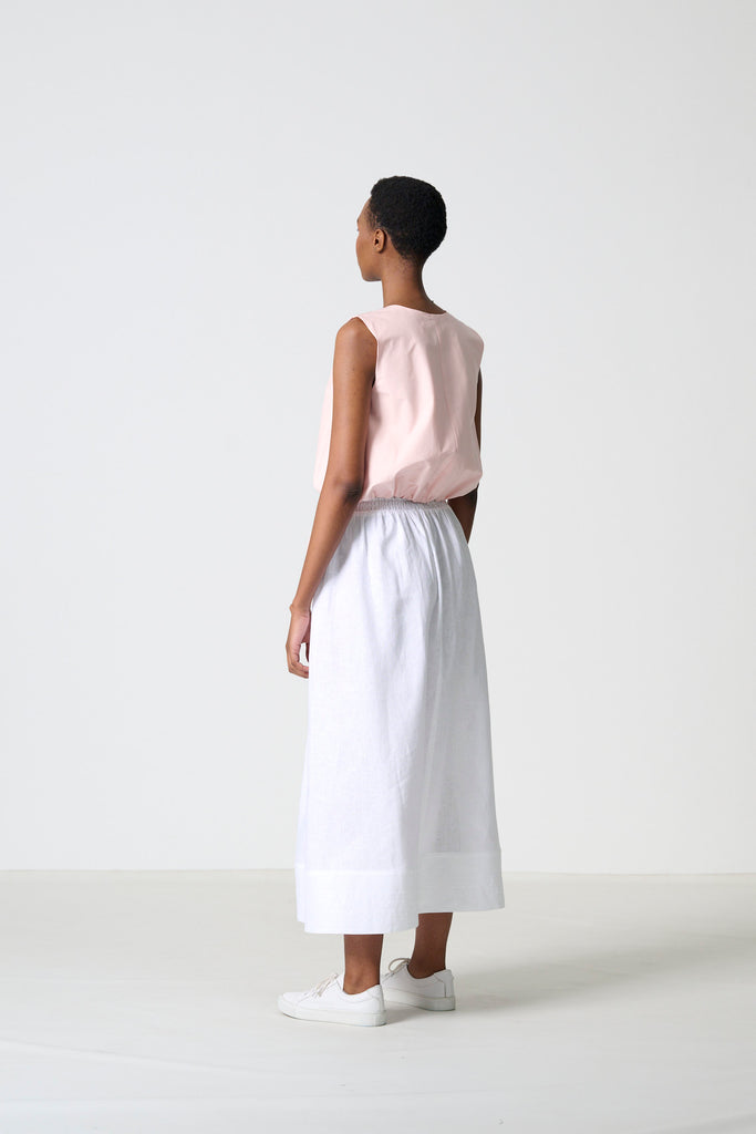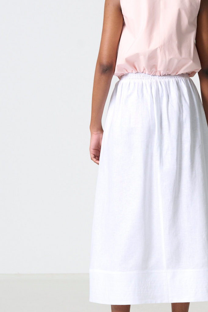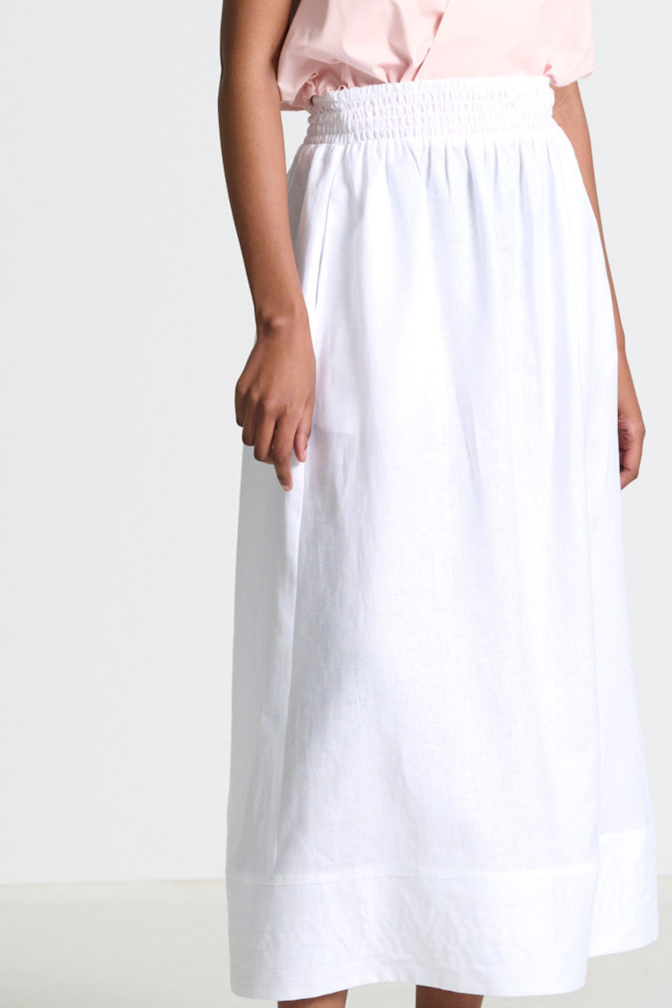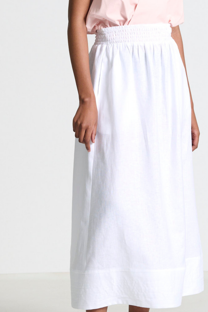 Ada is a garment key for your wardrobe; its full maxi length and shirred elasticated waist create ease of wear while maintaining a refined silhouette. Crafted from white slub 100% linen, it is finished with side entry pockets and a tucked hem detail.