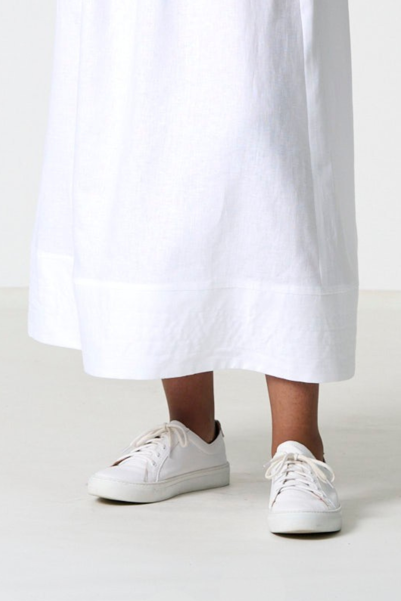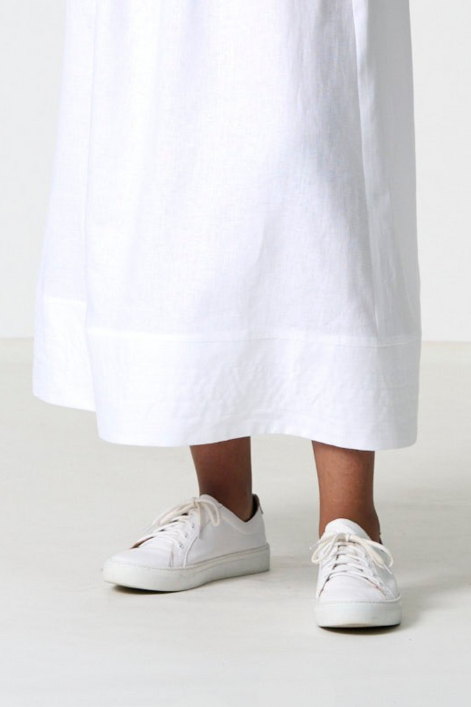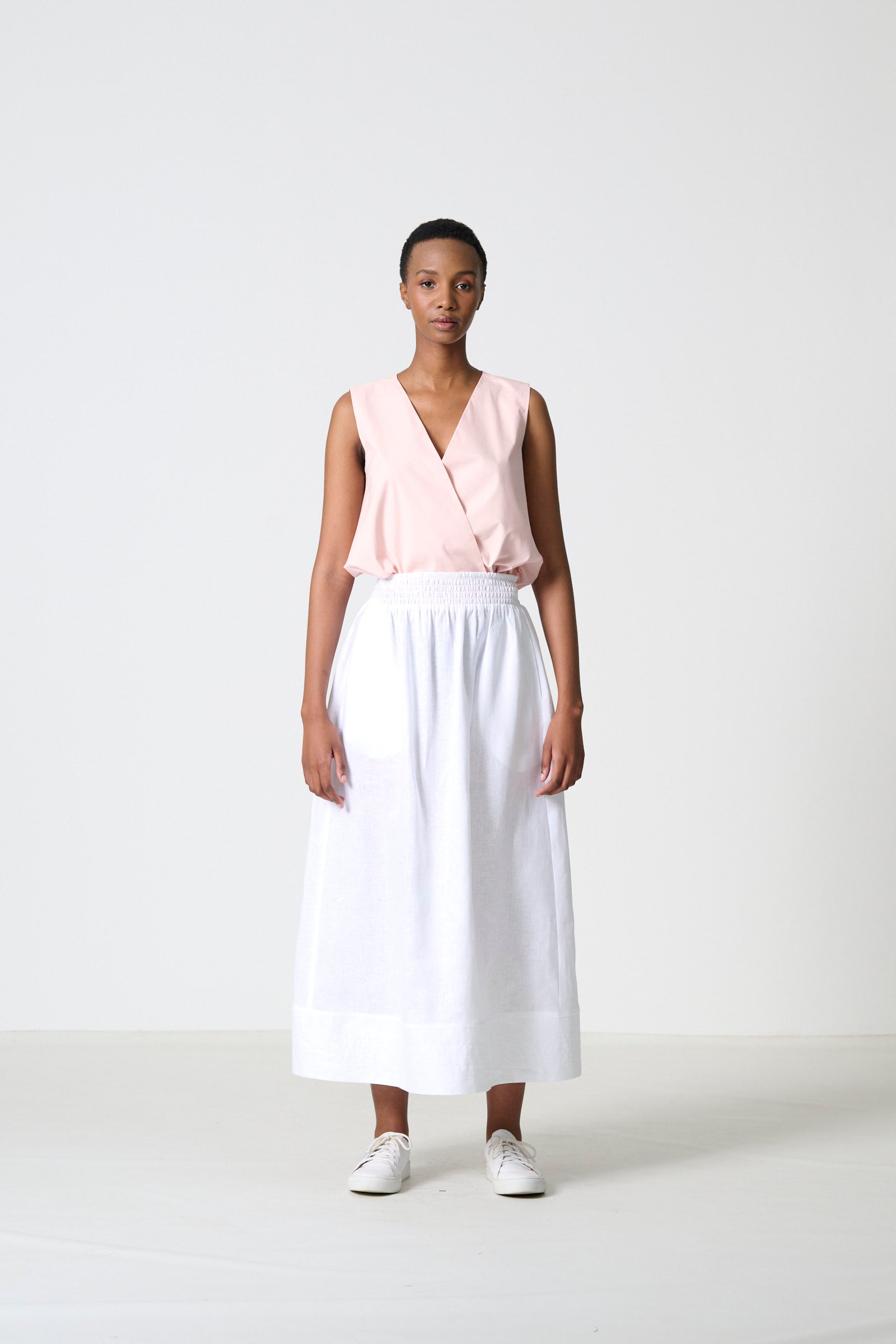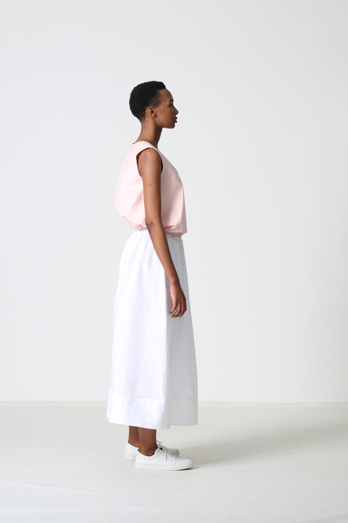 Ada is a garment key for your wardrobe; its full maxi length and shirred elasticated waist create ease of wear while maintaining a refined silhouette. Crafted from white slub 100% linen, it is finished with side entry pockets and a tucked hem detail.