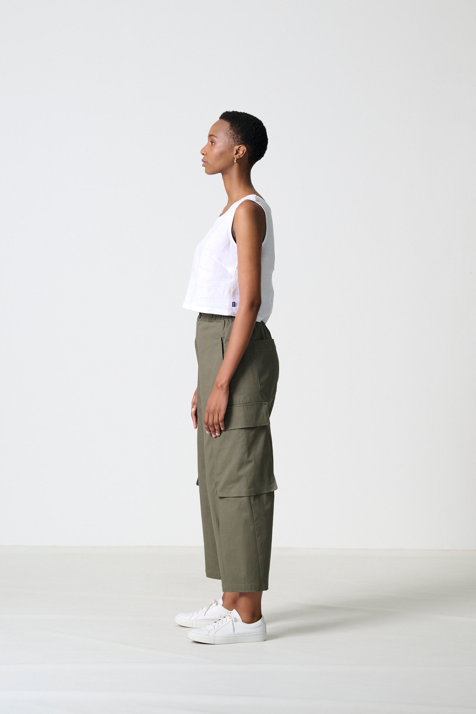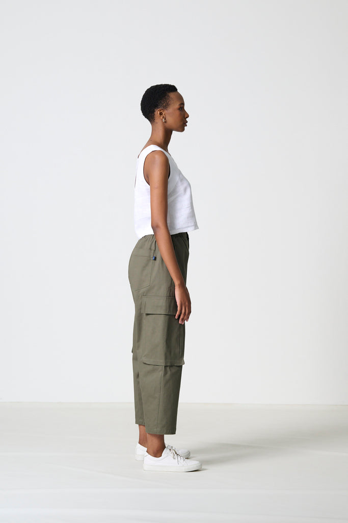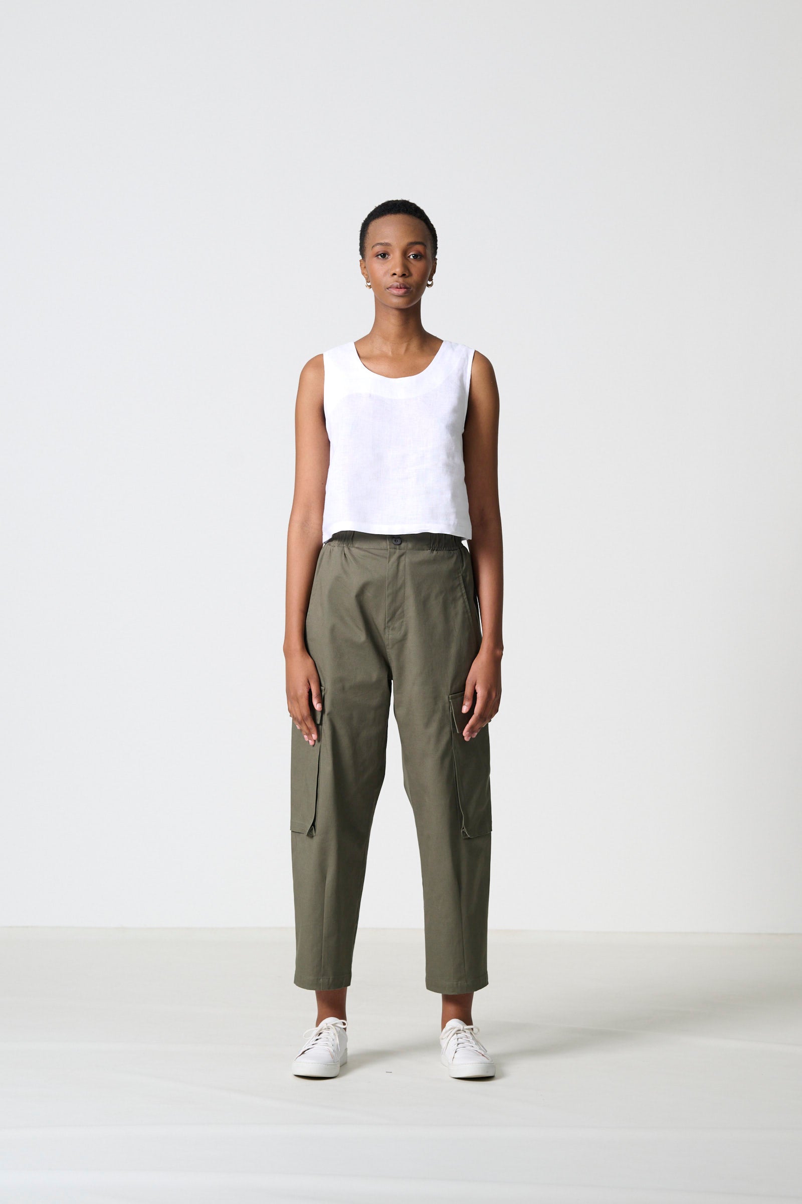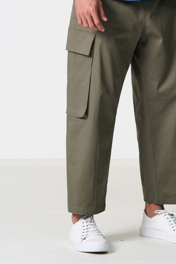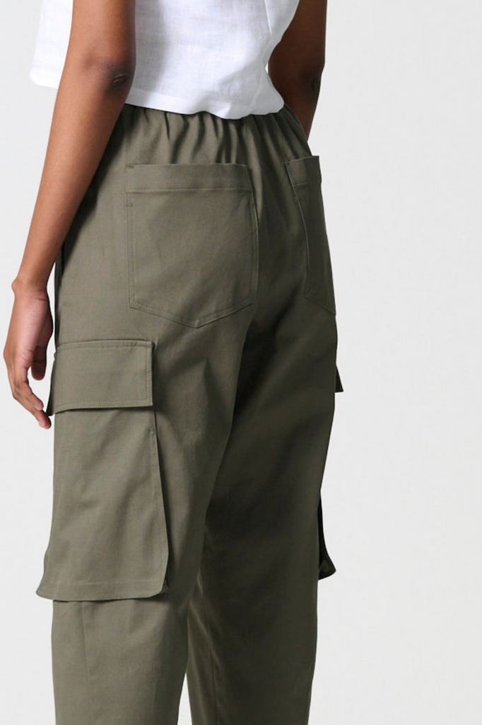 The Ndonsa is a garment key for your wardrobe; the slouchy leg and cargo styling offer effortless utility and ease. Crafted from olive chino cotton with a touch of stretch, it features an elasticated waistband, side entry upper pockets, back patch pockets, a fly front opening, and oversized flap pockets.