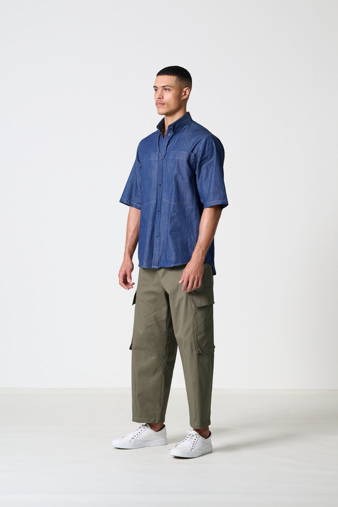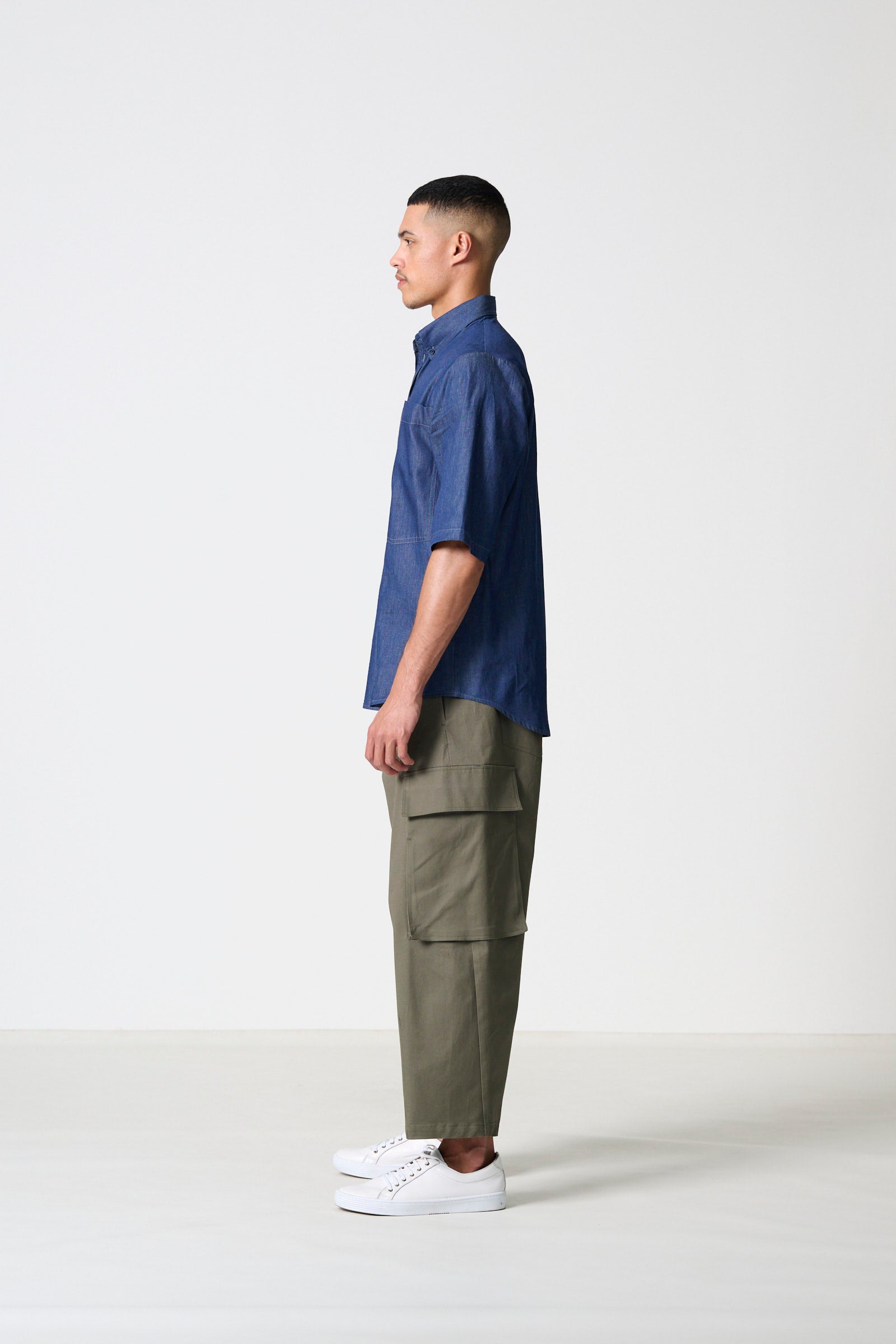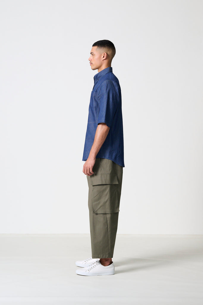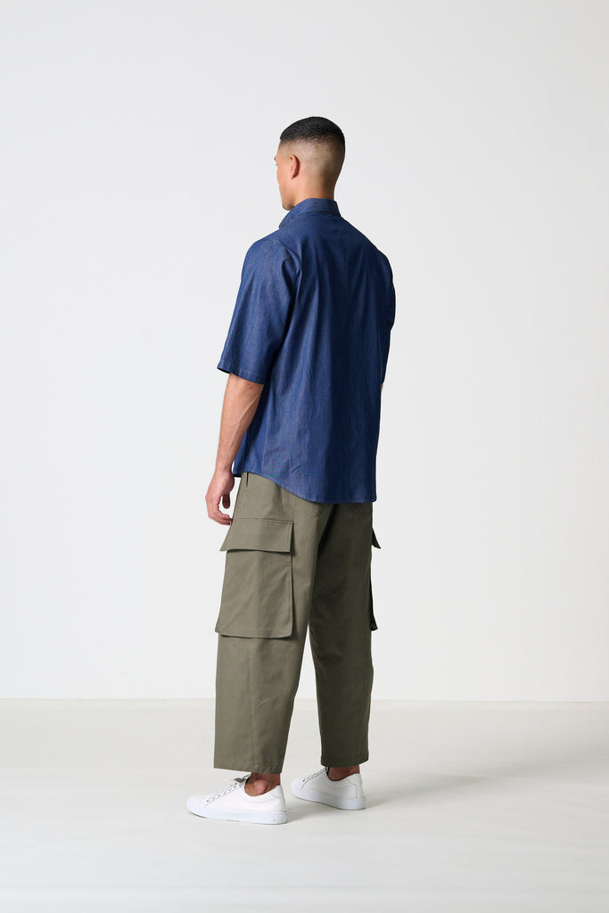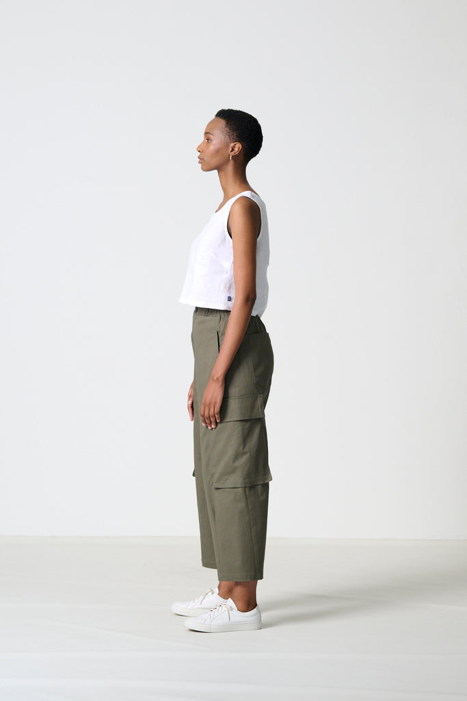 The Ndonsa is a garment key for your wardrobe; the slouchy leg and cargo styling offer effortless utility and ease. Crafted from olive chino cotton with a touch of stretch, it features an elasticated waistband, side entry upper pockets, back patch pockets, a fly front opening, and oversized flap pockets.