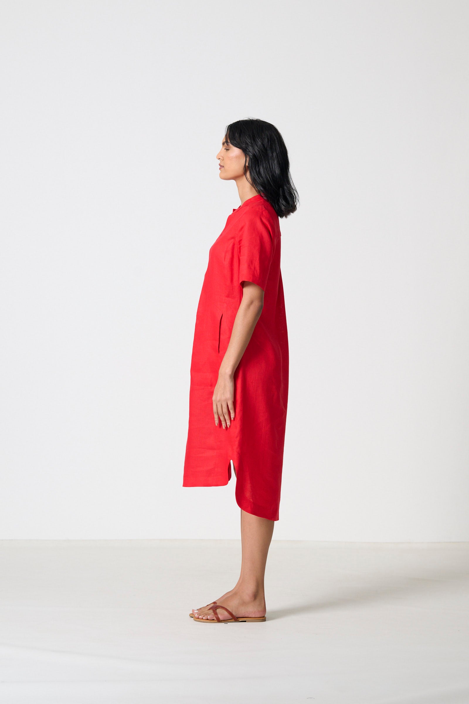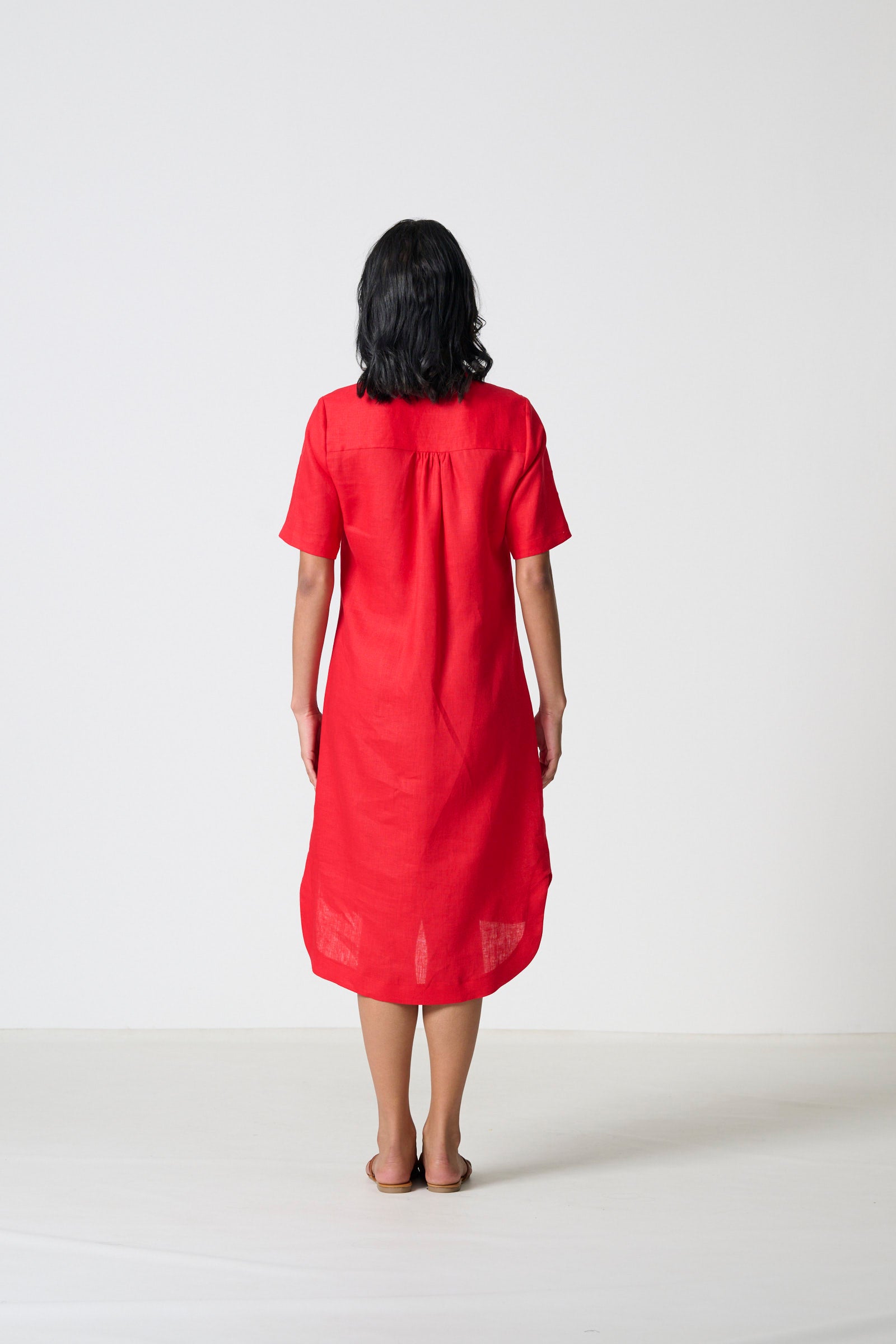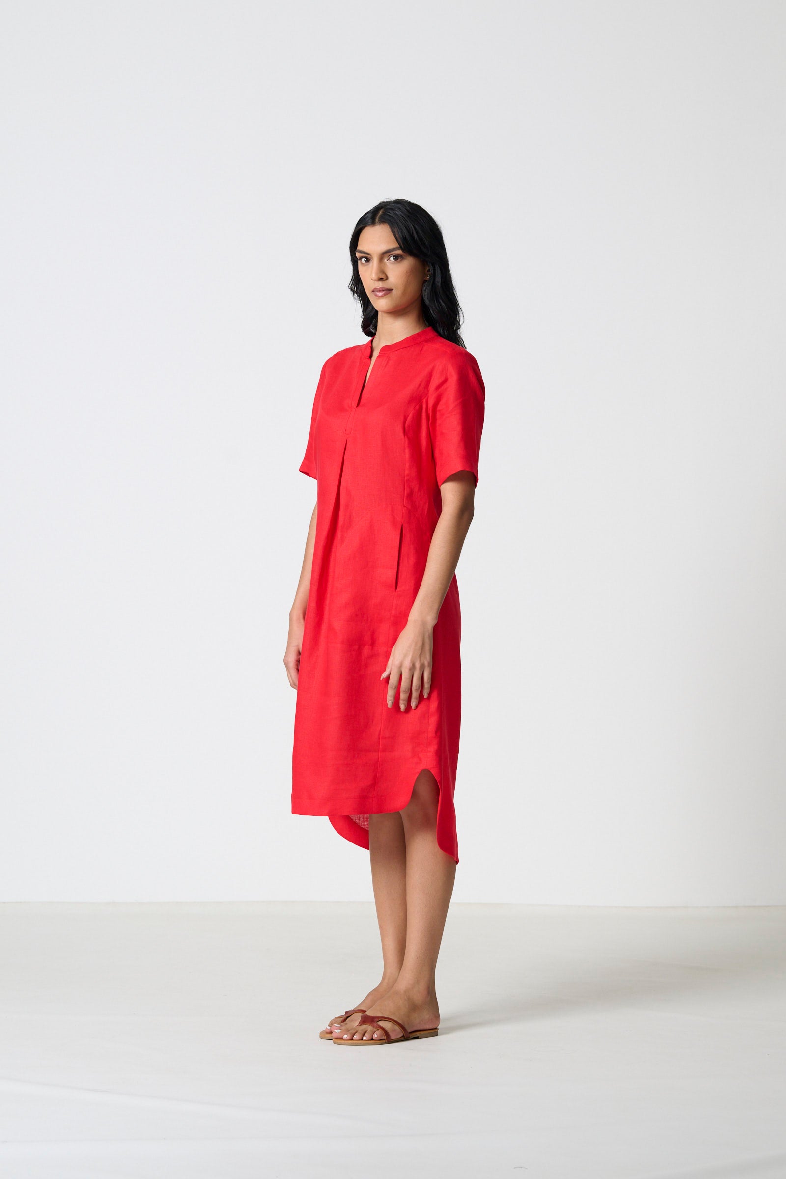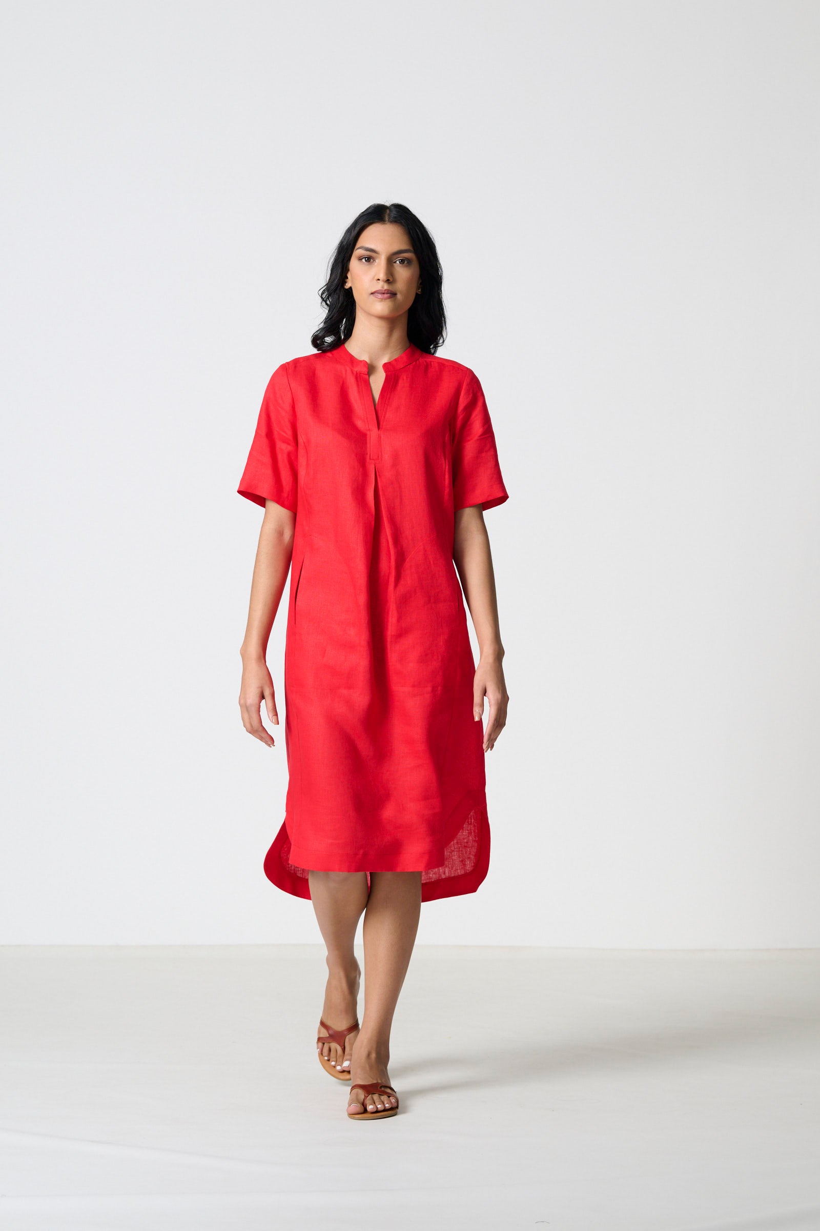 Alli is a relaxed kaftan with a mandarin collar and placket, featuring a centre-front pleat that adds movement and ease. Short sleeves and a gathered back yoke create a soft, fluid shape, while the shaped faced hem and kurta-inspired pockets bring subtle structure and functionality. Crafted in 100% linen with a vibrant red slub weave, Alli is light, breathable, and perfect for effortless day-to-day wear. Available in sizes 32–46, this style is designed to flatter across a wide range of body shapes, making it a versatile wardrobe staple.