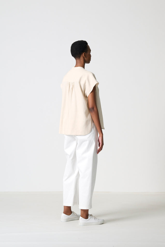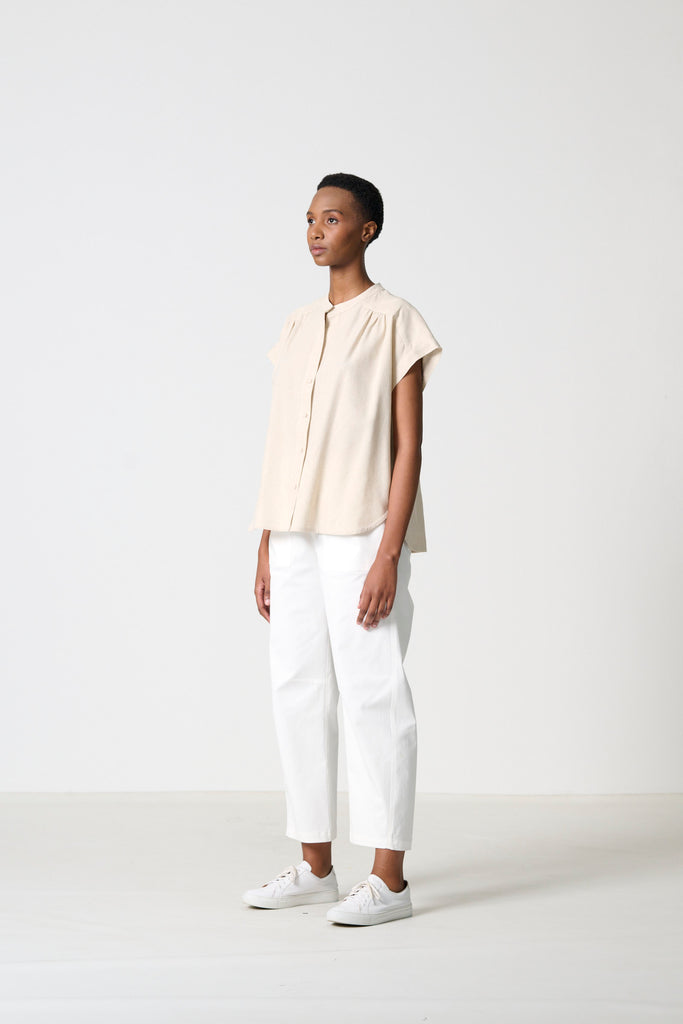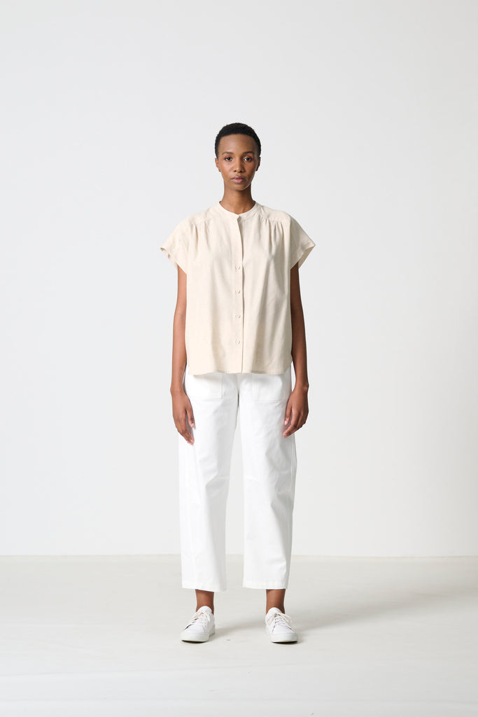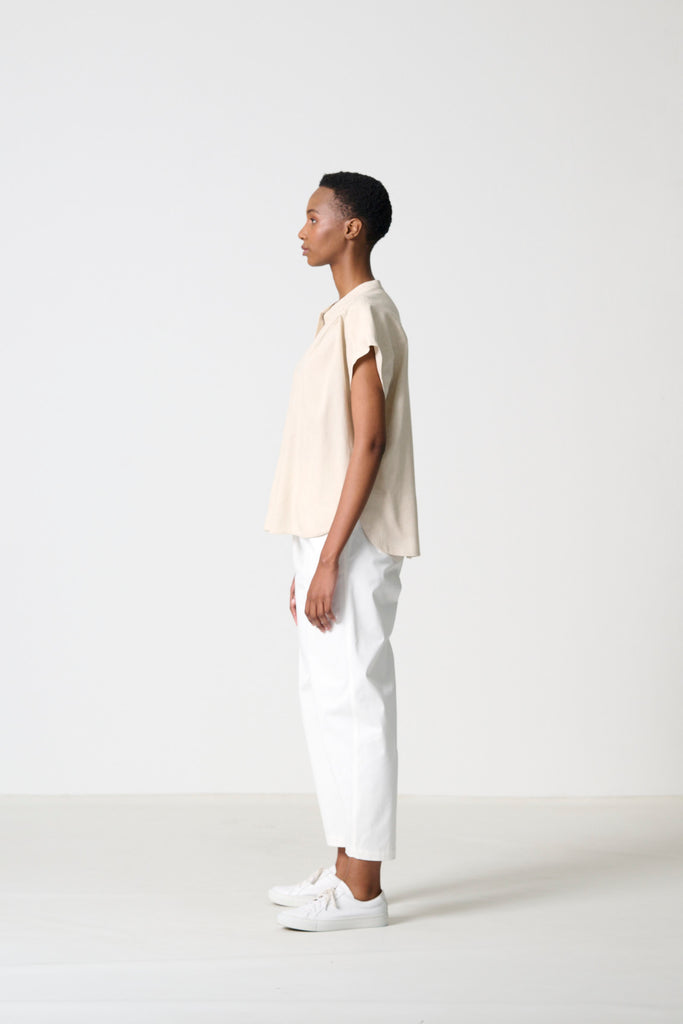 Fresh and versatile, the Arch in white chino cotton is the perfect summer pant. Its relaxed barrel leg and elasticated waist create ease and movement, while the stitched seam and pocket details bring subtle definition. Effortless, cool, and refined for everyday wear.