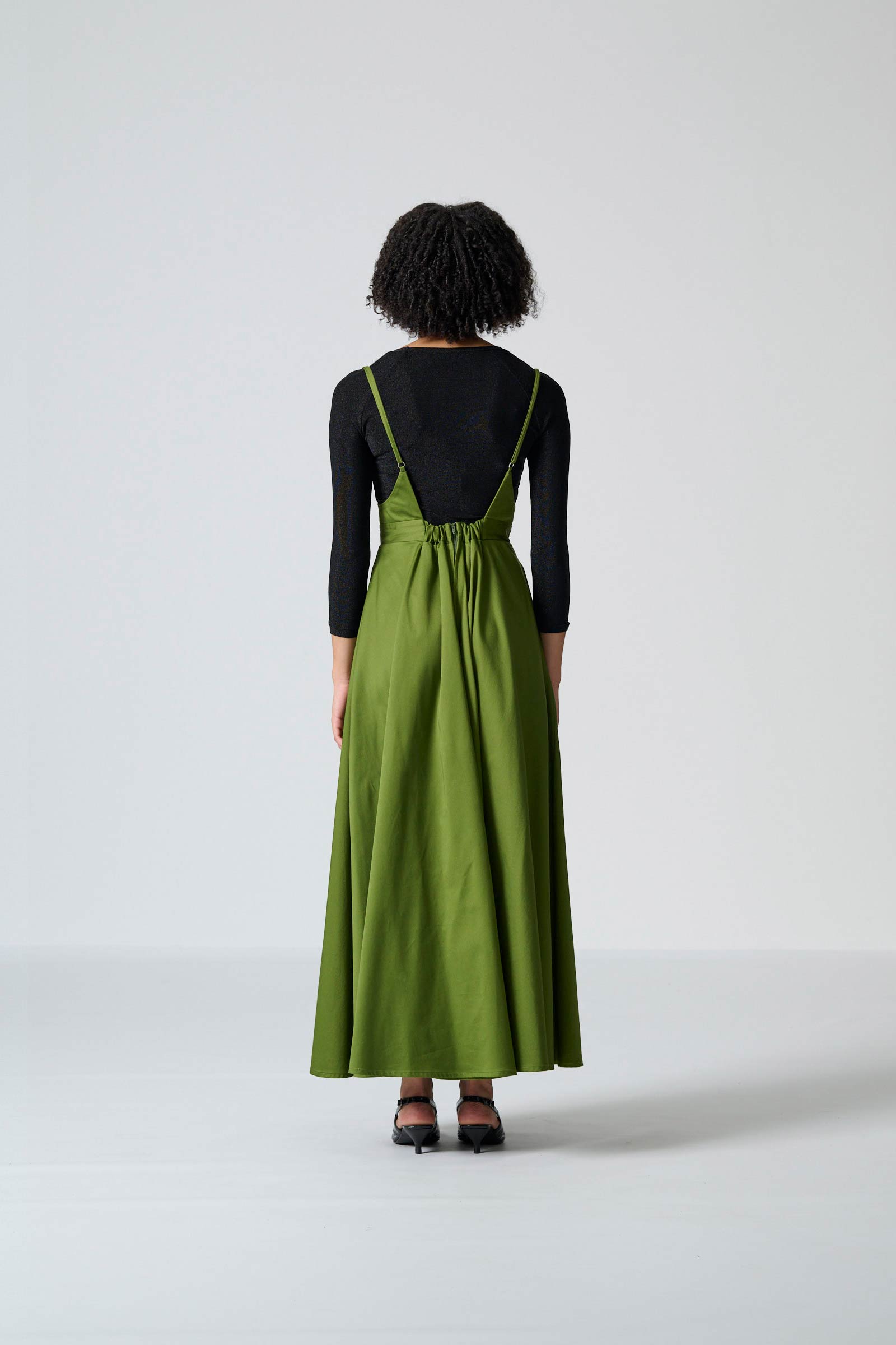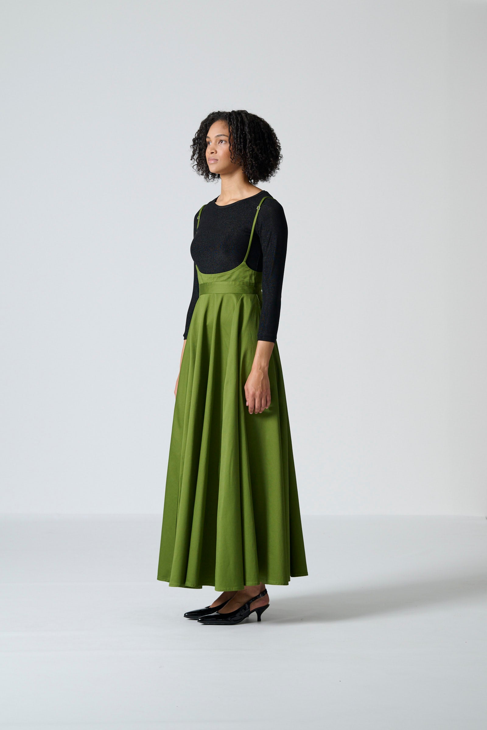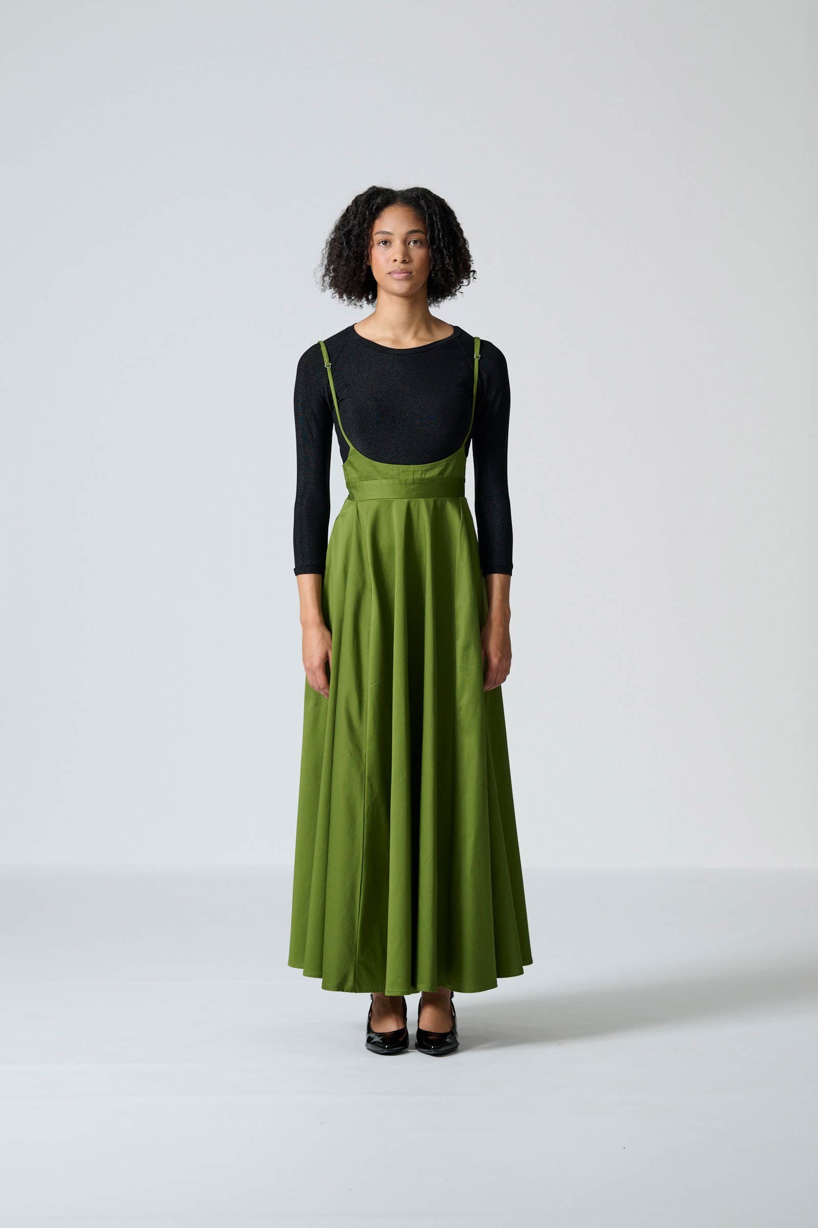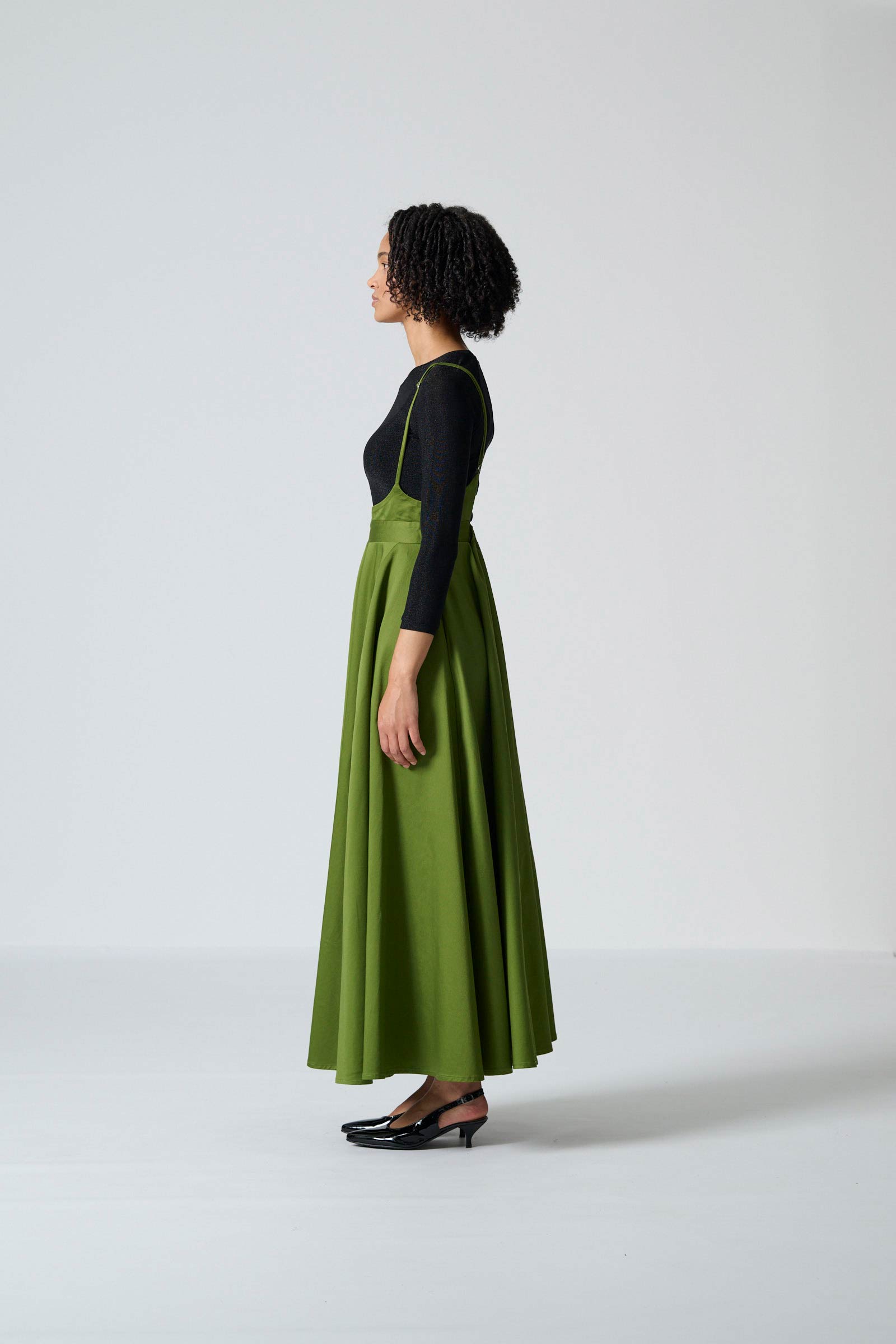 The Gugulethu skirt in olive cotton sateen combines effortless style with comfortable, wearable design. This maxi-length pinafore skirt features thin adjustable straps for a personalised fit, while the elasticated back waistband ensures ease and gentle shaping. Side-entry pockets add subtle practicality without interrupting the clean, streamlined silhouette.