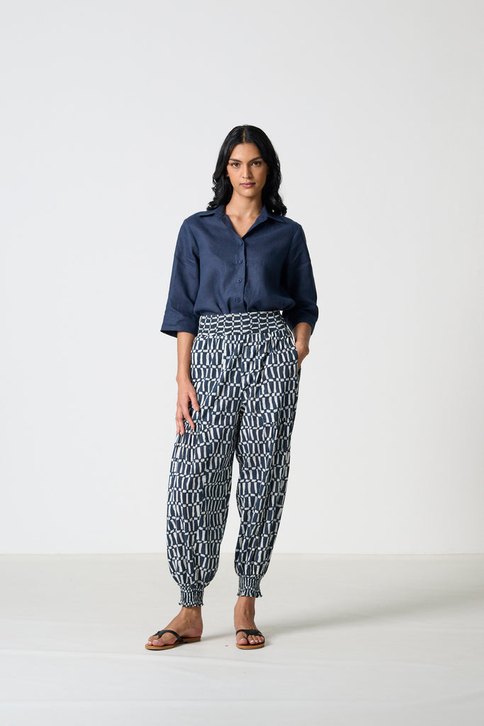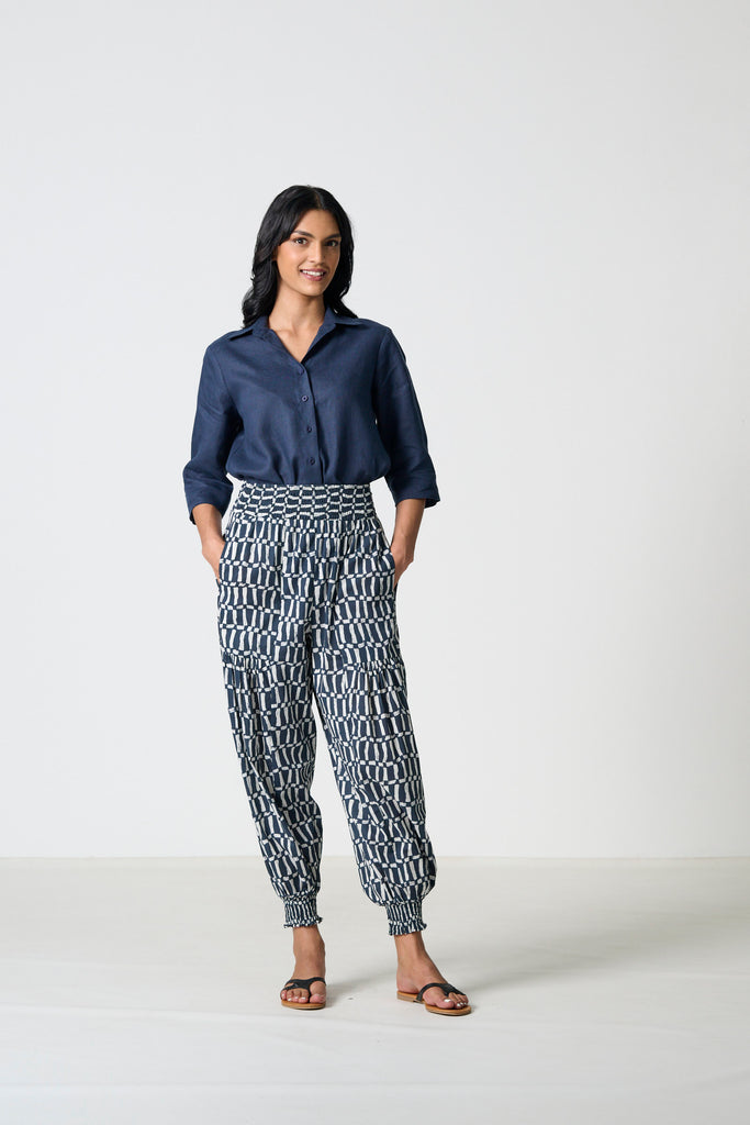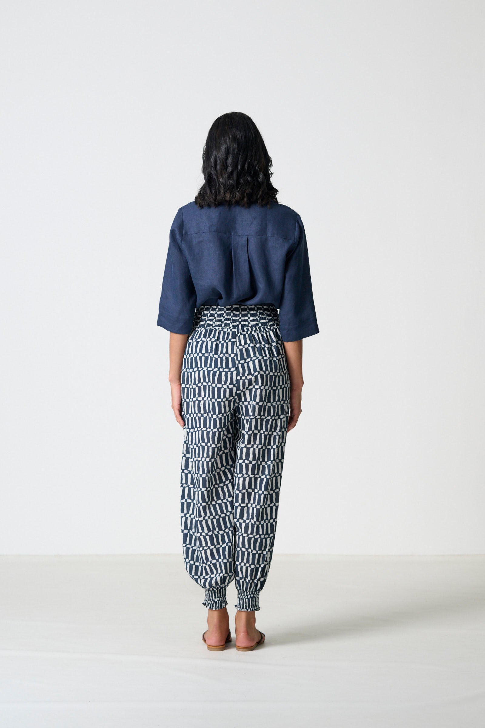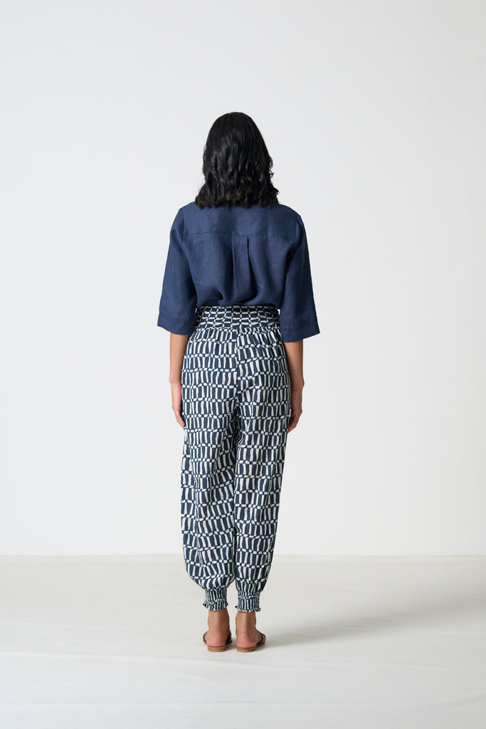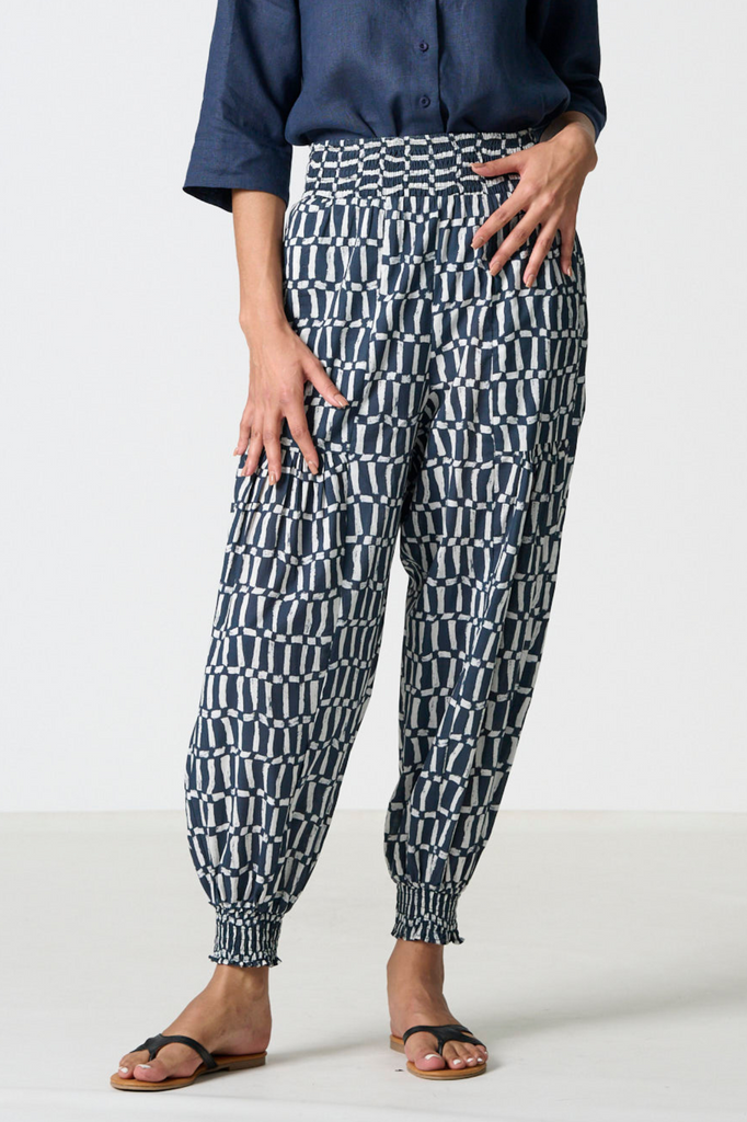 The Maloti pant is designed with ease and versatility in mind. A soft silhouette is anchored by shirring at the waist and ankles, creating gentle texture and comfort while allowing the garment to move fluidly with the body. The cut line with gathered detailing adds shape and dimension, while side entry pockets bring everyday practicality. Crafted in 100% cotton with a navy and white monotone print, Maloti is breathable and adaptable, ideal for relaxed styling or elevated casual wear. Available in sizes 30–40, it offers a flattering fit across a versatile range of sizes.