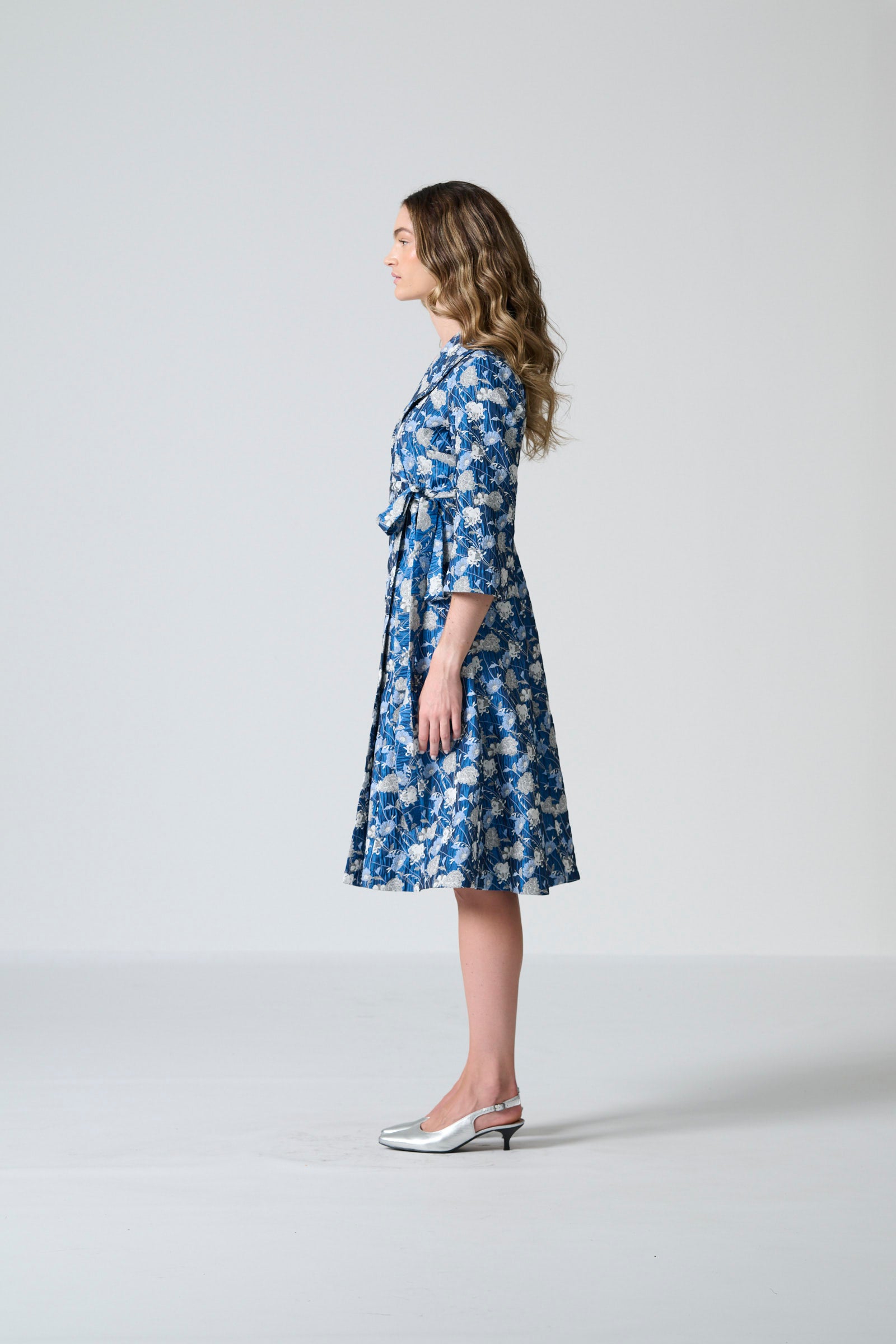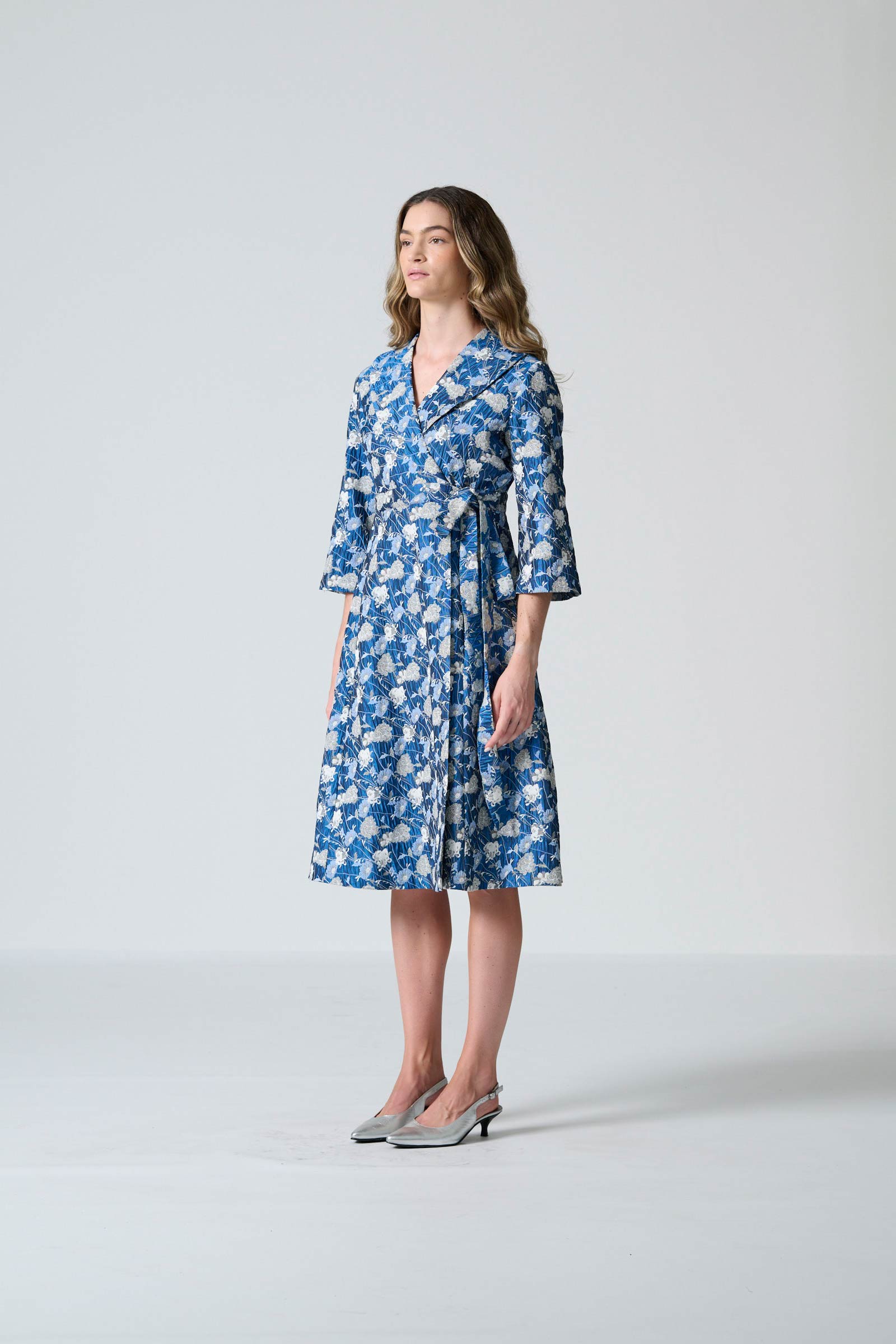 The Rivonia dress in blue and white brocade brings refined elegance to a striking occasion silhouette. Designed as a fully lined wrap coat dress, it features three-quarter kimono-style sleeves and a shaped shawl collar that creates a dramatic yet sophisticated look. The wrap design offers a flattering fit, while side entry pockets add subtle practicality without interrupting the clean lines of the garment.
