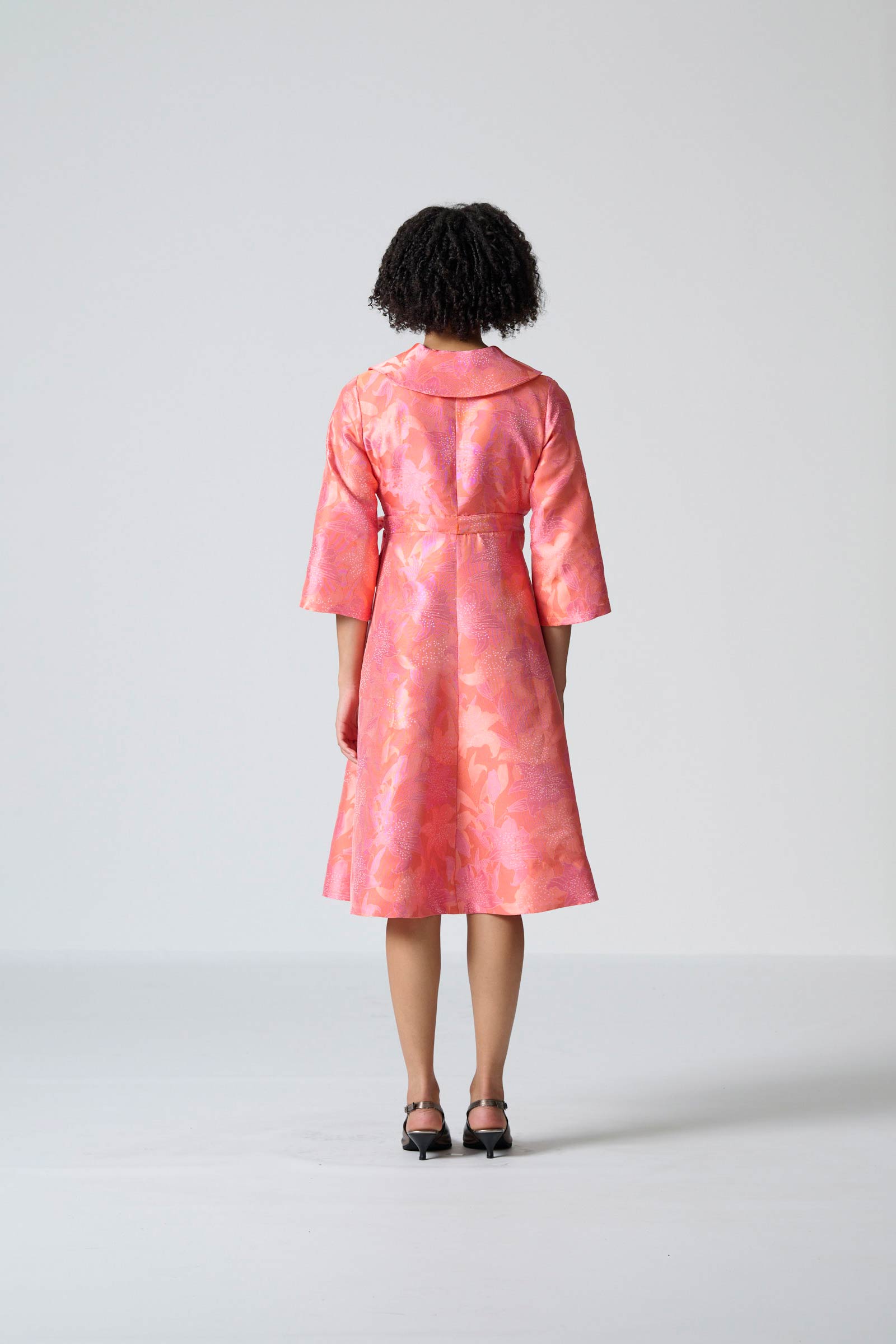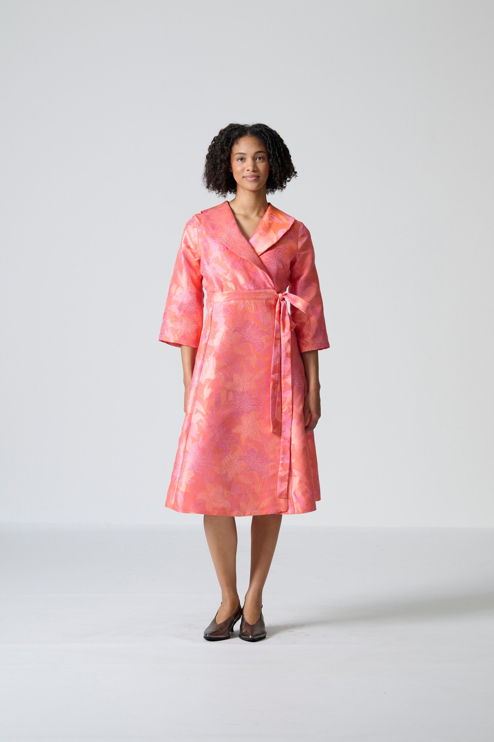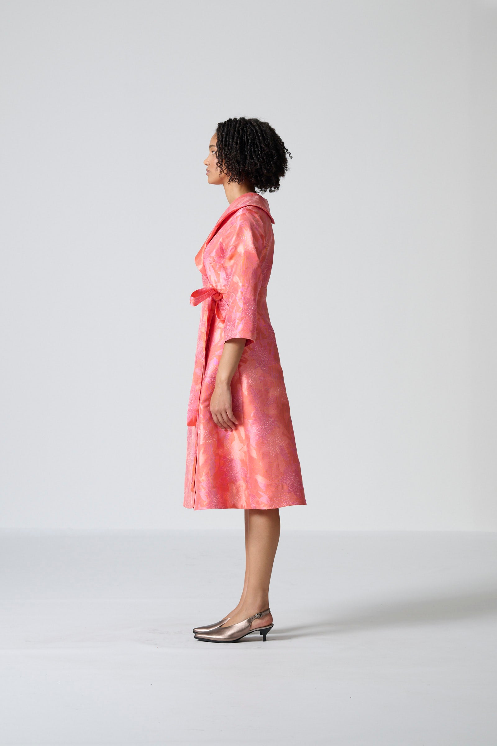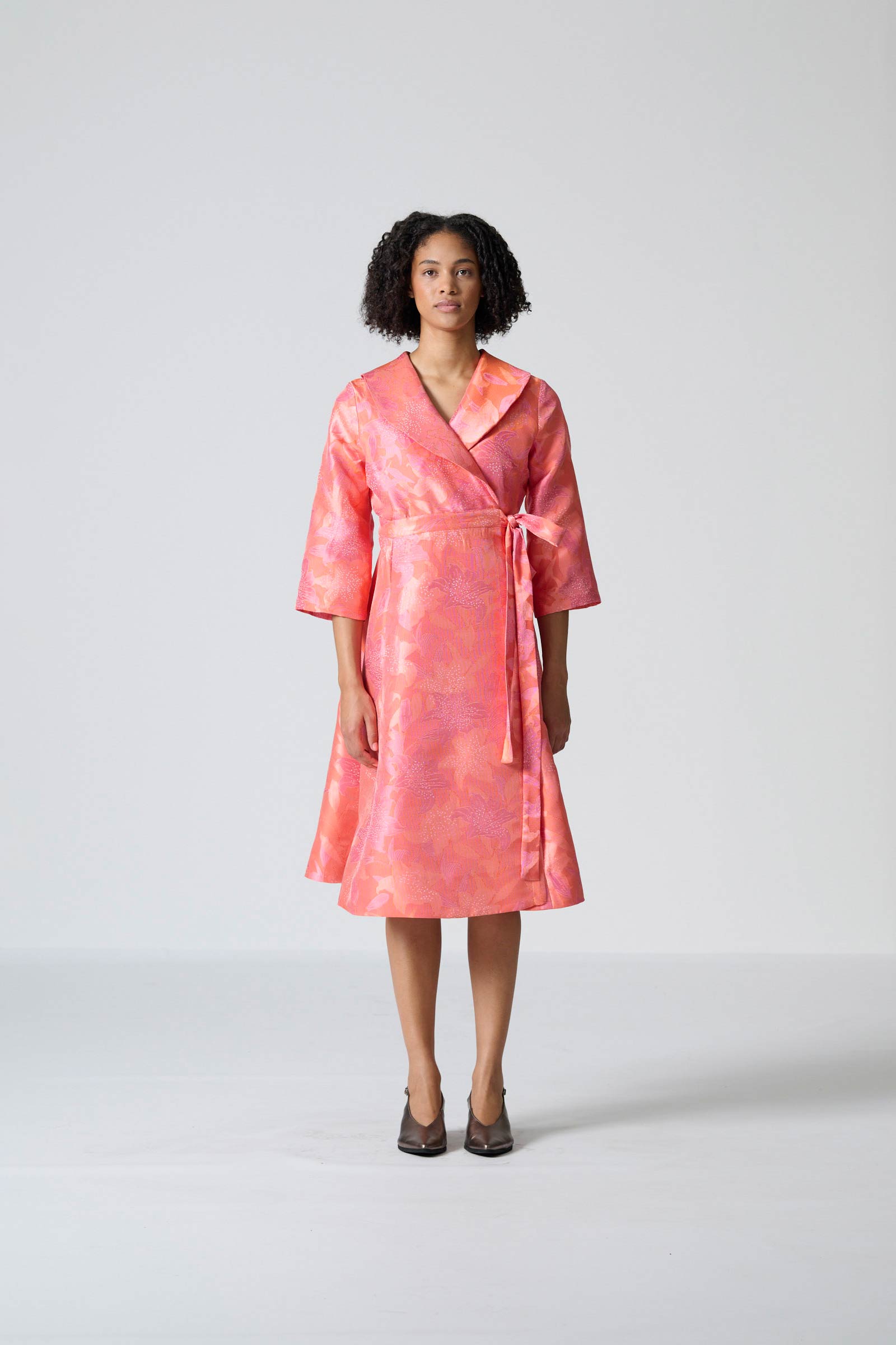 The Rivonia dress in pink and orange brocade brings vibrant elegance to a refined occasion silhouette. Designed as a wrap coat dress, it features a lined bodice, three-quarter kimono-style sleeves and a shaped shawl collar that creates a sophisticated, structured look. The wrap design allows for a flattering fit, while side entry pockets add subtle practicality. Falling to just below the knee, the length enhances its polished, versatile appeal.
