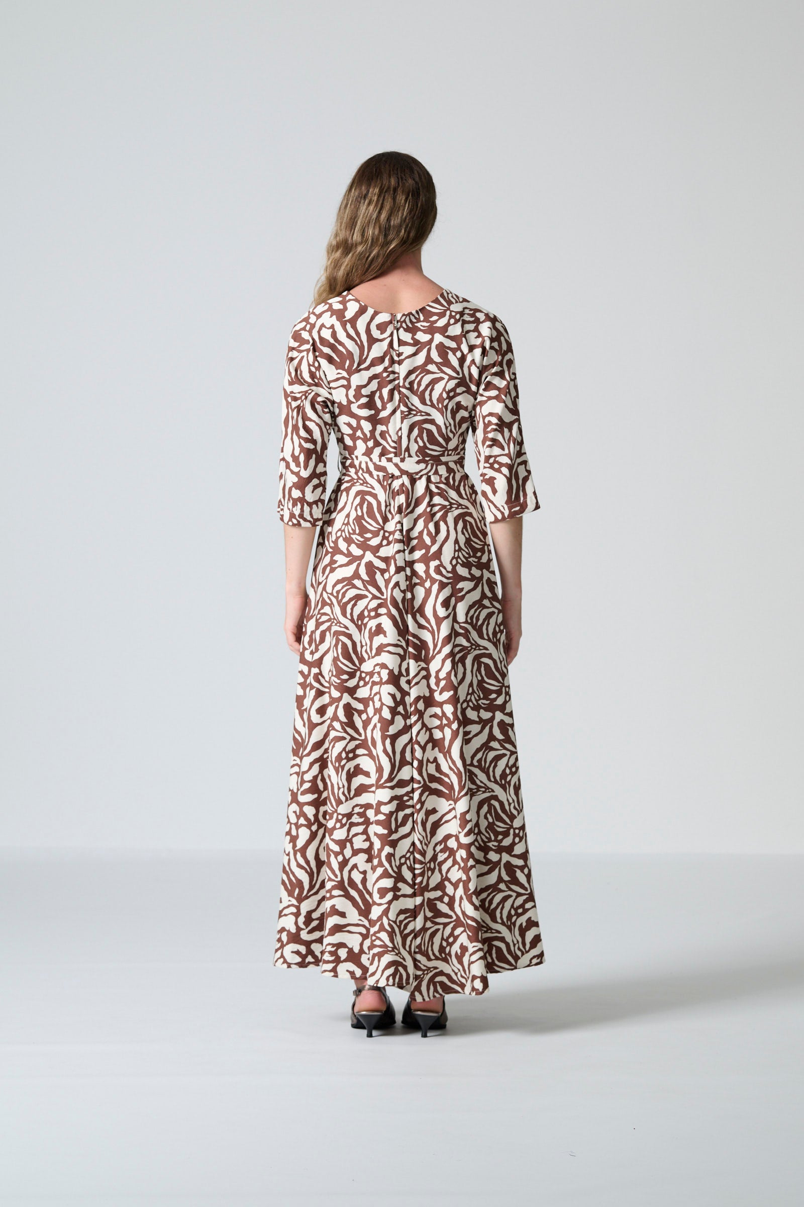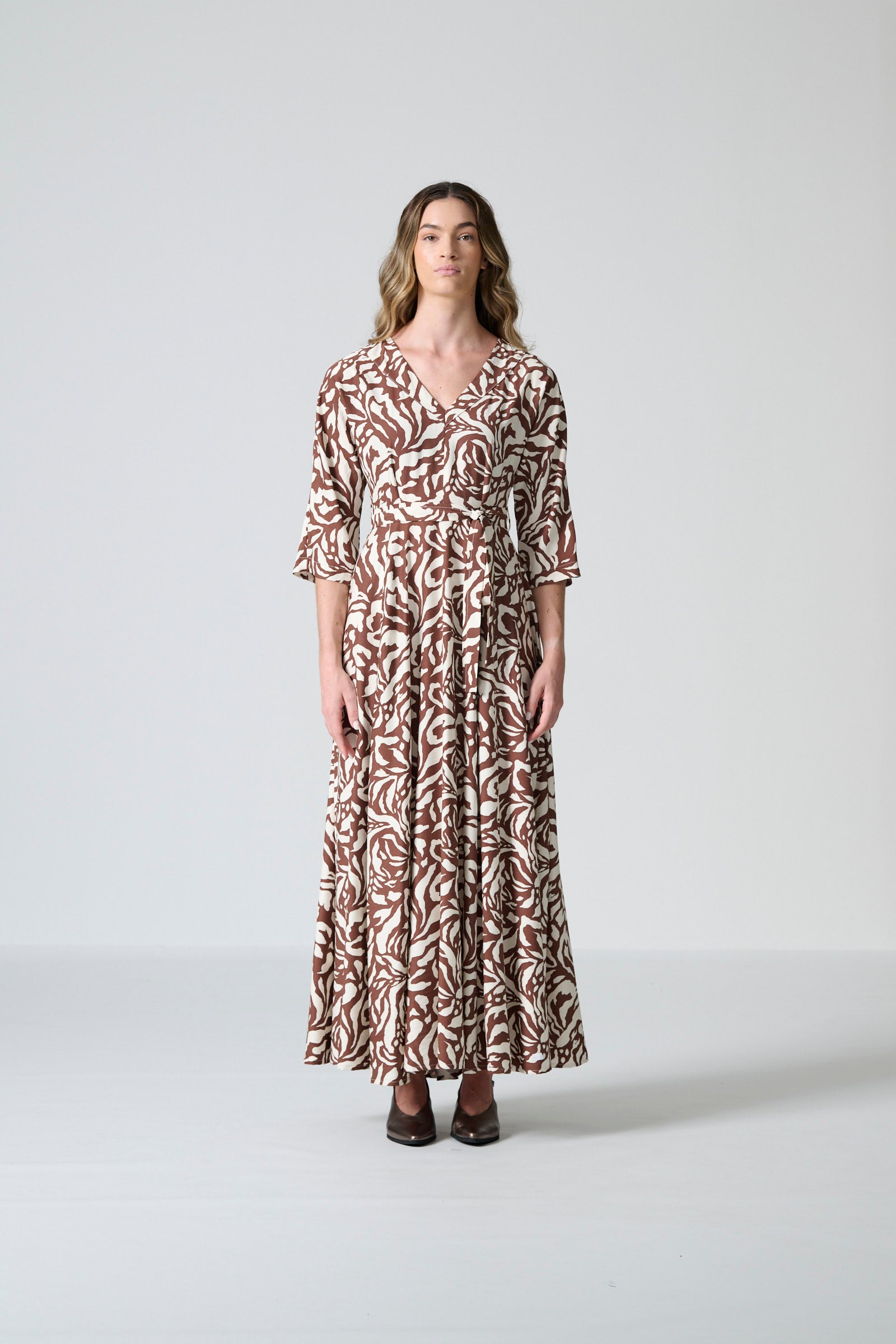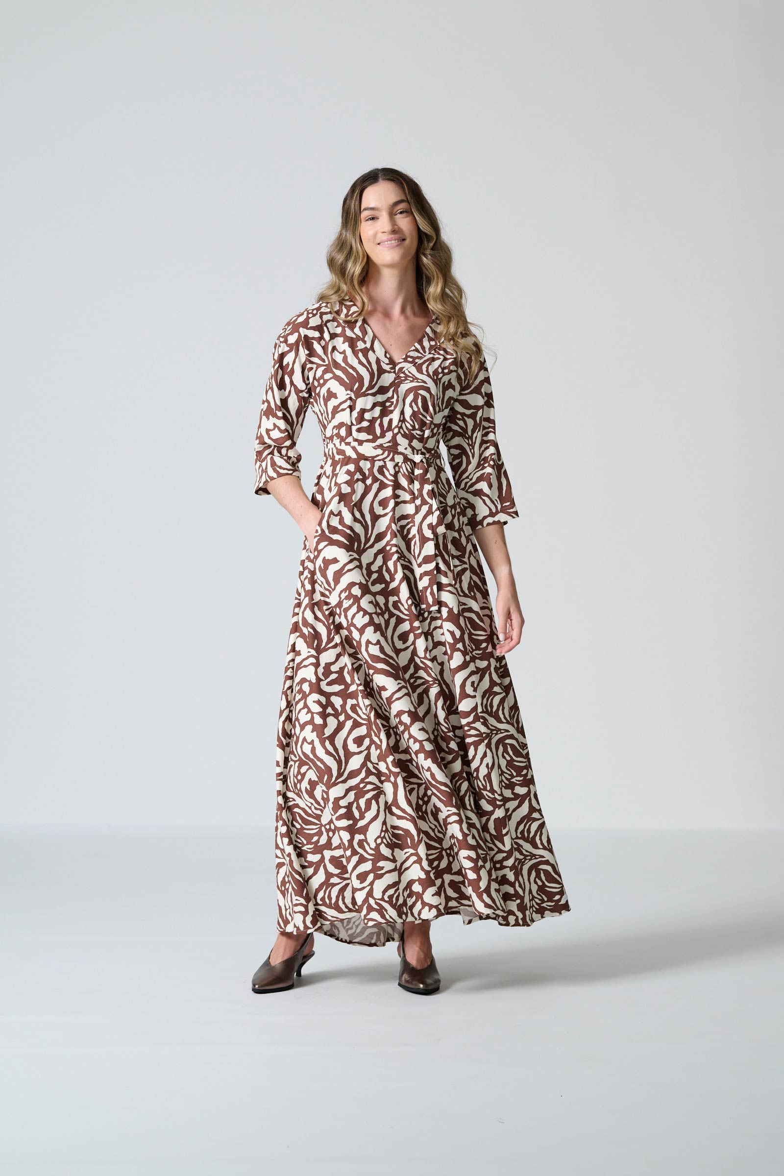 The Rome dress in brown and cream monotone print offers effortless elegance with a beautifully fluid silhouette. Designed with a flattering V neckline and a flowing maxi-length skirt, it creates graceful movement while maintaining a refined, timeless shape. The three-quarter all-in-one sleeves add soft structure, and the self-tie belt allows you to define the waist for a personalised fit. Inseam pockets bring subtle practicality, and a centre-back zip ensures a smooth, comfortable finish.