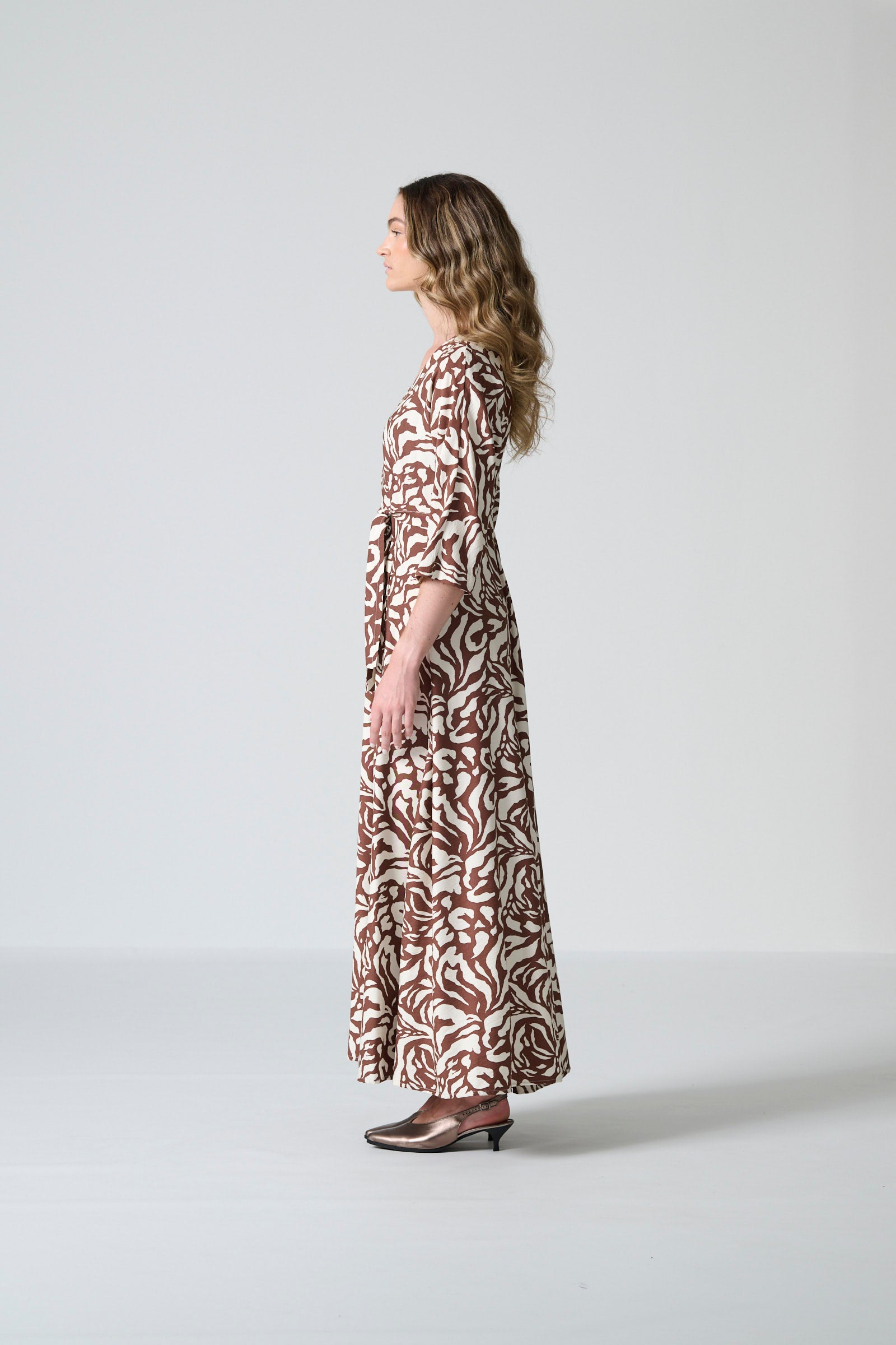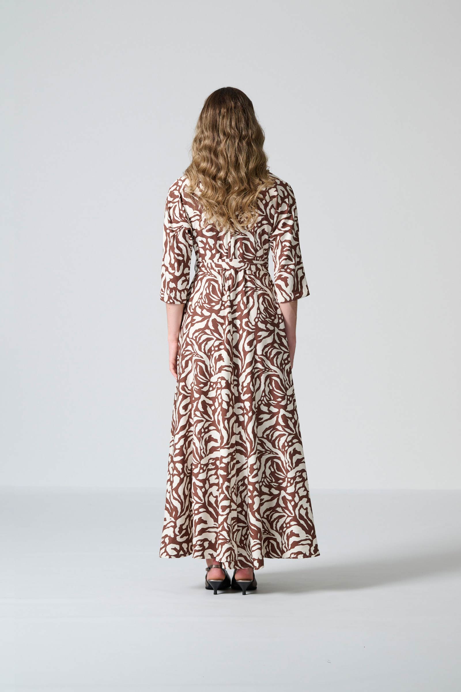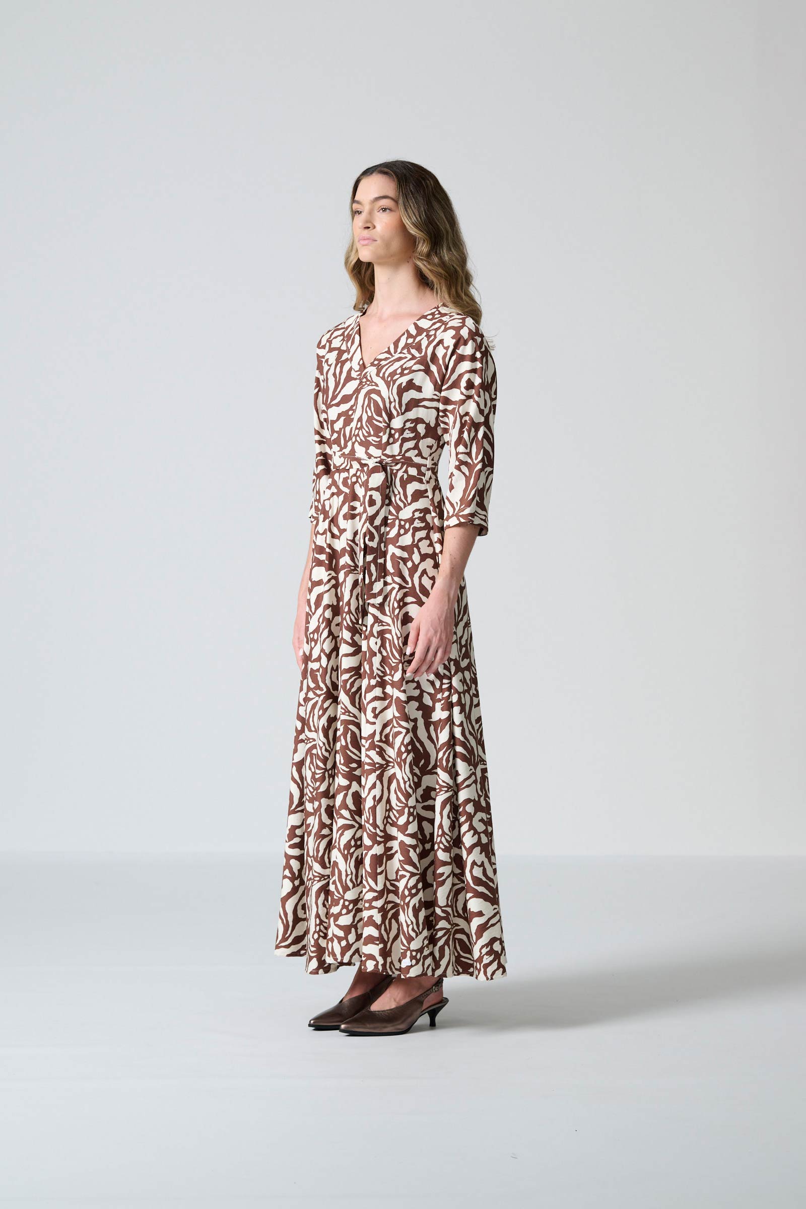 The Rome dress in brown and cream monotone print offers effortless elegance with a beautifully fluid silhouette. Designed with a flattering V neckline and a flowing maxi-length skirt, it creates graceful movement while maintaining a refined, timeless shape. The three-quarter all-in-one sleeves add soft structure, and the self-tie belt allows you to define the waist for a personalised fit. Inseam pockets bring subtle practicality, and a centre-back zip ensures a smooth, comfortable finish.