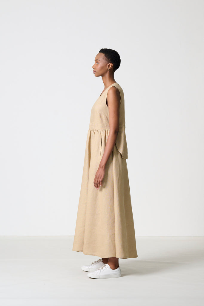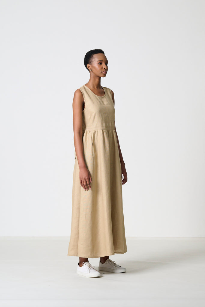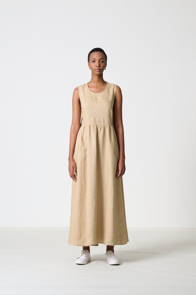 The Starlight is a feminine maxi dress with a round neckline, sleeveless design, and a softly gathered waistline. The elasticated back ensures comfort and shape, while the back bodice flap adds subtle movement and detail. Designed for effortless wear and timeless ease.