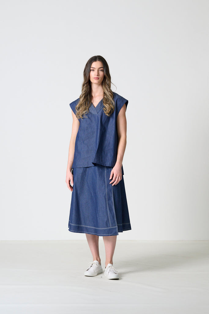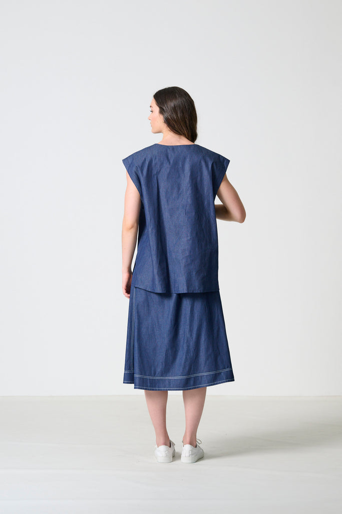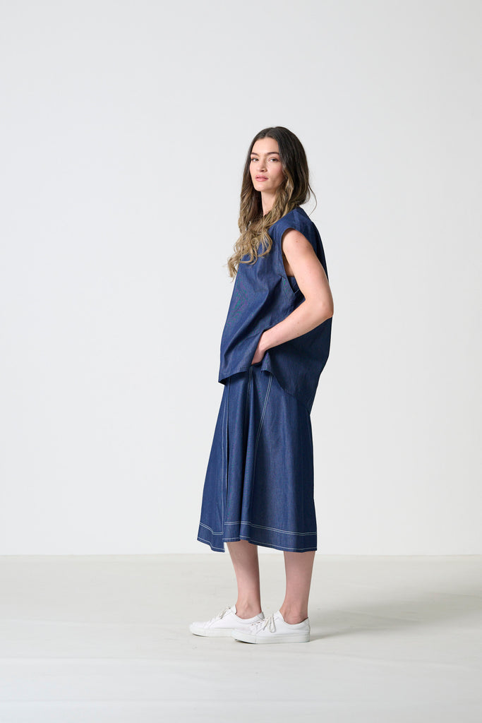 Sundial is a loose-fitting camisole top designed for effortless layering and everyday ease. With a flattering v-neckline, subtle stitching detail, and grown-on sleeves, it balances simplicity with thoughtful design. Side slits add movement and a relaxed drape, while the lightweight indigo denim in 100% cotton brings a soft structure that pairs beautifully with both skirts and trousers. Available in sizes 32–46, Sundial is a versatile staple that transitions seamlessly across seasons.