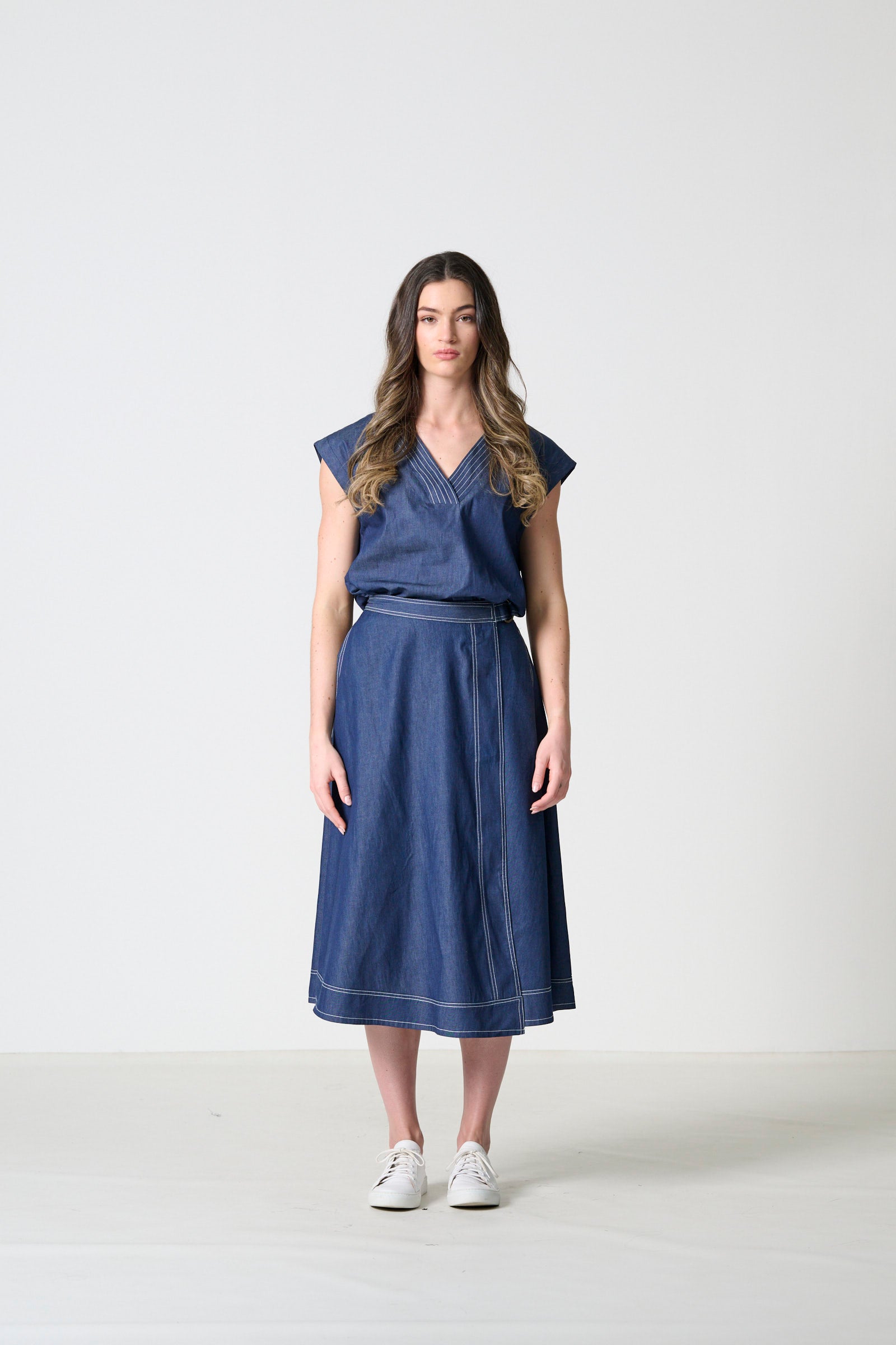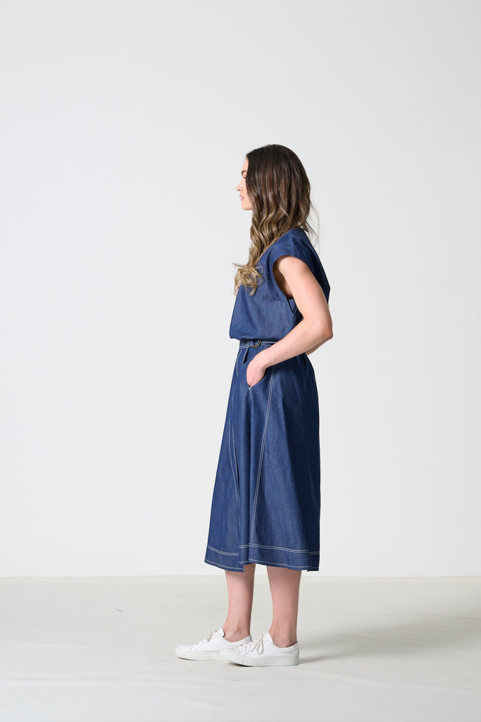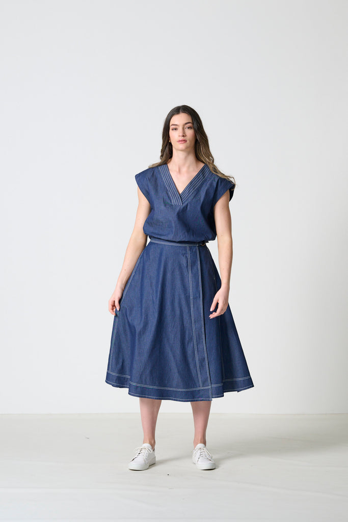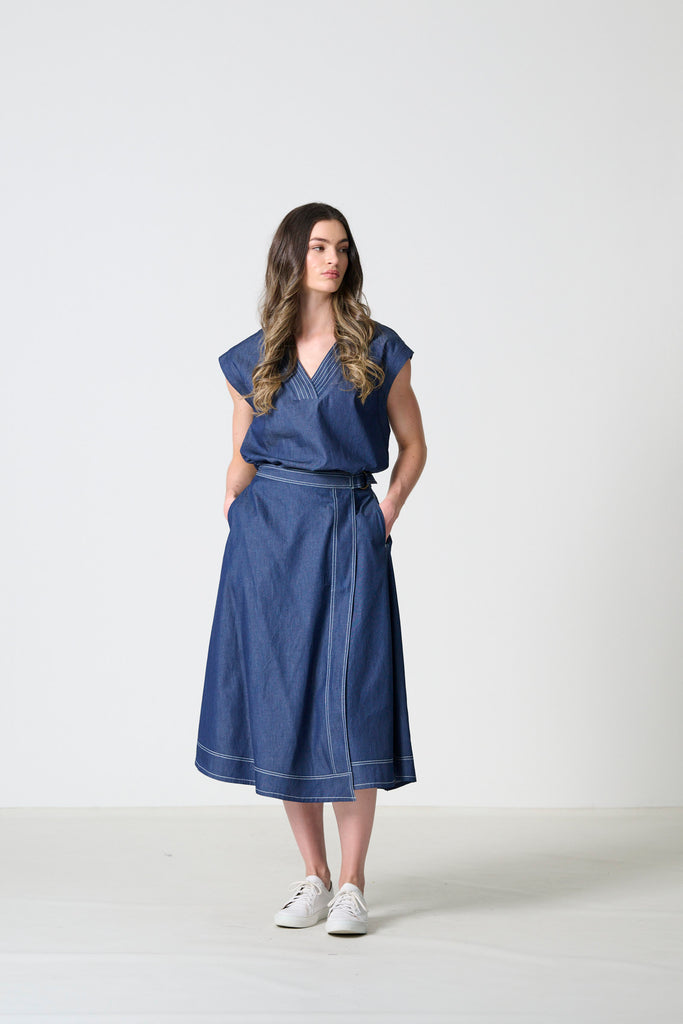 Thaba is an A-line wrap skirt designed with a balance of structure and ease. The silhouette is shaped by clean stitching detail and a self-tie belt that allows for an adjustable fit. Side entry pockets bring everyday practicality, while the indigo lightweight denim in 100% cotton gives the skirt a modern, versatile edge. Available in sizes 32–46, Thaba is a timeless piece that pairs effortlessly with both relaxed and refined styling.