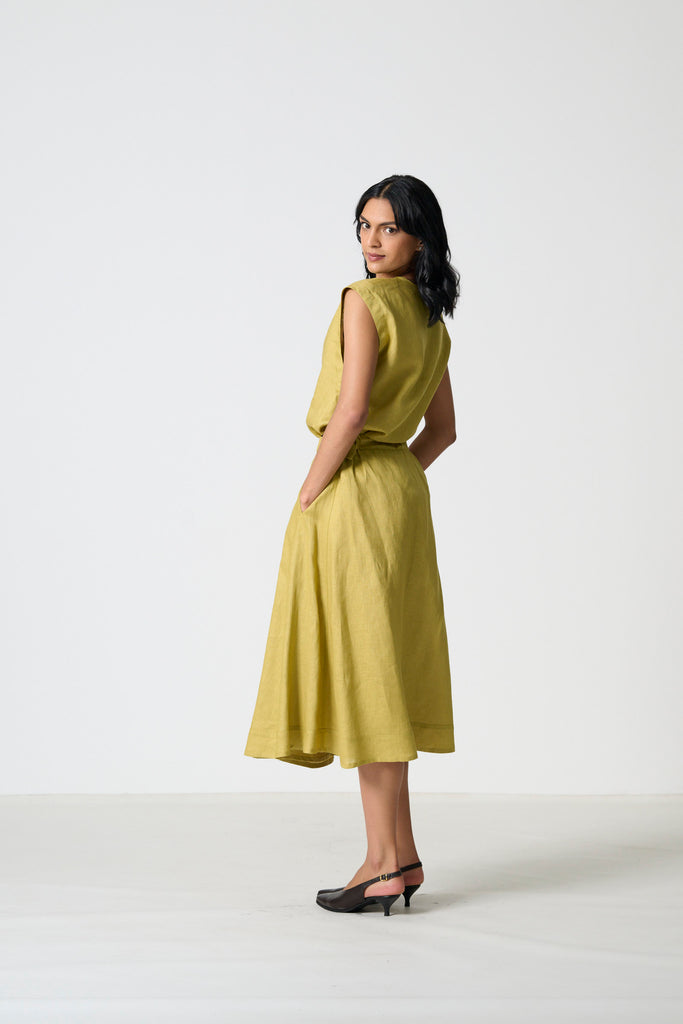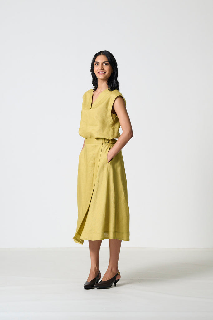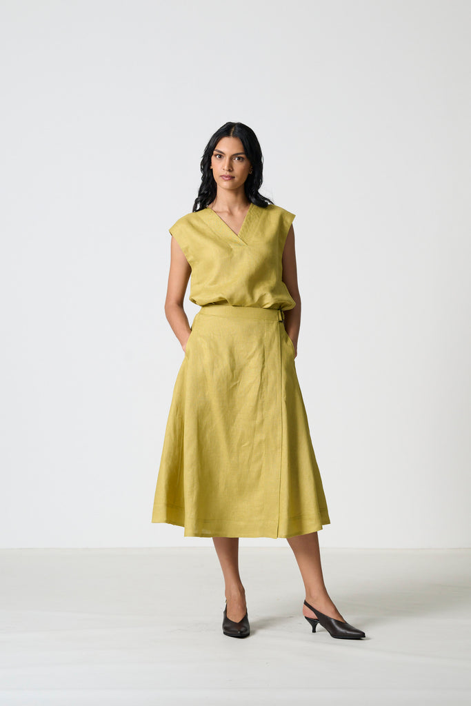 Thaba is an A-line wrap skirt designed with a balance of structure and ease. The silhouette is shaped by clean stitching detail and a self-tie belt that allows for an adjustable fit. Side entry pockets bring everyday practicality, while the chartreuse slub weave in 100% linen creates a light, breathable finish perfect for warmer days. Available in sizes 32–46, Thaba is a timeless piece that pairs effortlessly with both relaxed and refined styling.