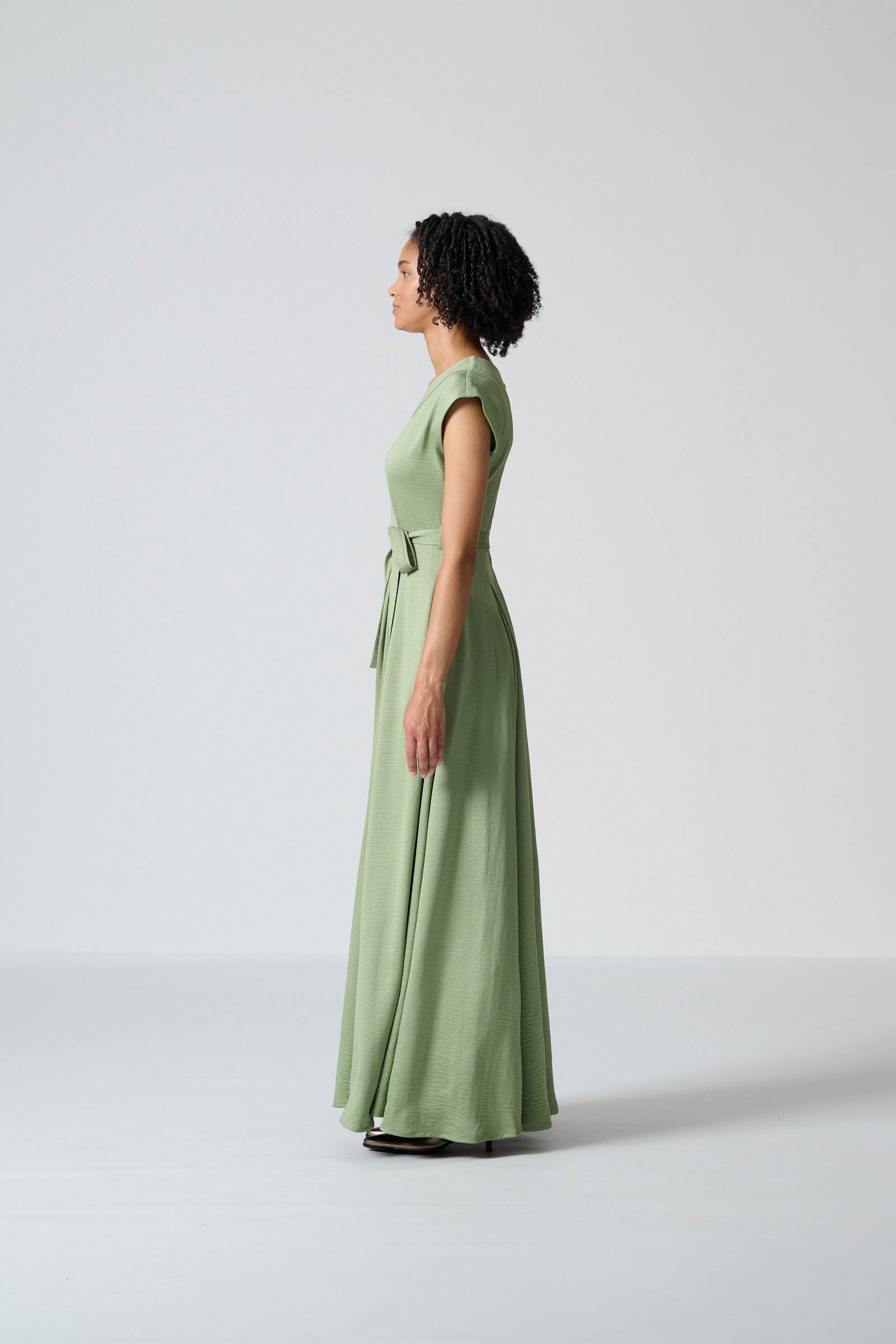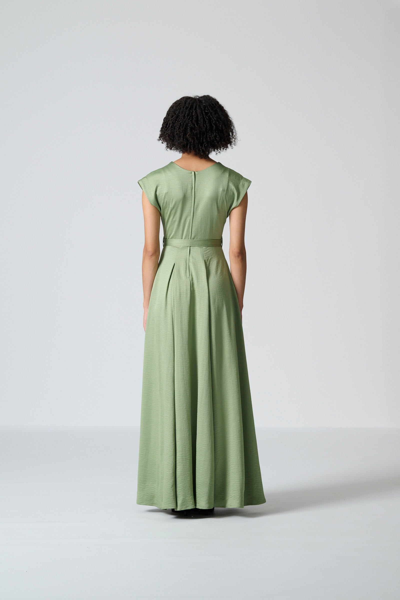 The Thabitha dress in mint green cyber satin brings a fresh, elegant touch to a classic maxi silhouette. Featuring a flattering V neckline and a flowing full-length skirt, it creates graceful movement with effortless ease. The all-in-one sleeves add soft structure, while the self-tie belt allows you to shape the waist to your preference. Inseam pockets provide subtle practicality, and a centre-back zip ensures a smooth, comfortable fit.