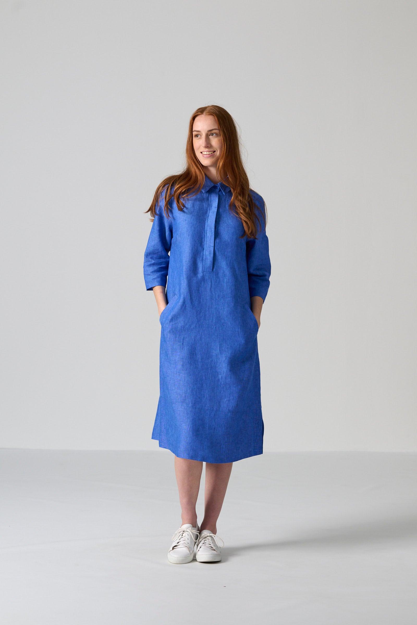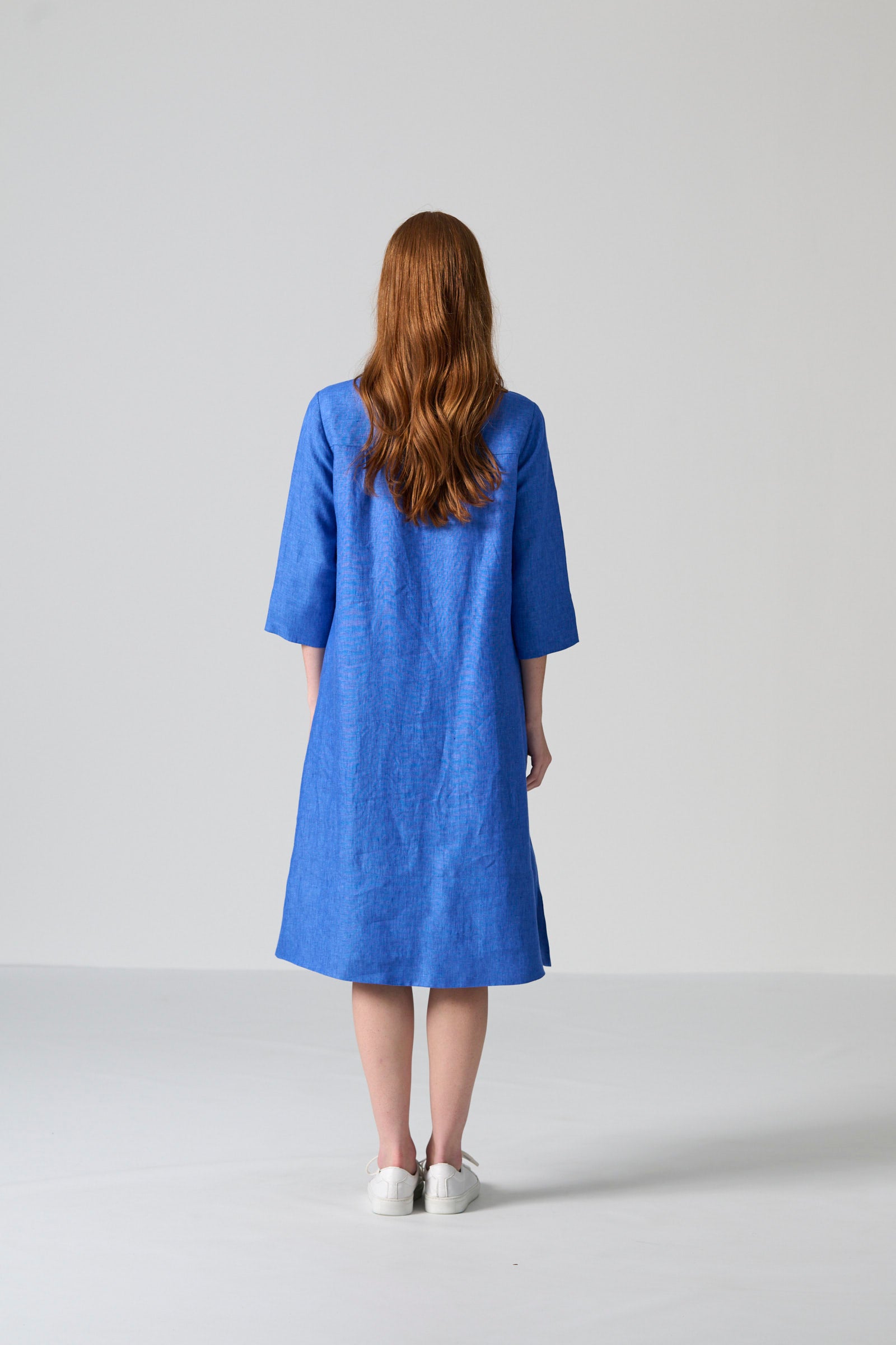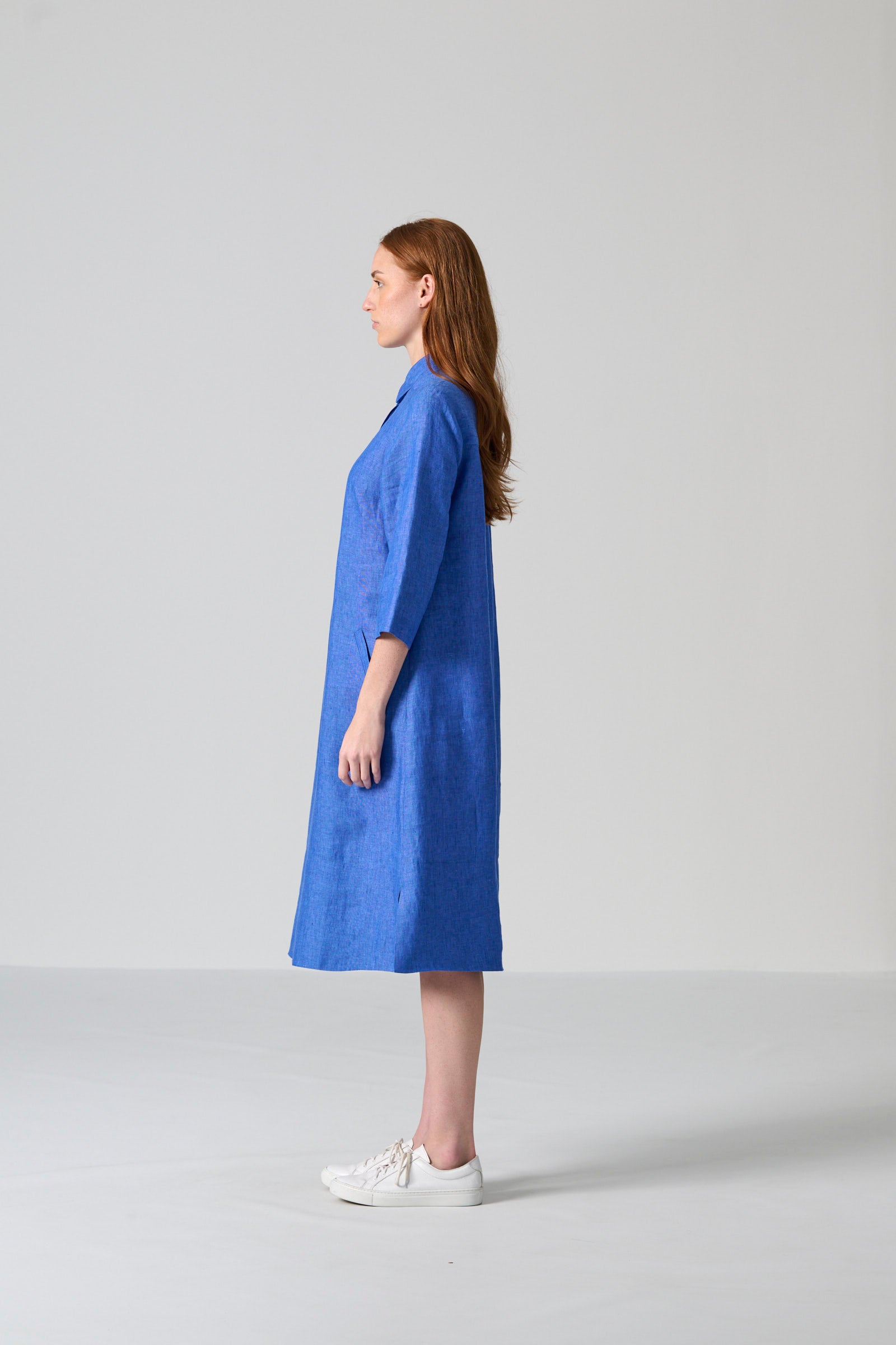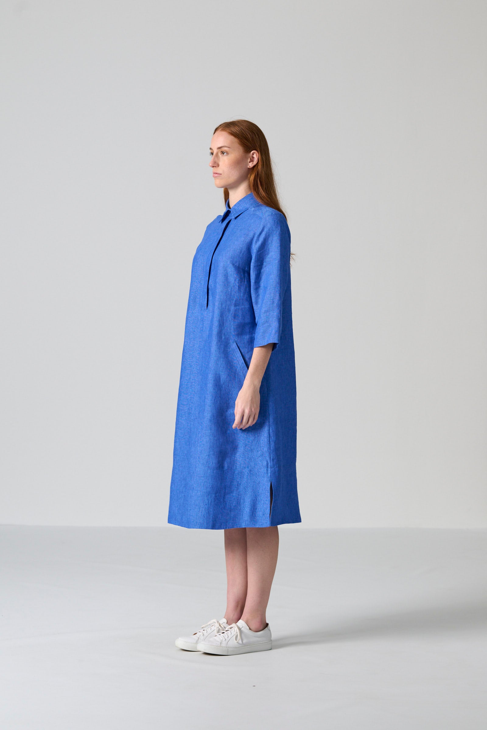 The Zinhle dress in blue chambray slub weave brings effortless refinement to everyday dressing. This knee-length tunic silhouette features a classic collar, three-quarter sleeves and a button-front placket for a clean, relaxed finish. Side slits and a wide hem allow for easy movement, while side-entry pockets offer practical functionality.