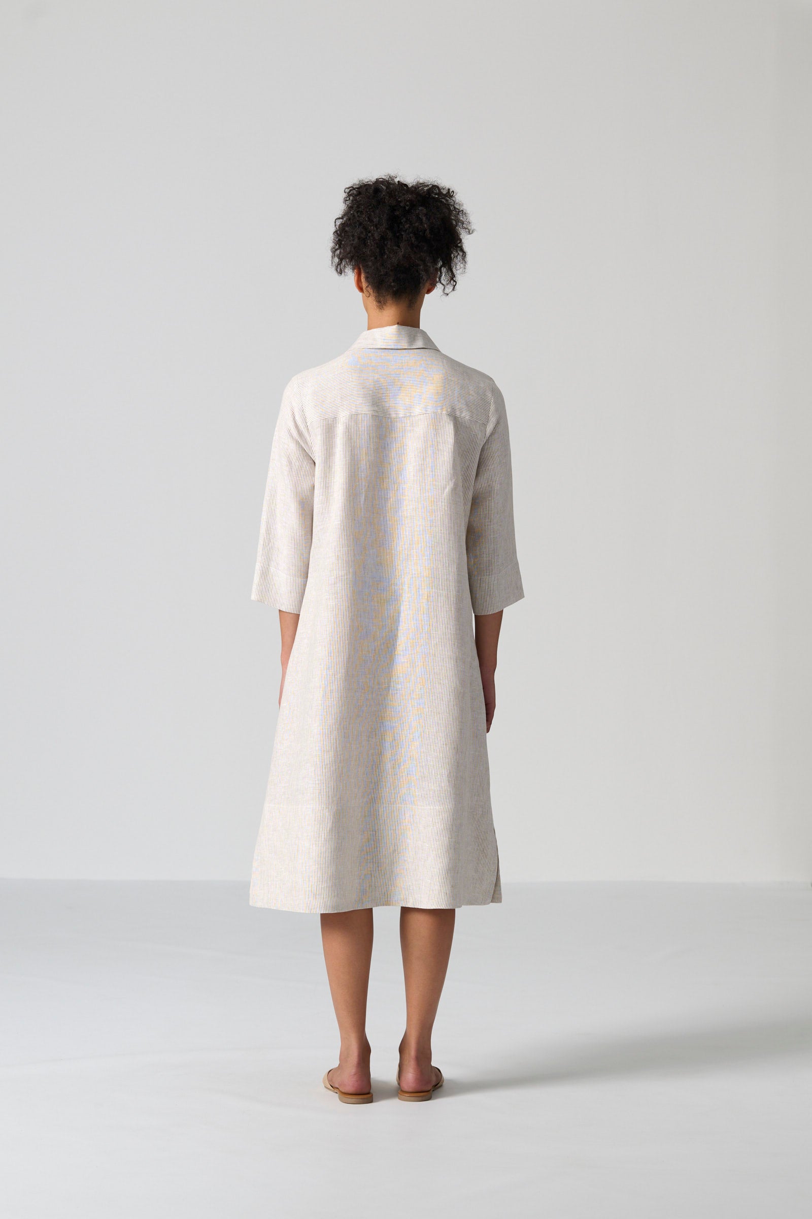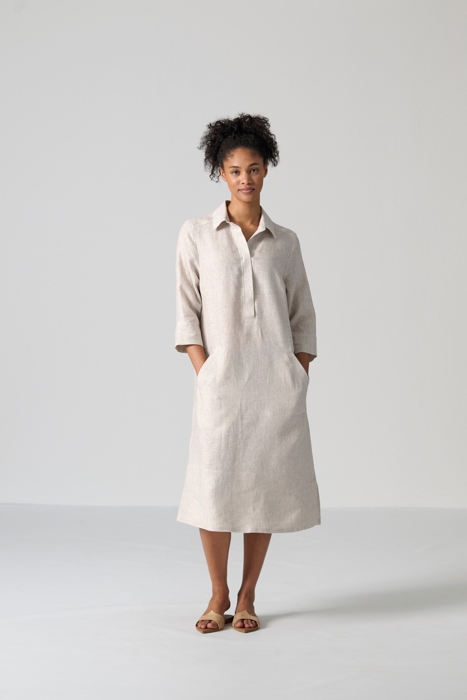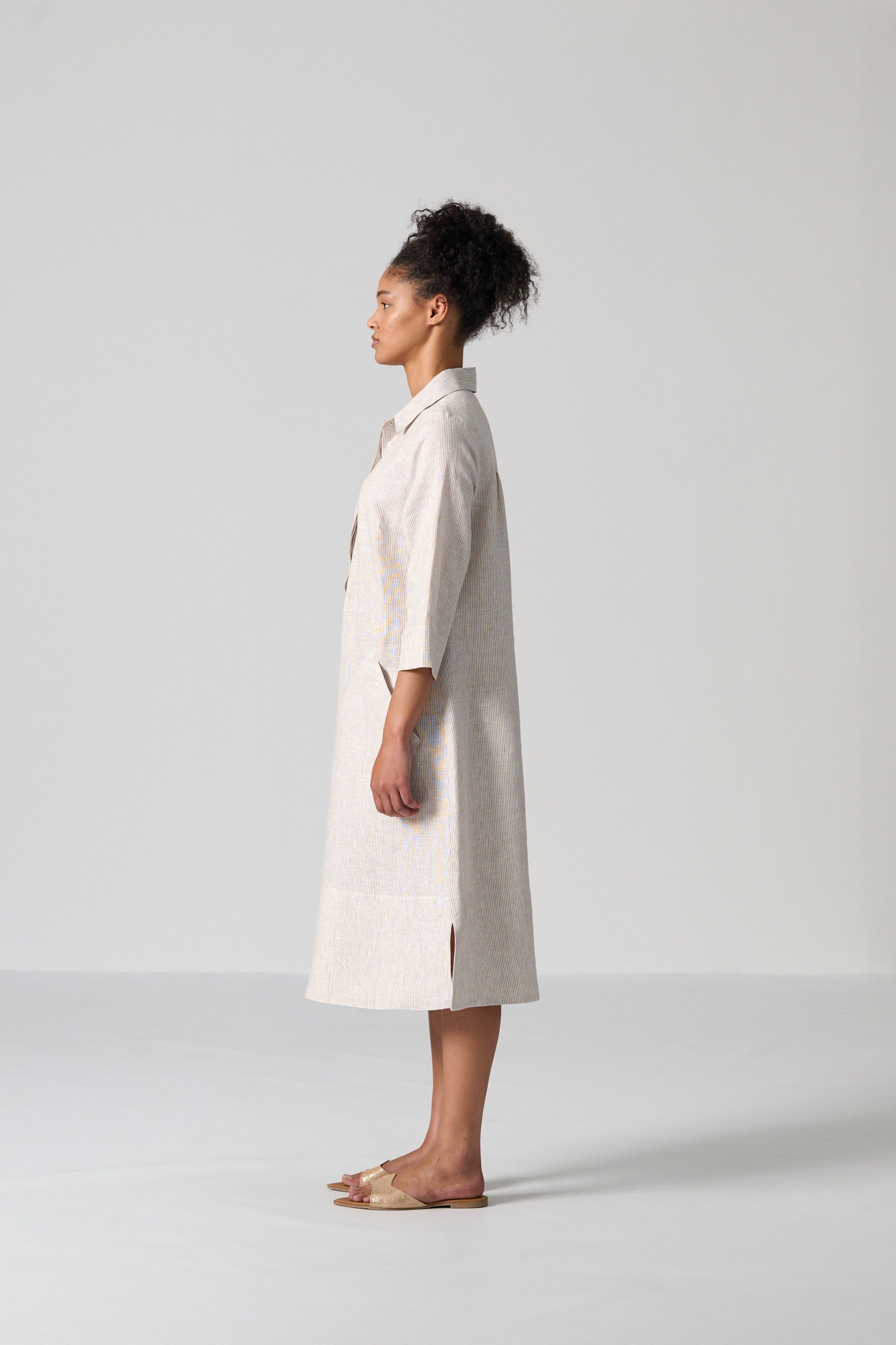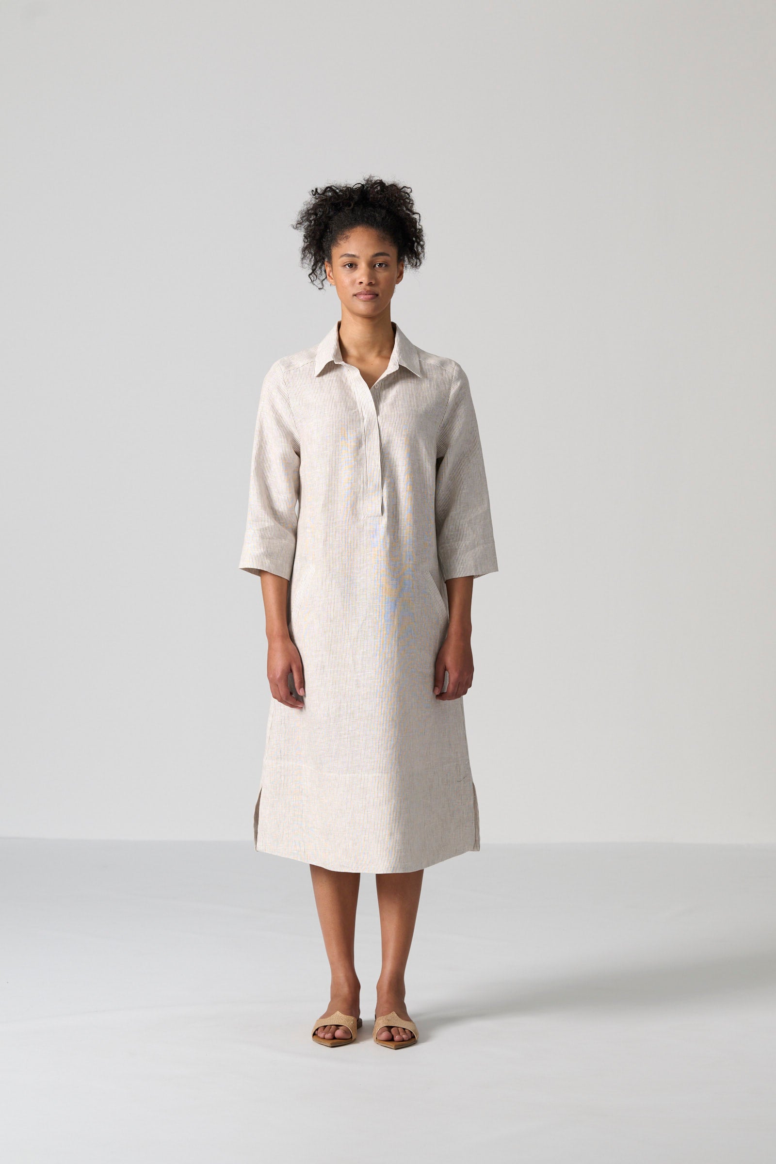 The Zinhle dress in natural and white yarn-dyed stripe combines timeless sophistication with relaxed ease. This knee-length tunic dress features a classic collar, three-quarter sleeves, and a button-front placket for a polished finish. Side slits and a wide hem create effortless movement, while side-entry pockets add practical functionality.