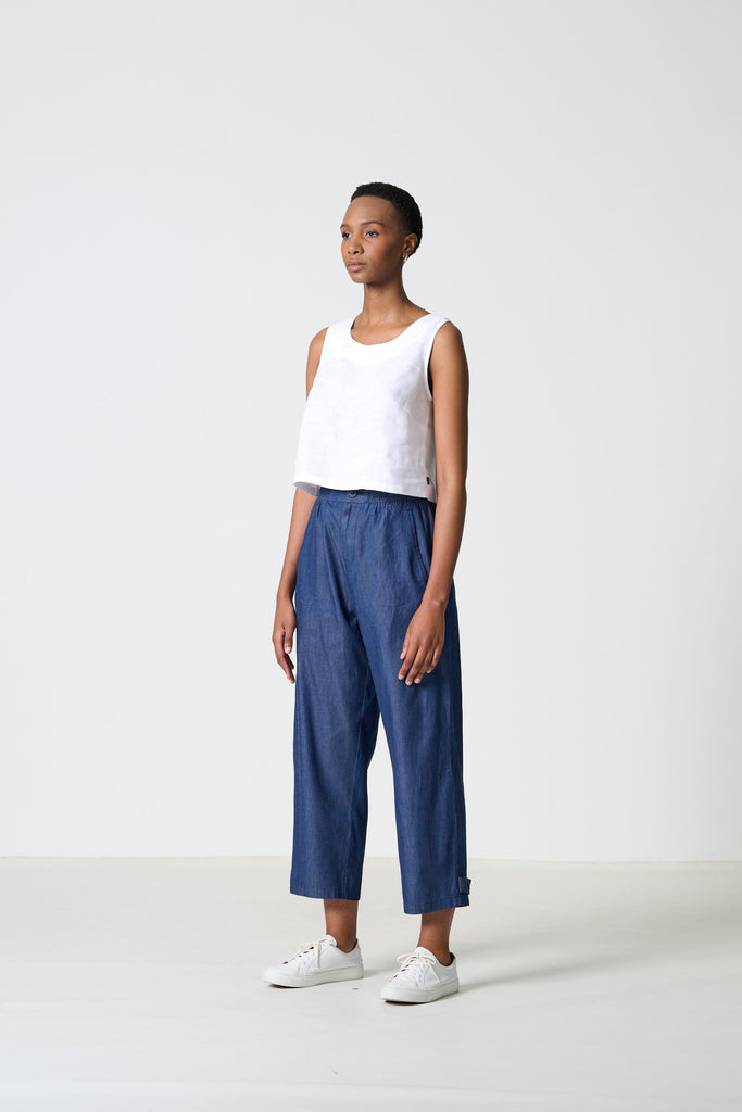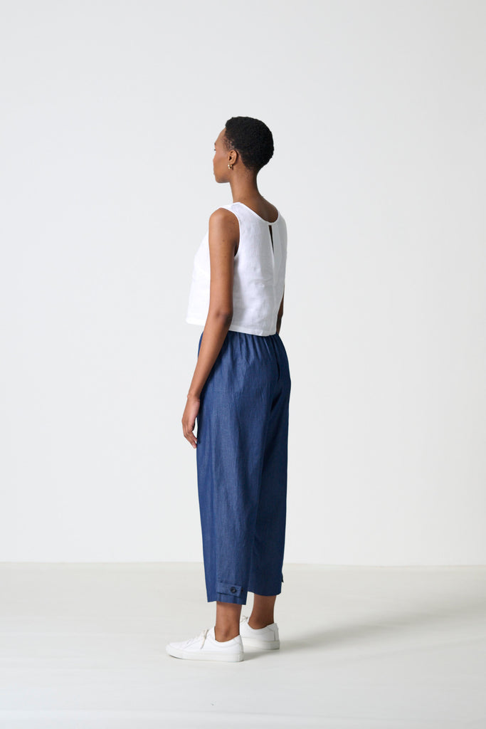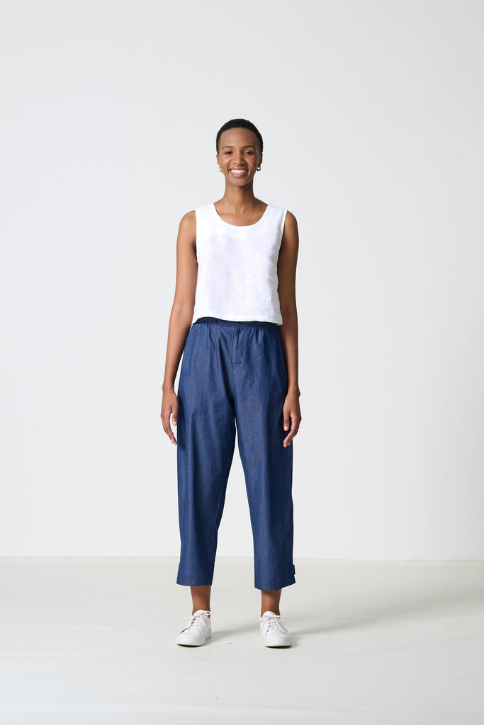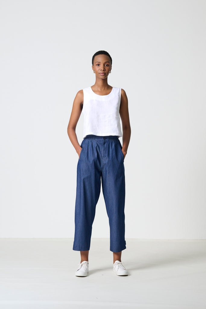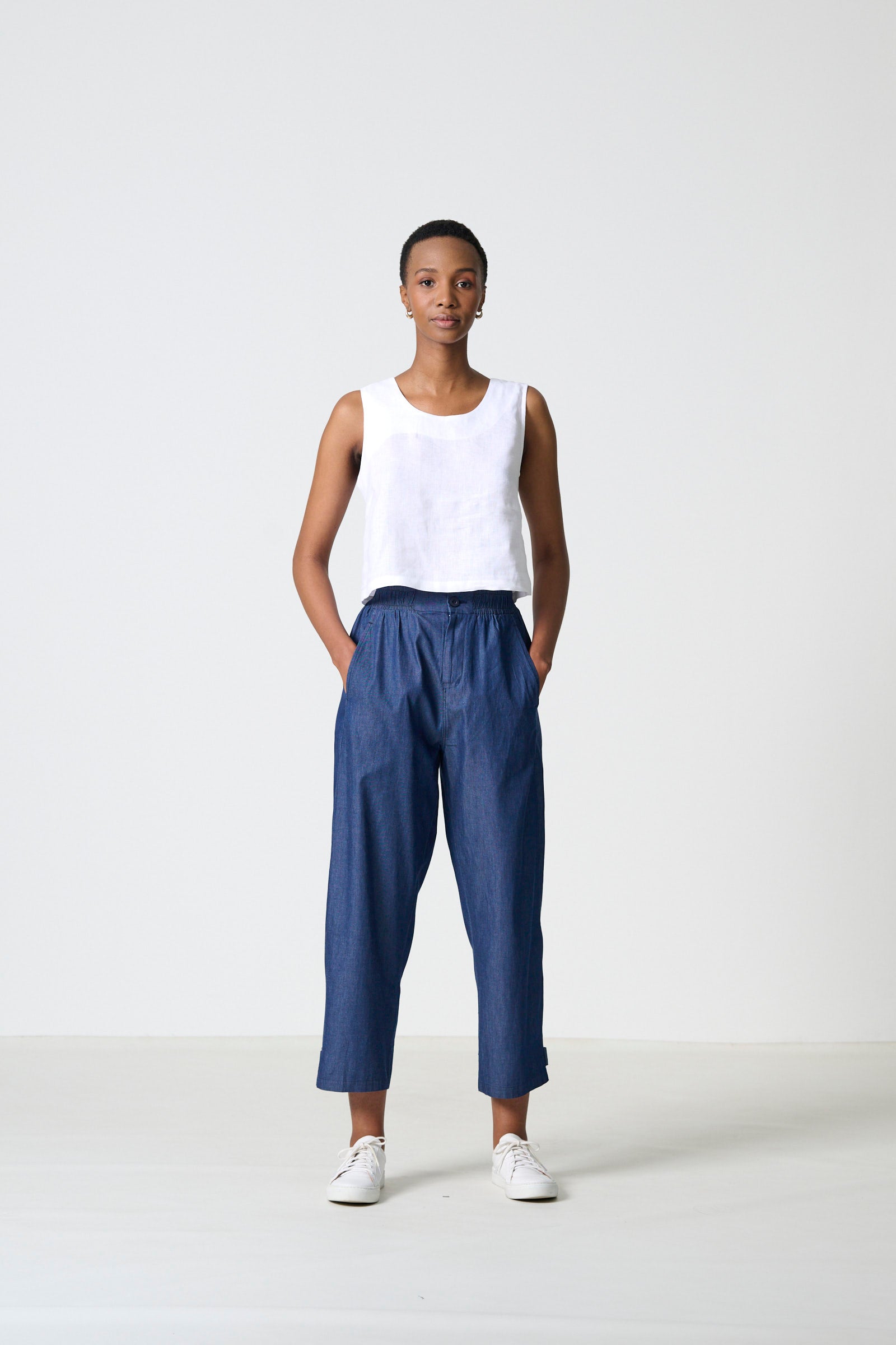 Stride is a versatile pant designed for movement and ease. With a relaxed silhouette, it can be styled to suit your personal shape and comfort. The elasticated waistband and adjustable back hem allow a tailored fit while keeping a laid-back, effortless look. Structured yet soft, the indigo denim cotton gives Stride a casual, workwear-inspired edge, perfect for everyday versatility.